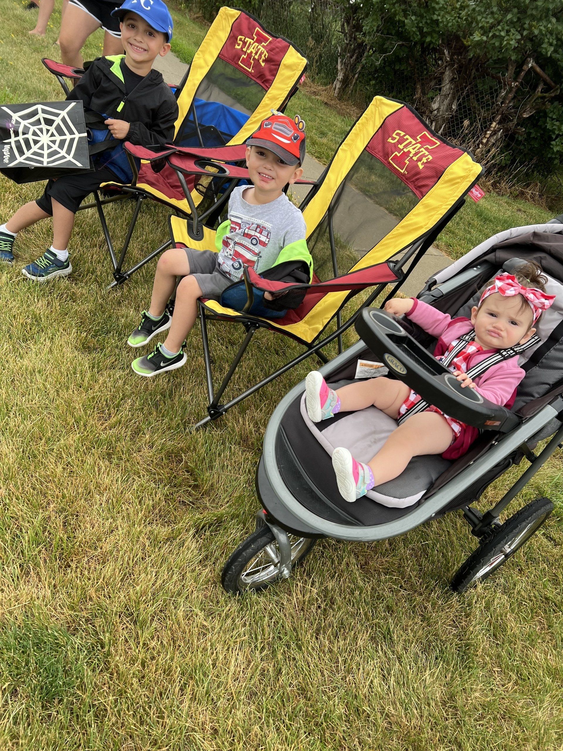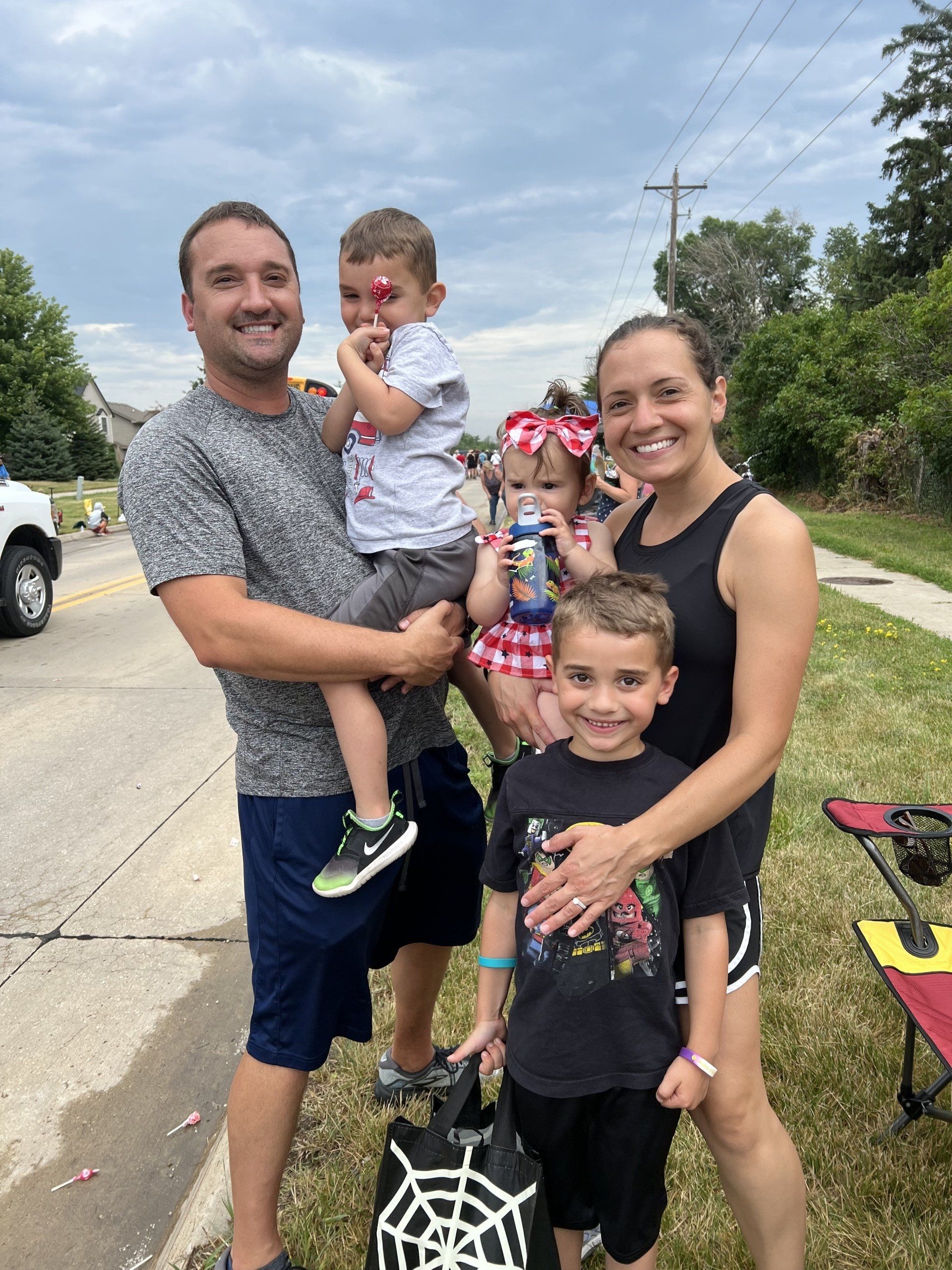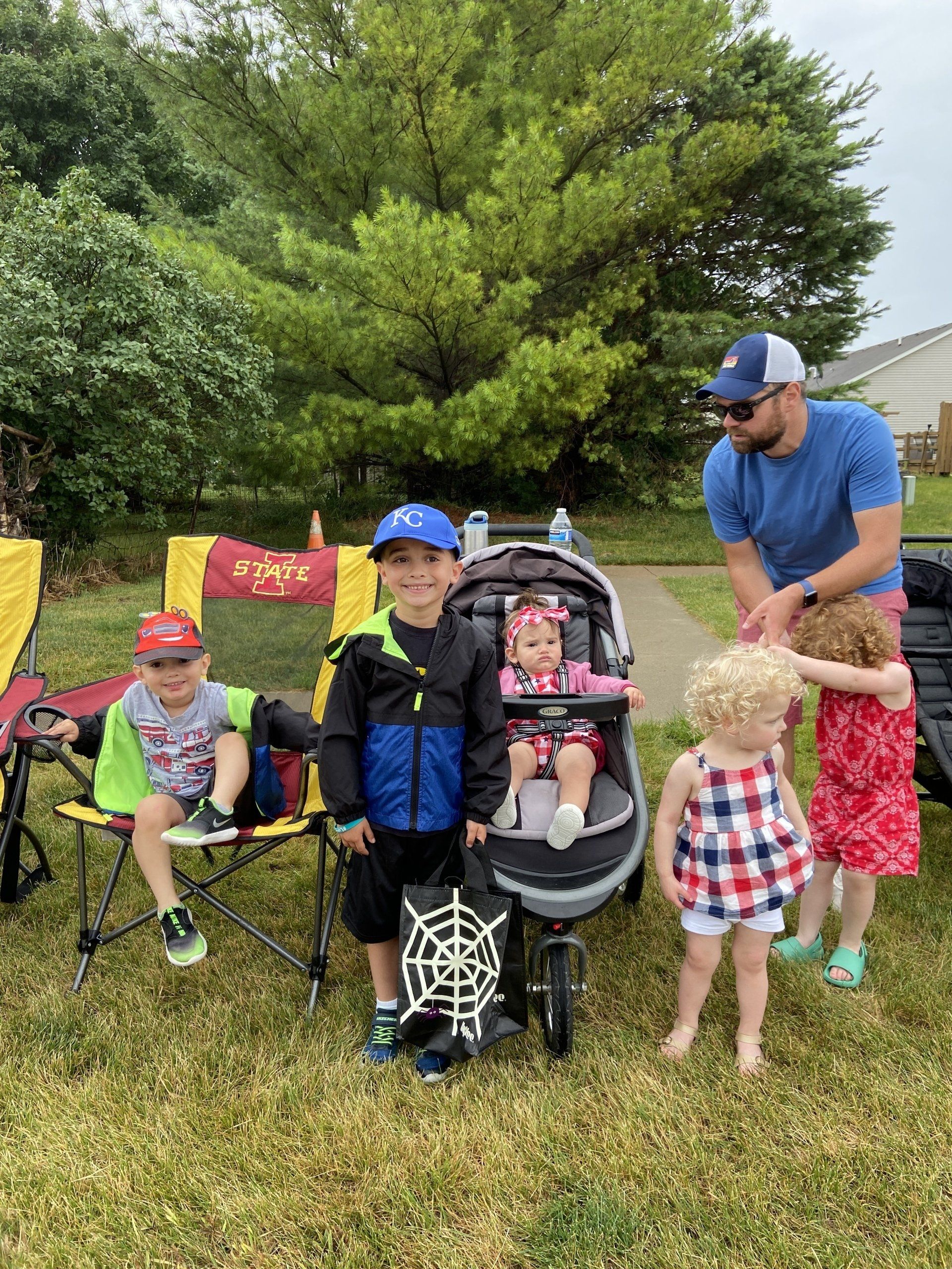 We had a fun and eventful 4th of July. Greg's mom came down the 3rd and went to the WDM parade and we went to the Waukee parade on the 4th! The kids all got a lot of candy :). Grandma spent the night and the morning of the 4th the boys went down to wake her up and Blake fell off the bed and his bottom teeth went through his bottom lip. Claire had 2 more incidences of a blotchy, red rash on her face. We ended up taking her into the allergist again and we think it is just her rubbing her eyes while eating and her sensitive eyes. She has been tested twice and no allergies to food.