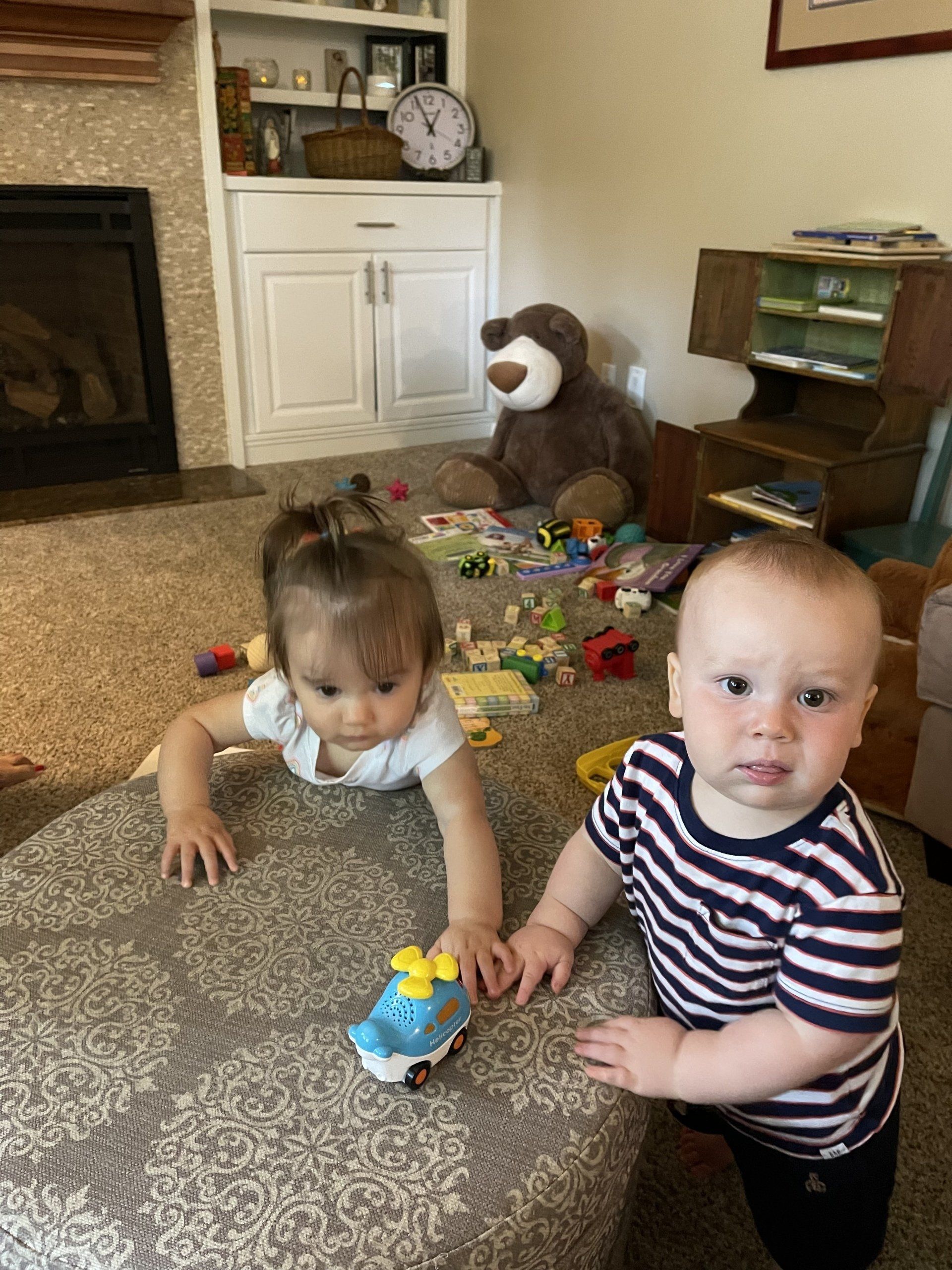 My Mom, Nana, is still watching Claire. She loves it! We won't be able to get Claire into daycare until November at the earliest so Nana gets some extra time with her! Nana's neighbor, Connie, watches her grandson, Mack, part time also. Claire and Mack have play dates sometimes and I get the cutest pictures from them!