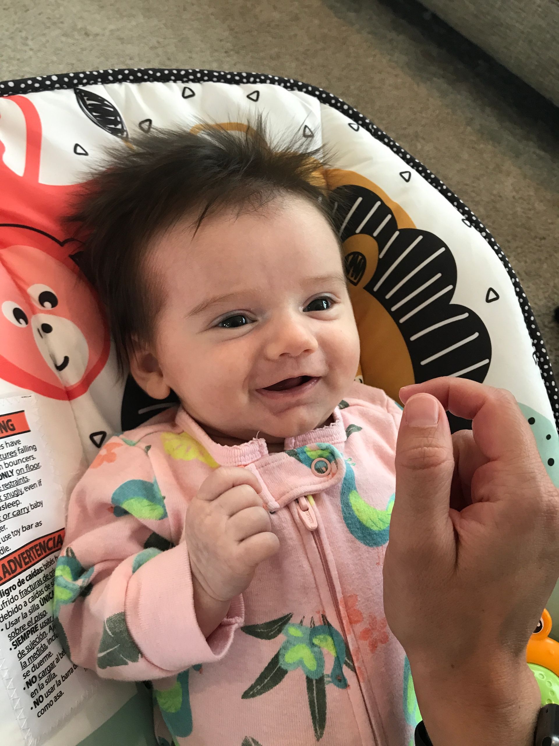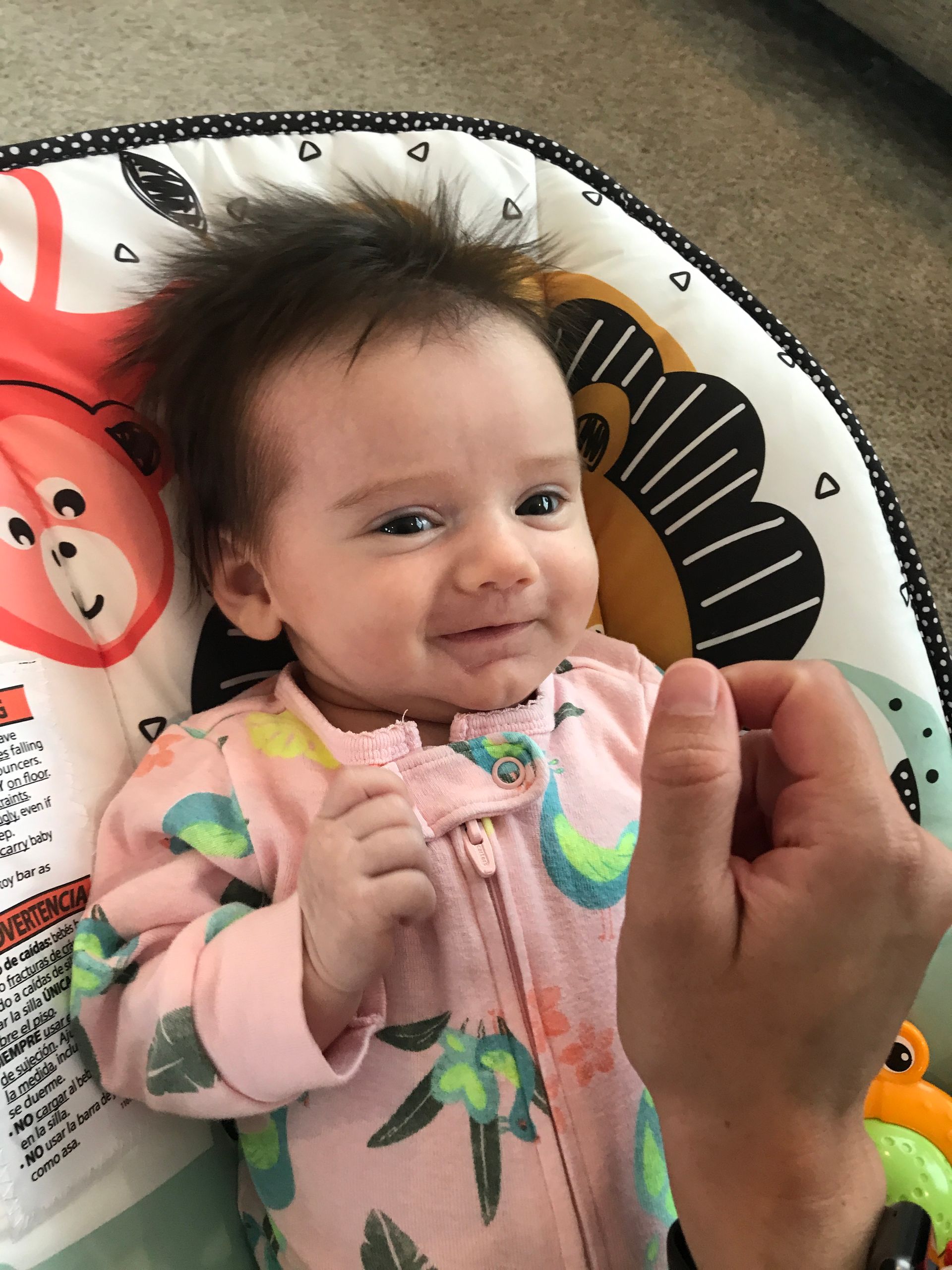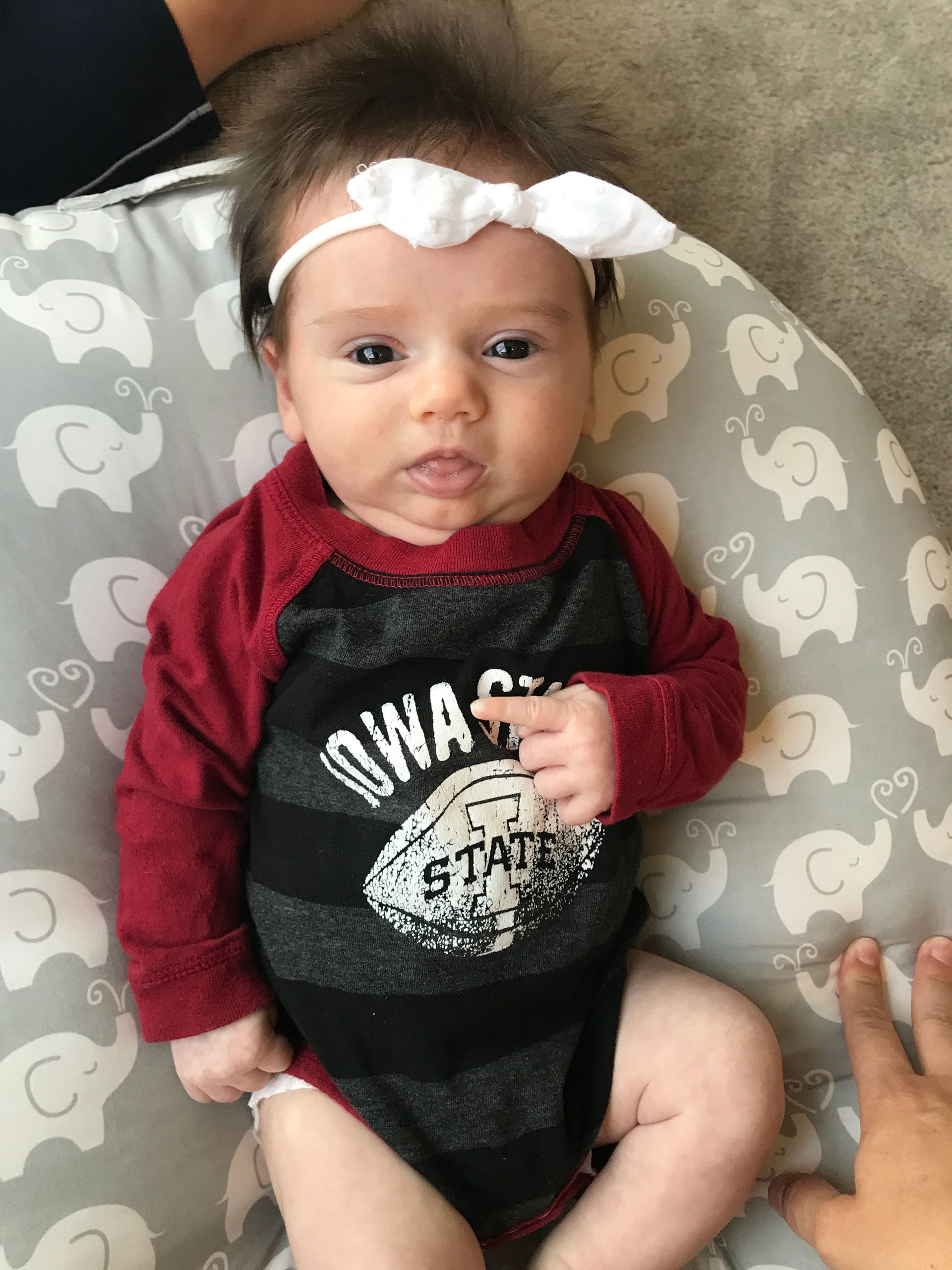 The biggest thing this month was Claire starting to smile! We can't get enough! She weighs about 12lbs 7.5 oz. She is still sleeping well but we have her in her rock n play still. We will try to get her out of that soon but it is so nice that she sleeps so well in it! It was a fun month with Claire!