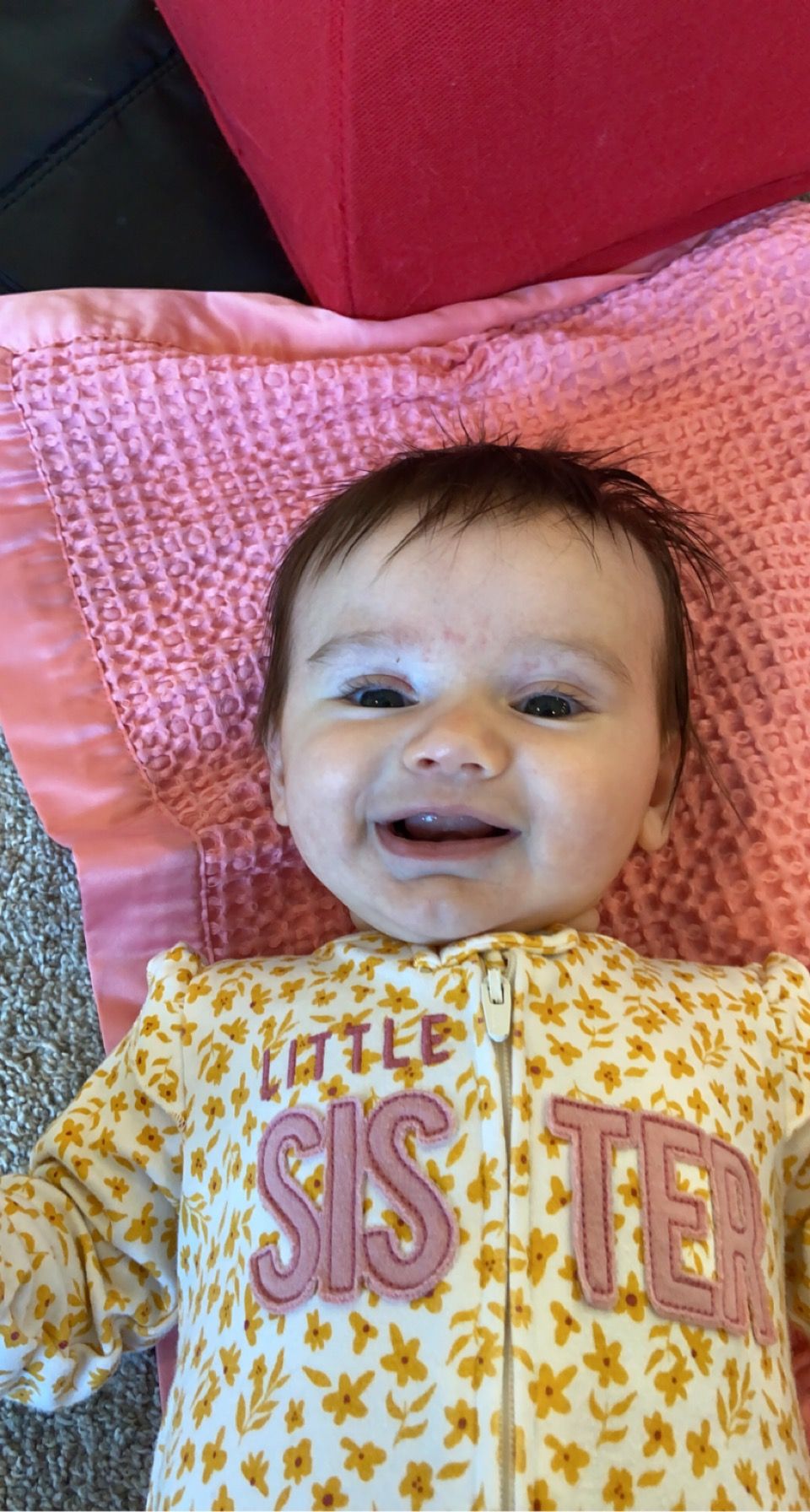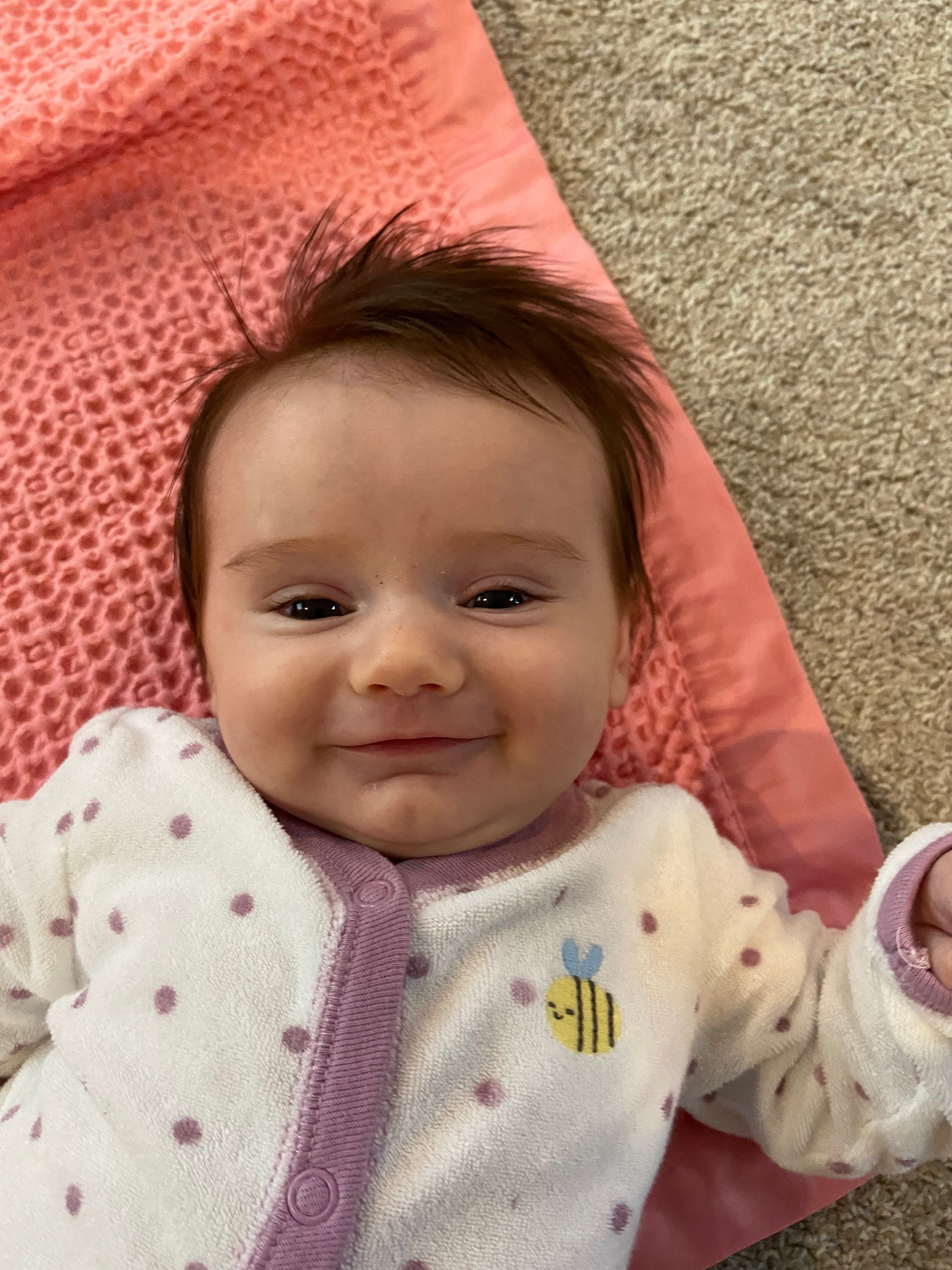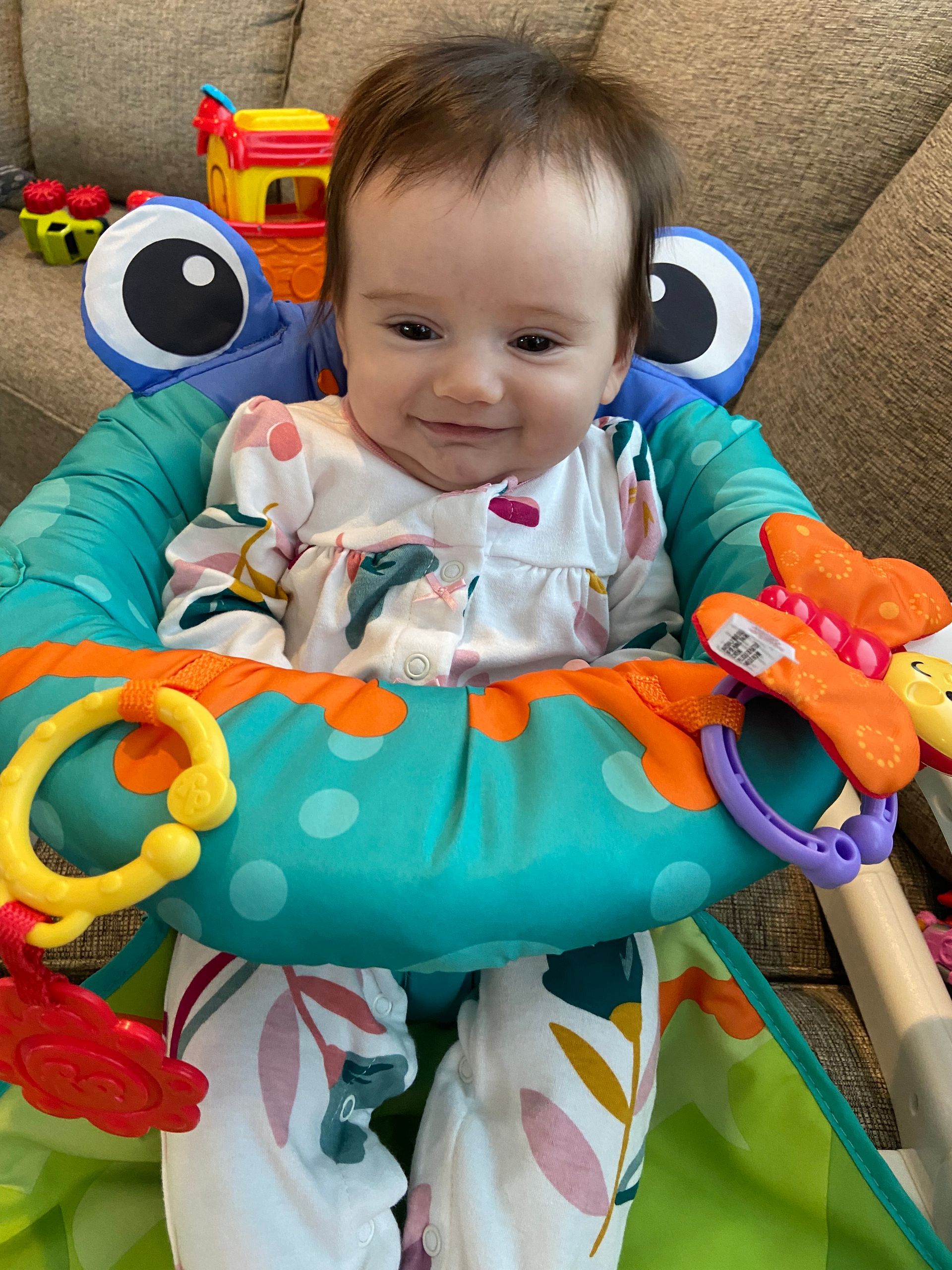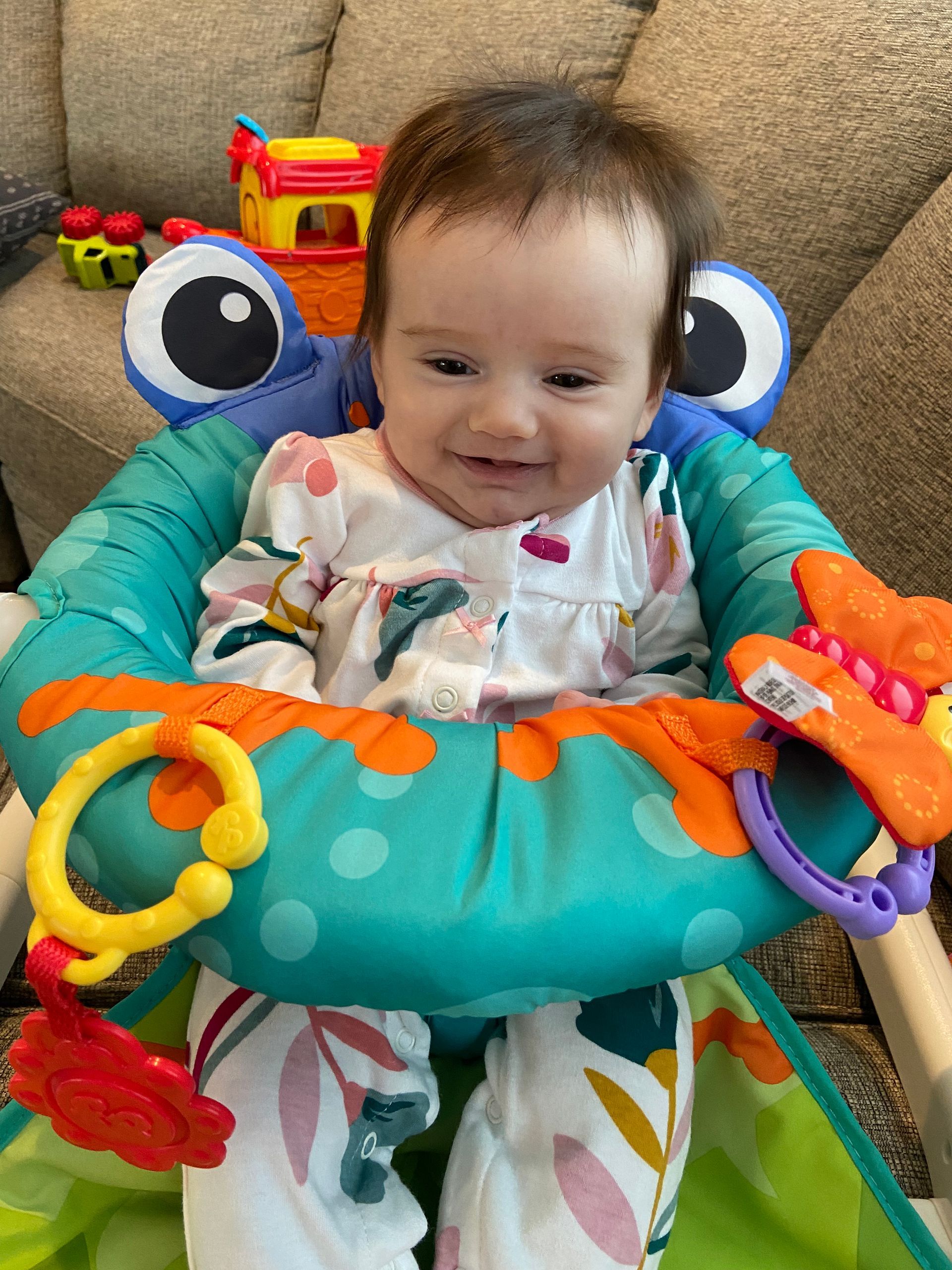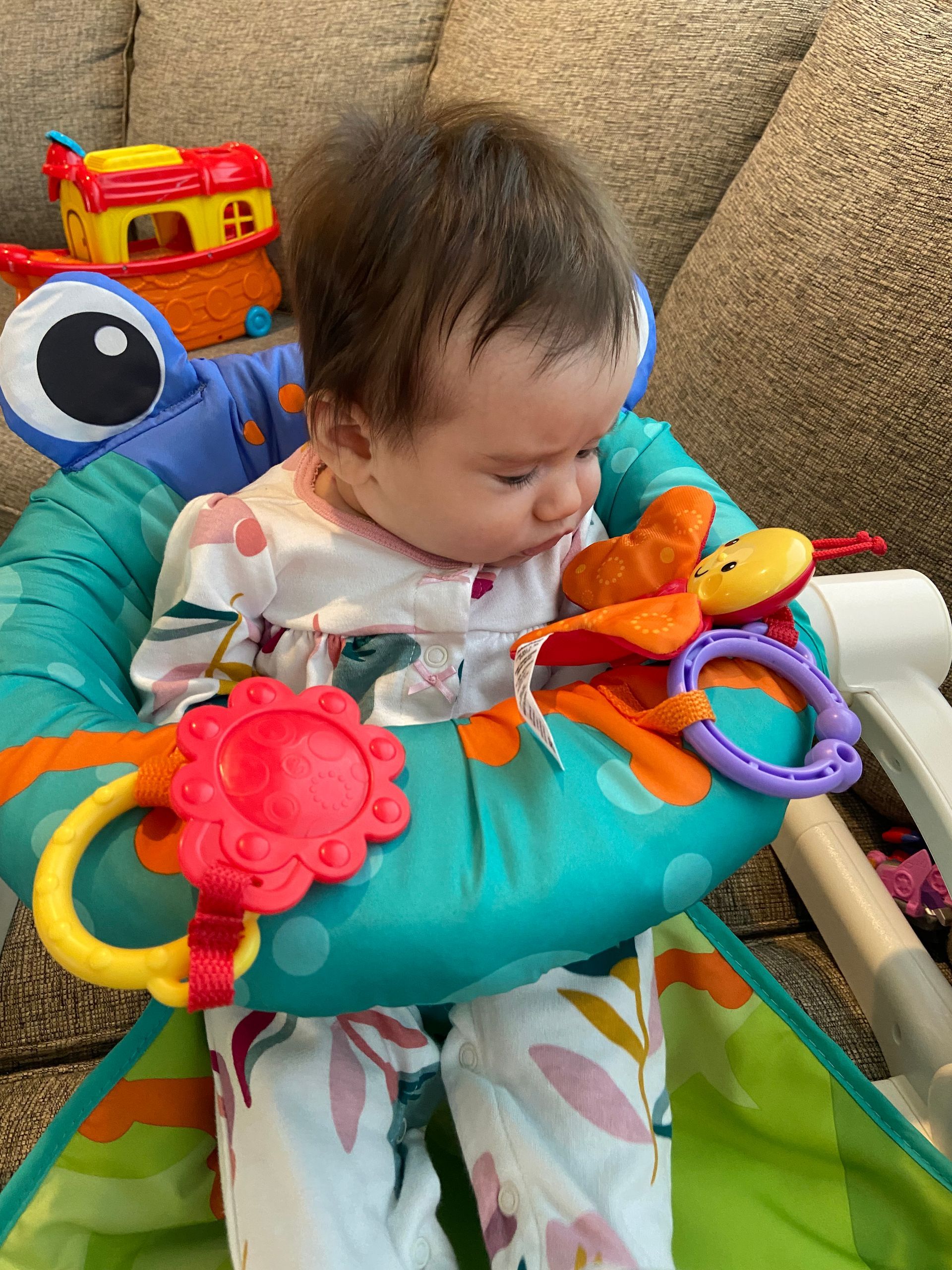 We put Claire in her sit-me-up chair for the first time and she loved sitting up and seeing more. She was intrigued with the bee and toys on the chair.