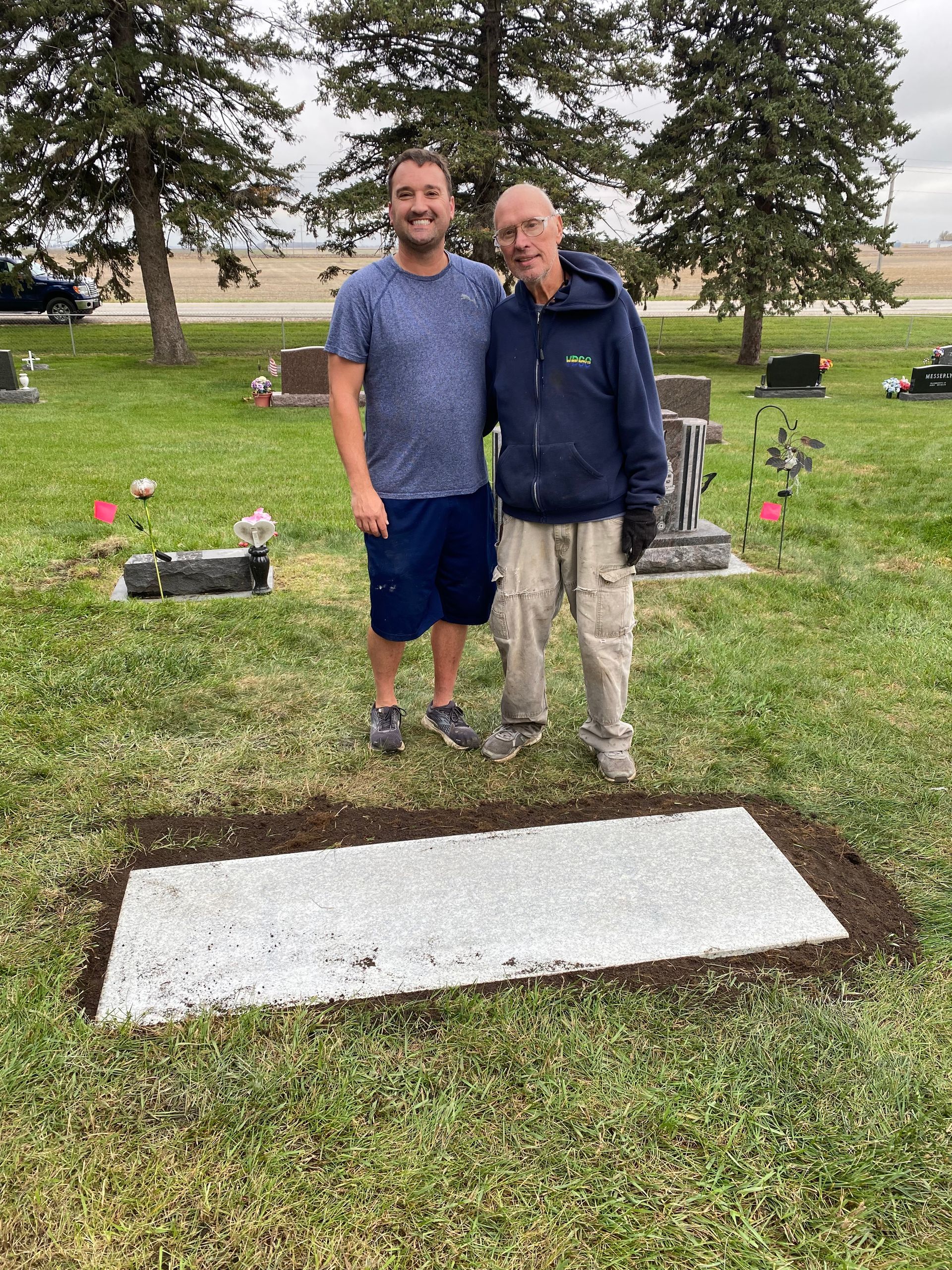 Grandpa really wanted to get his monument done so Greg went to Webster City one day to help his parents. Greg said it was great, just like old times when Greg and Cal would go set stones and Cal was happy it was done.