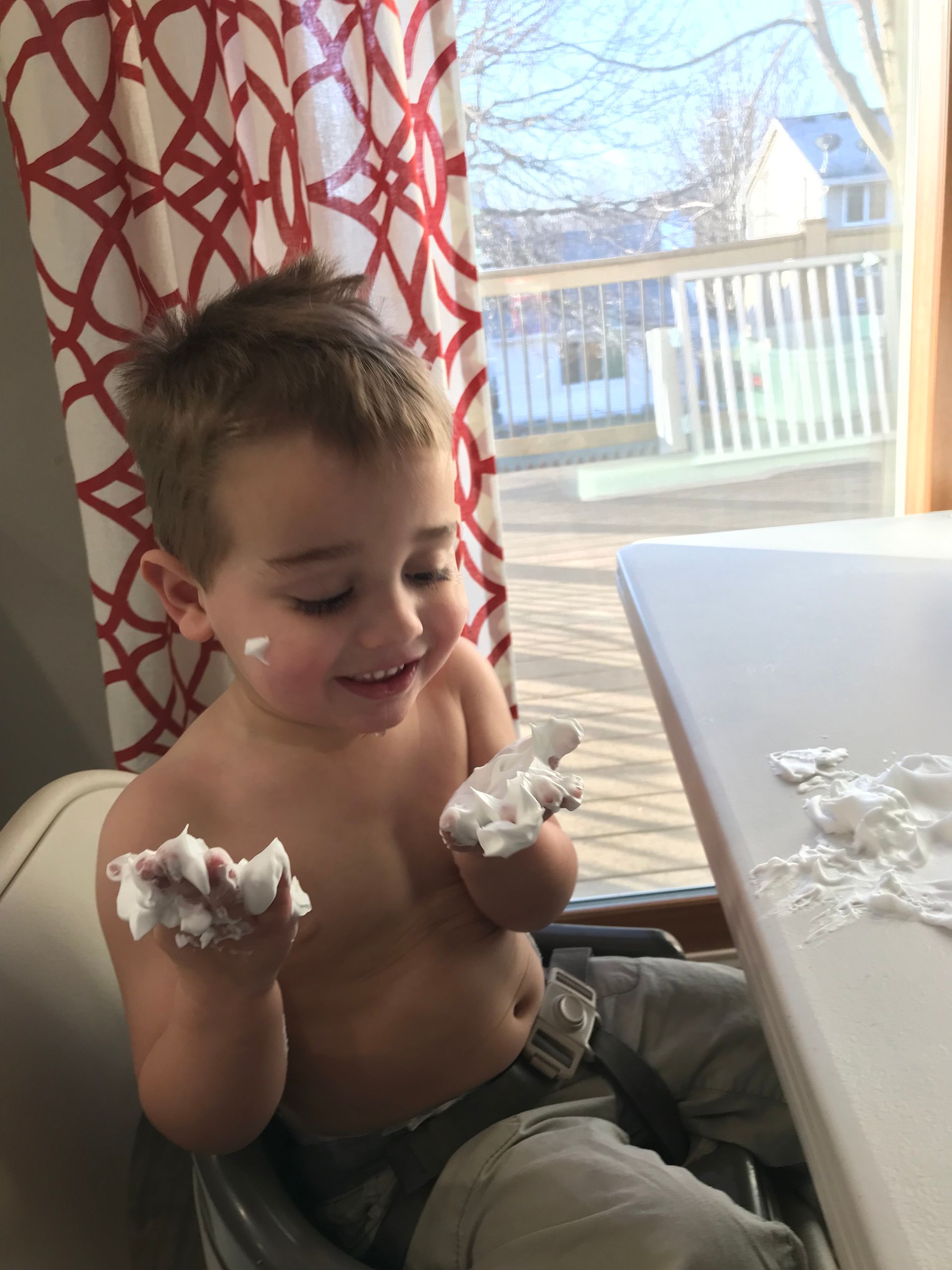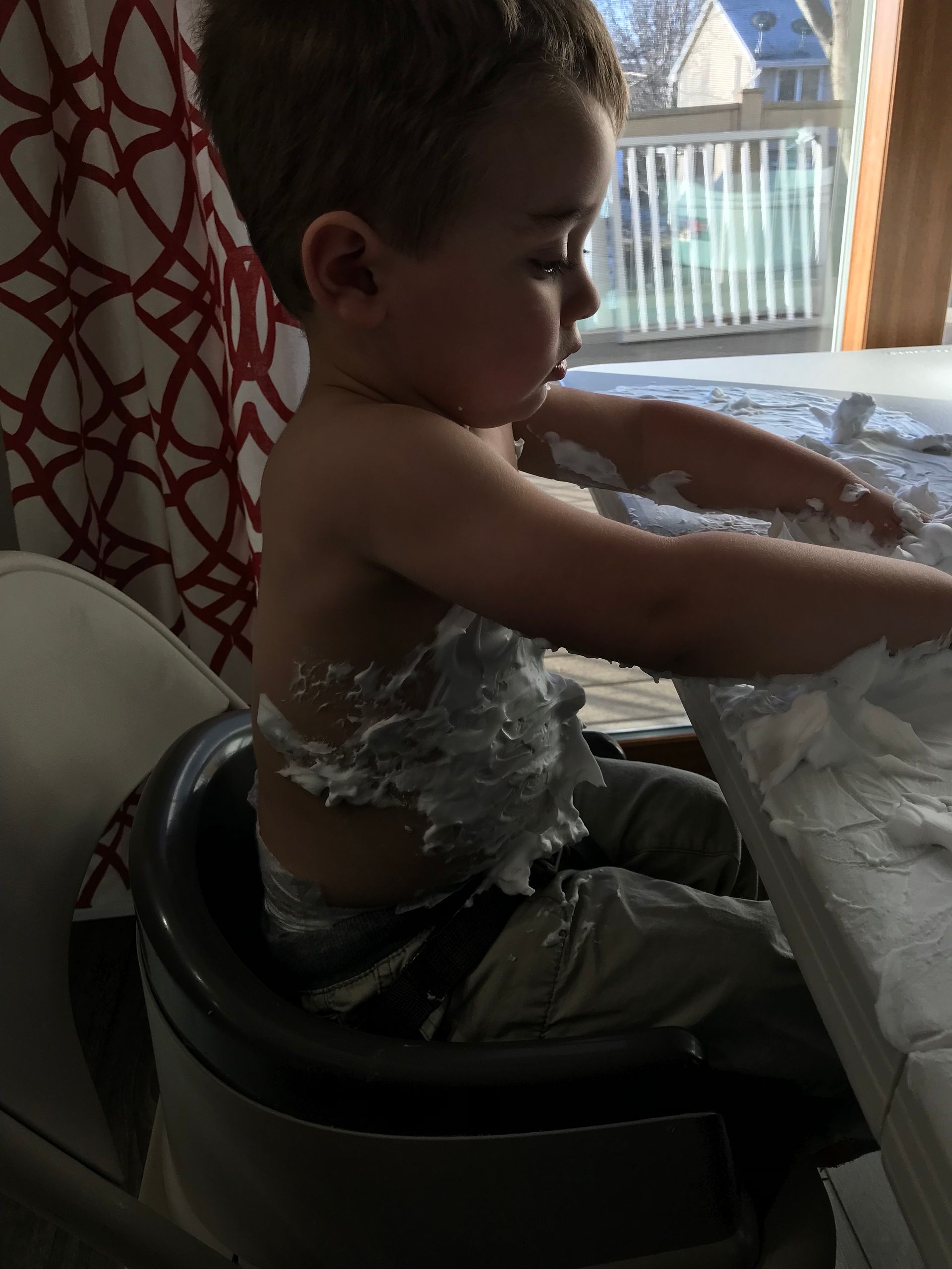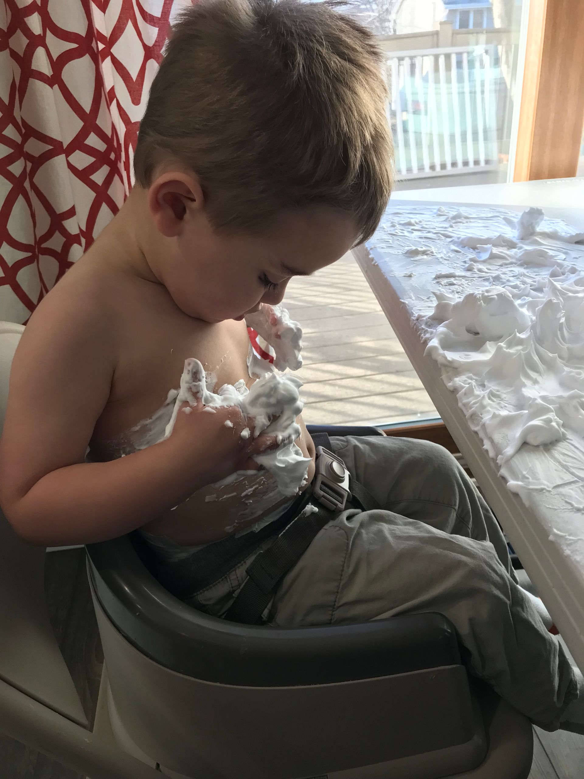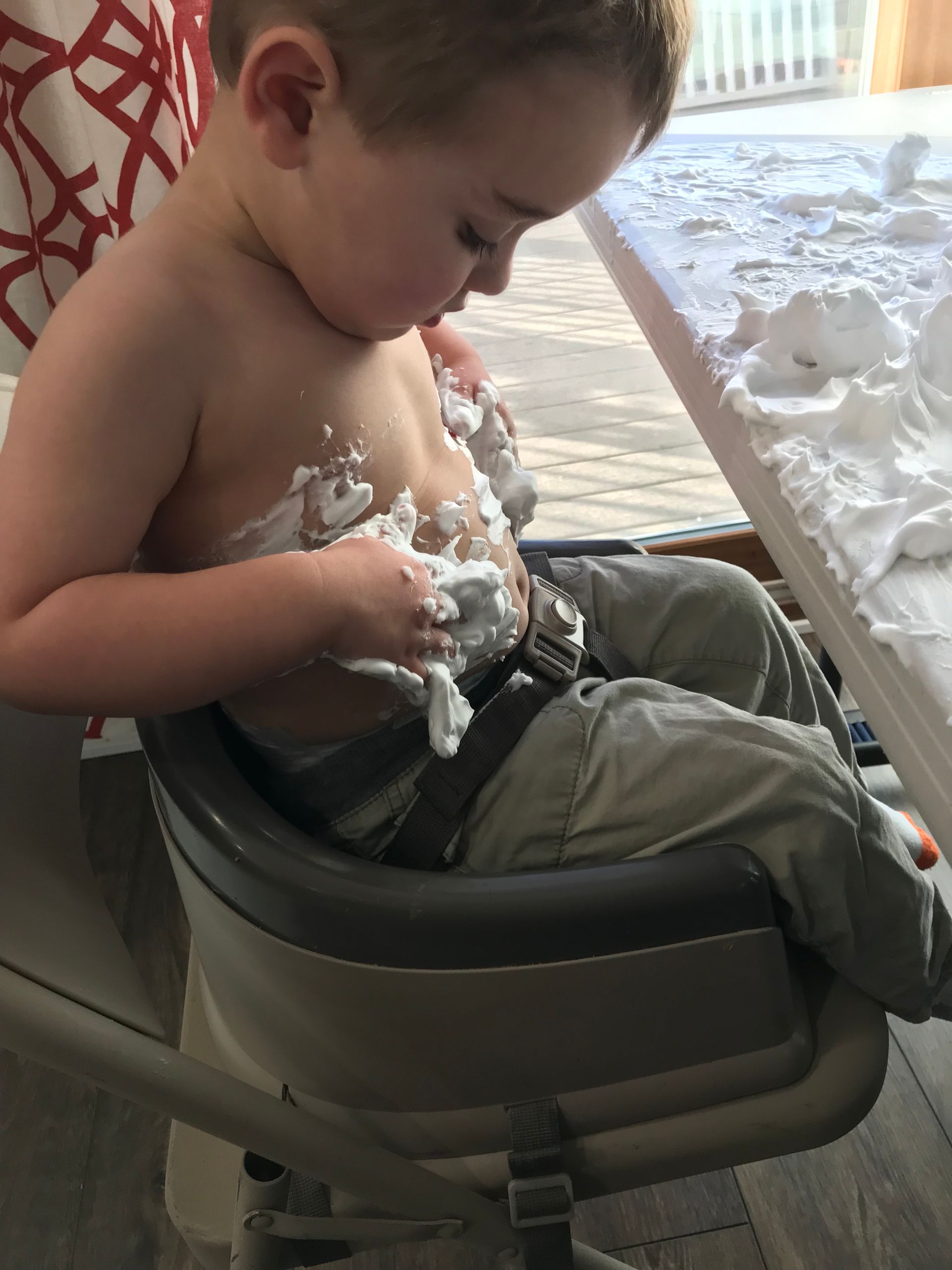I got Grant some shaving cream for something to do. He loved it and put it all over himself. It is funny to see the progression through this pictures of shaving cream going everywhere. He went straight into the shower after these pictures were taken but it looks like he had fun and the mess was worth it!