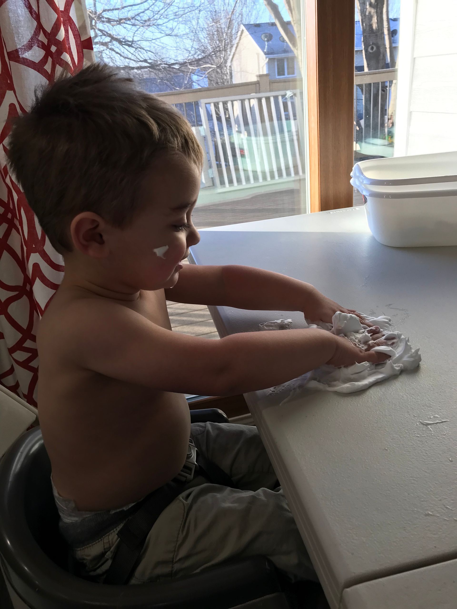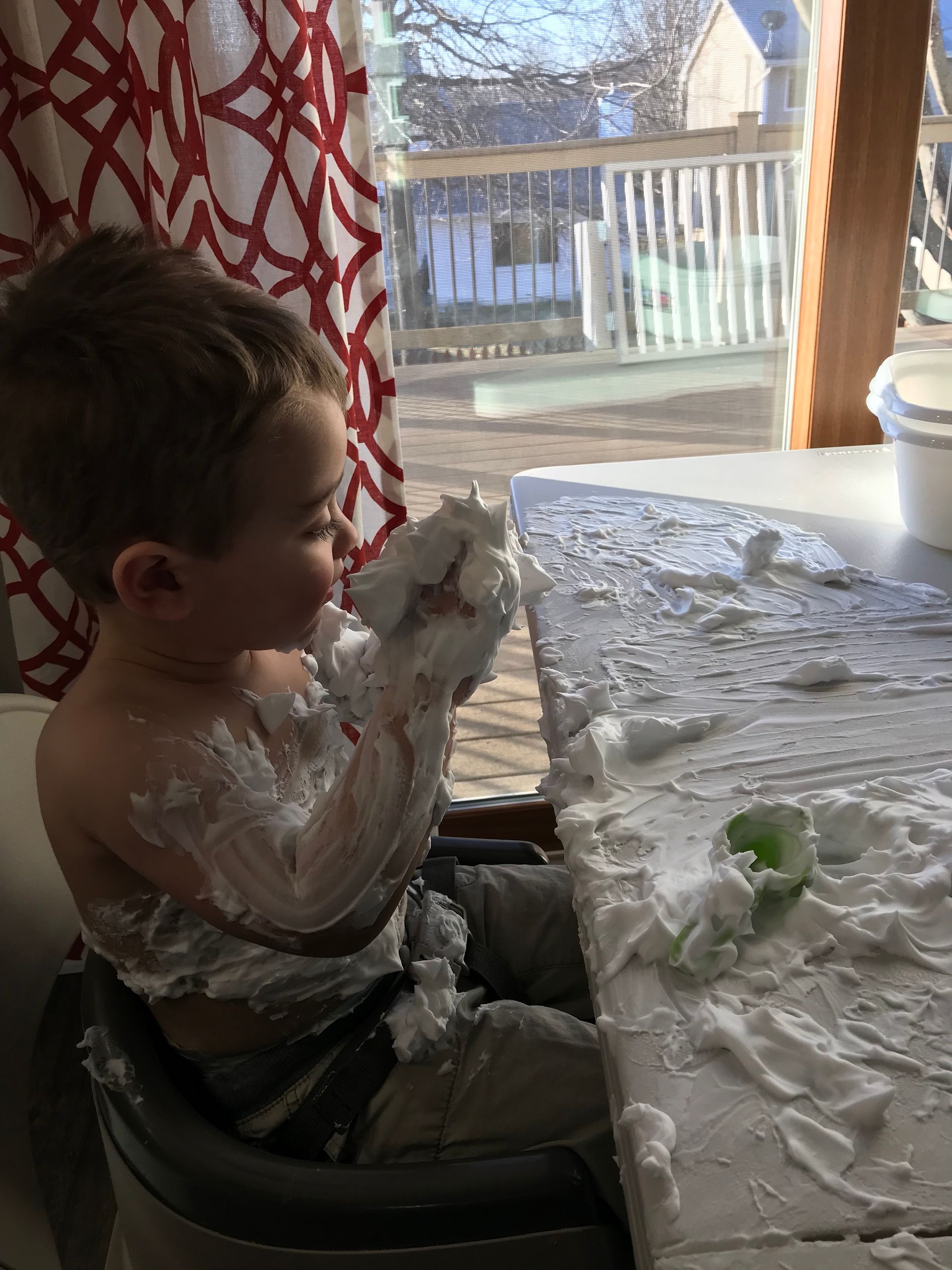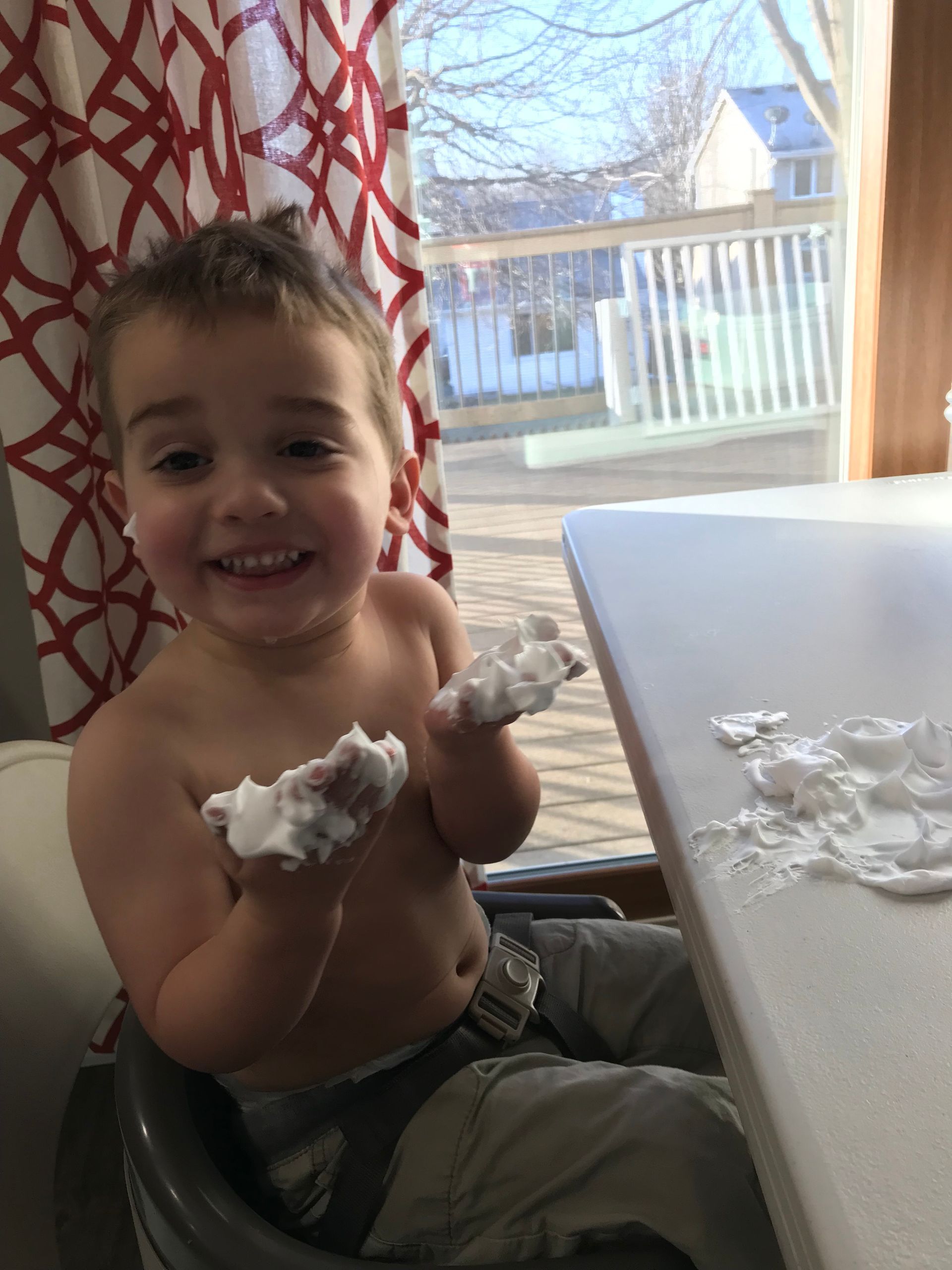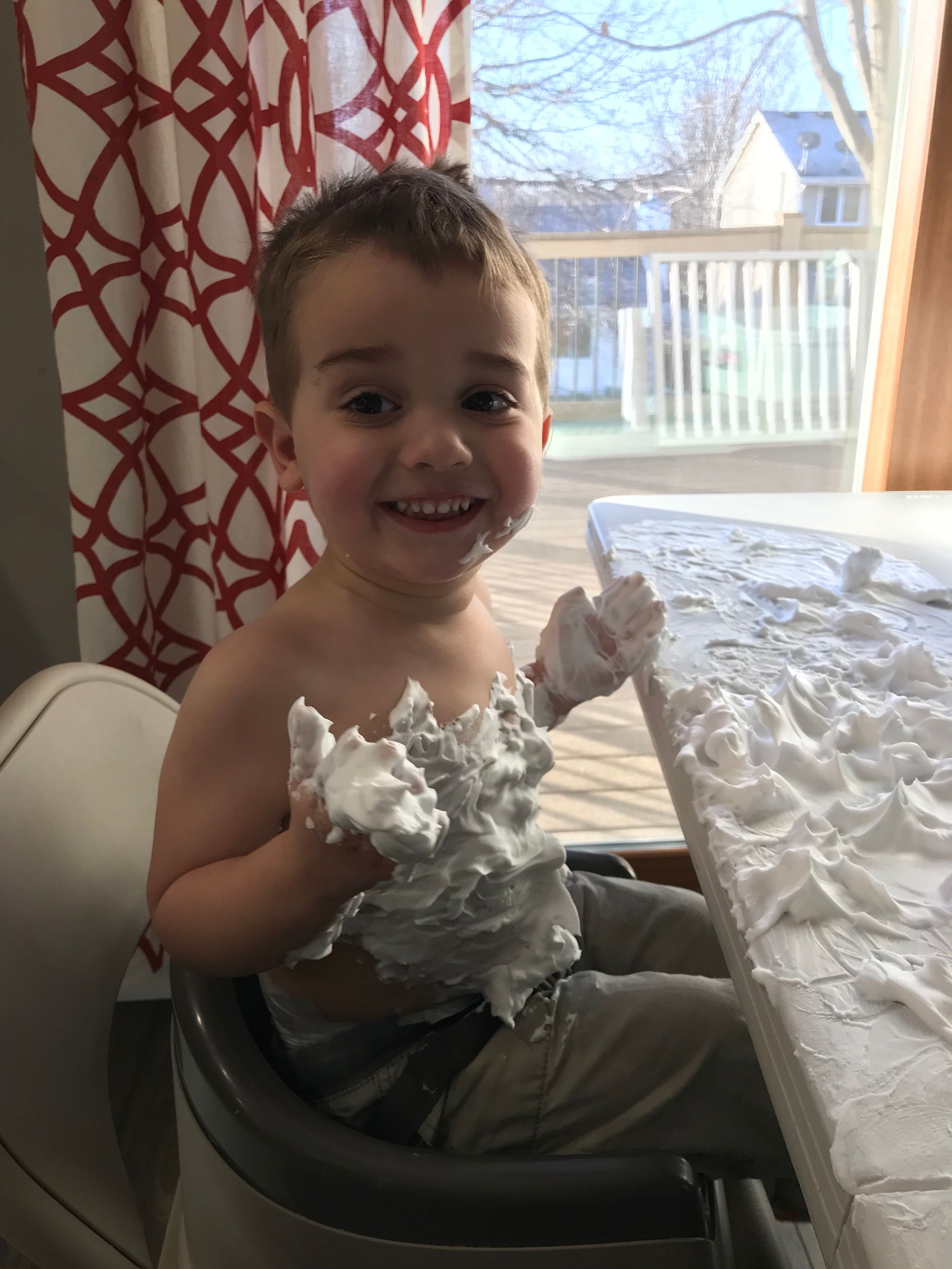I got Grant some shaving cream for something to do. He loved it and put it all over himself. It is funny to see the progression through this pictures of shaving cream going everywhere. He went straight into the shower after these pictures were taken but it looks like he had fun and the mess was worth it!
