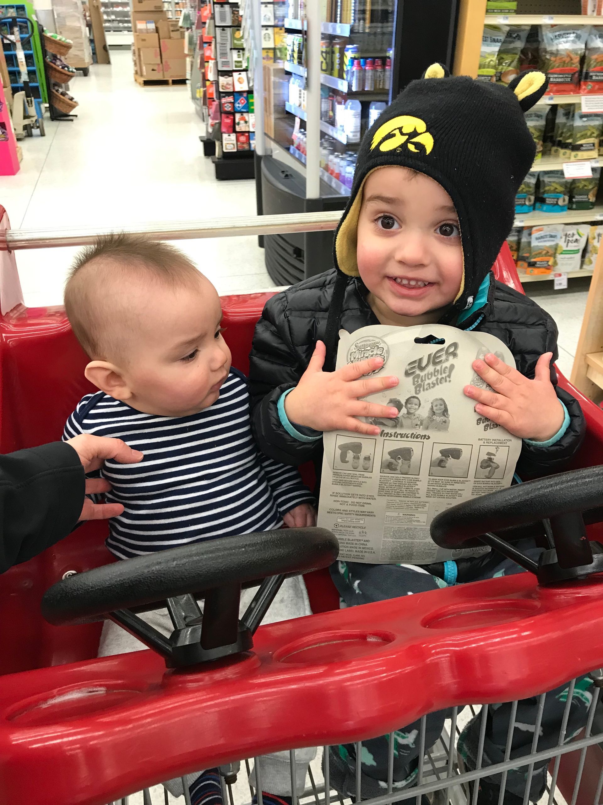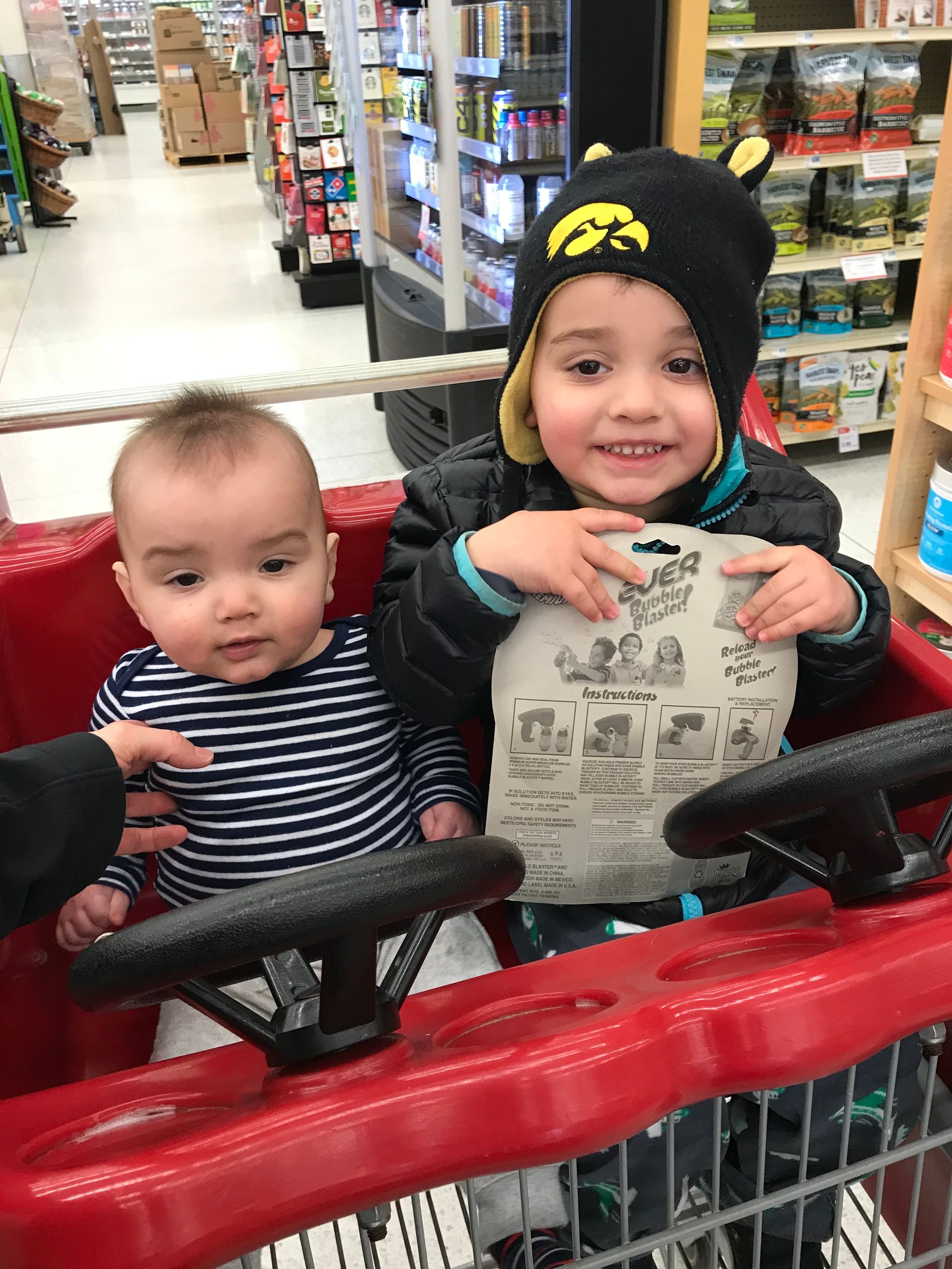 Grant was excited to have Blake in the shopping cart with him. Blake still leans over a little but he was happy to be next to him brother.