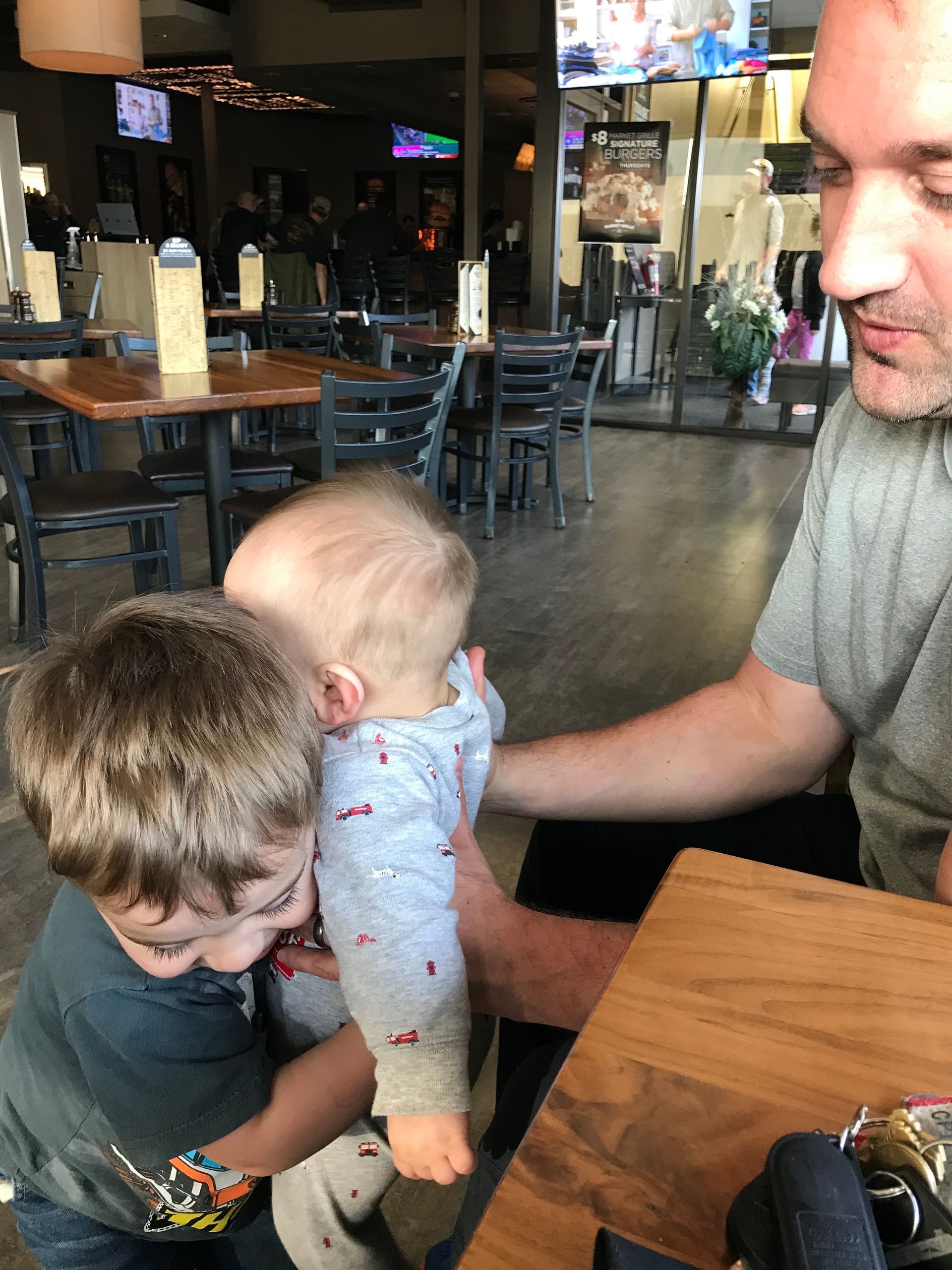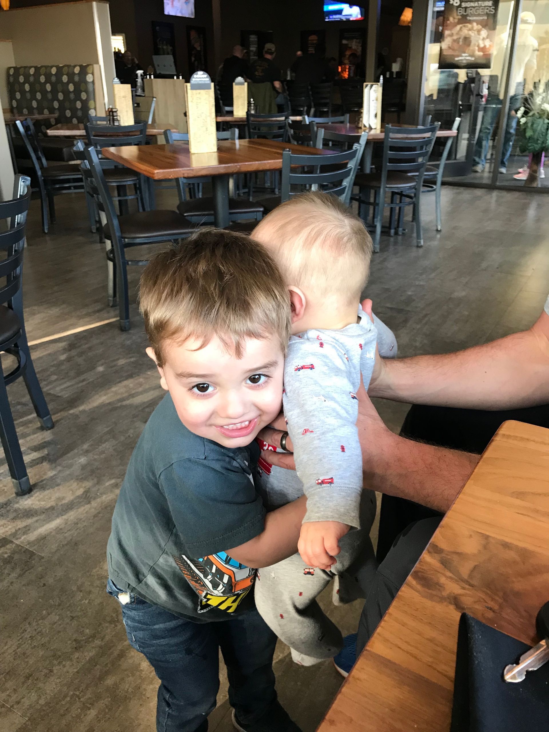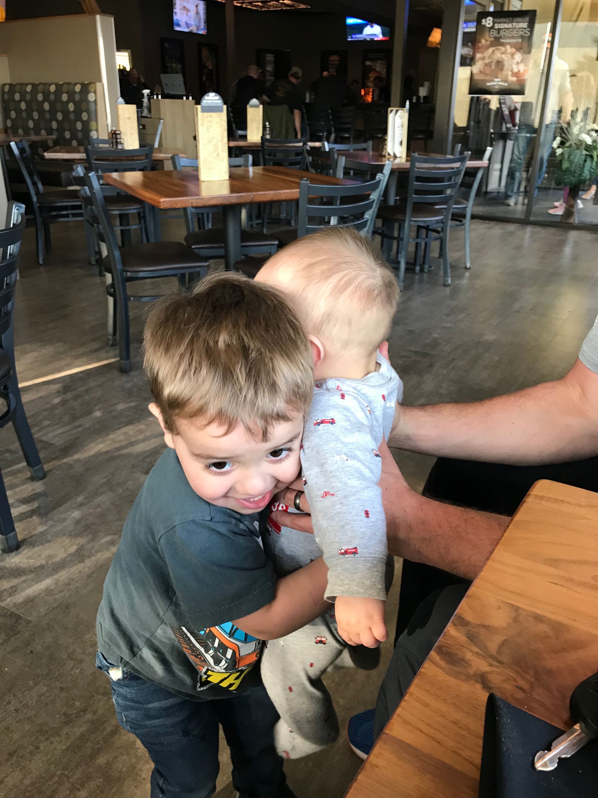 We caught a cute moment of Grant hugging Blakey! We had to get out of the house and didn't want to cook so we took them to Hy-Vee. It is quick and it wasn't busy when we come and make a scene with two little crazy boys. We also got another hug and Nana and Papa's house. He obeys our requests every once in a while at least.