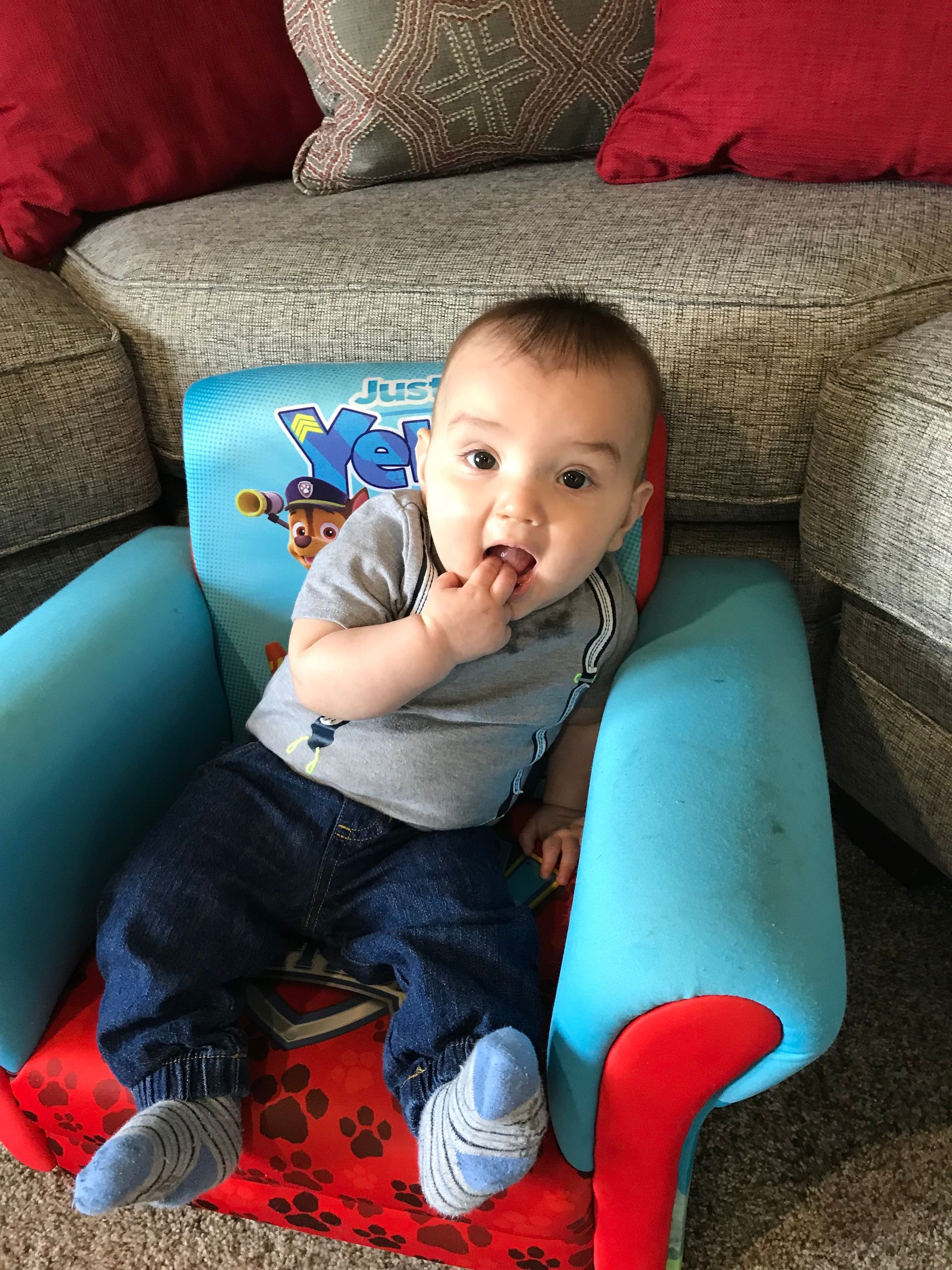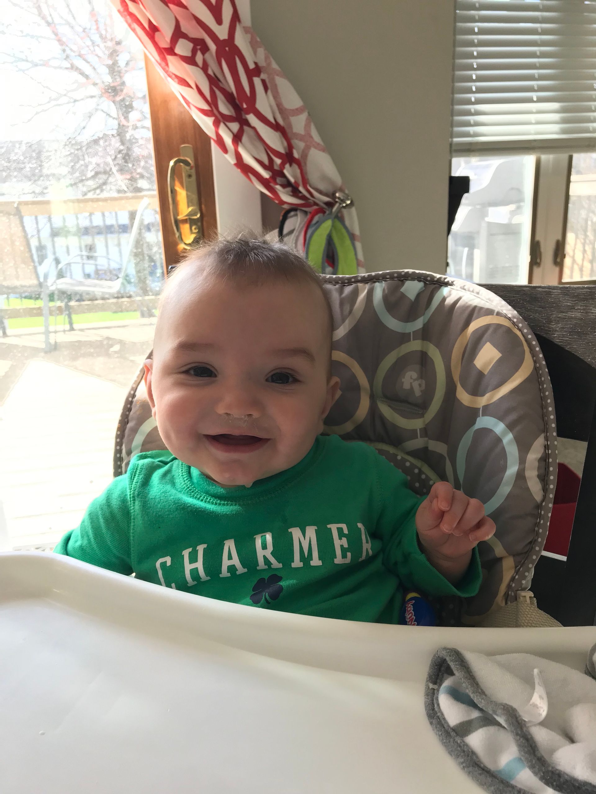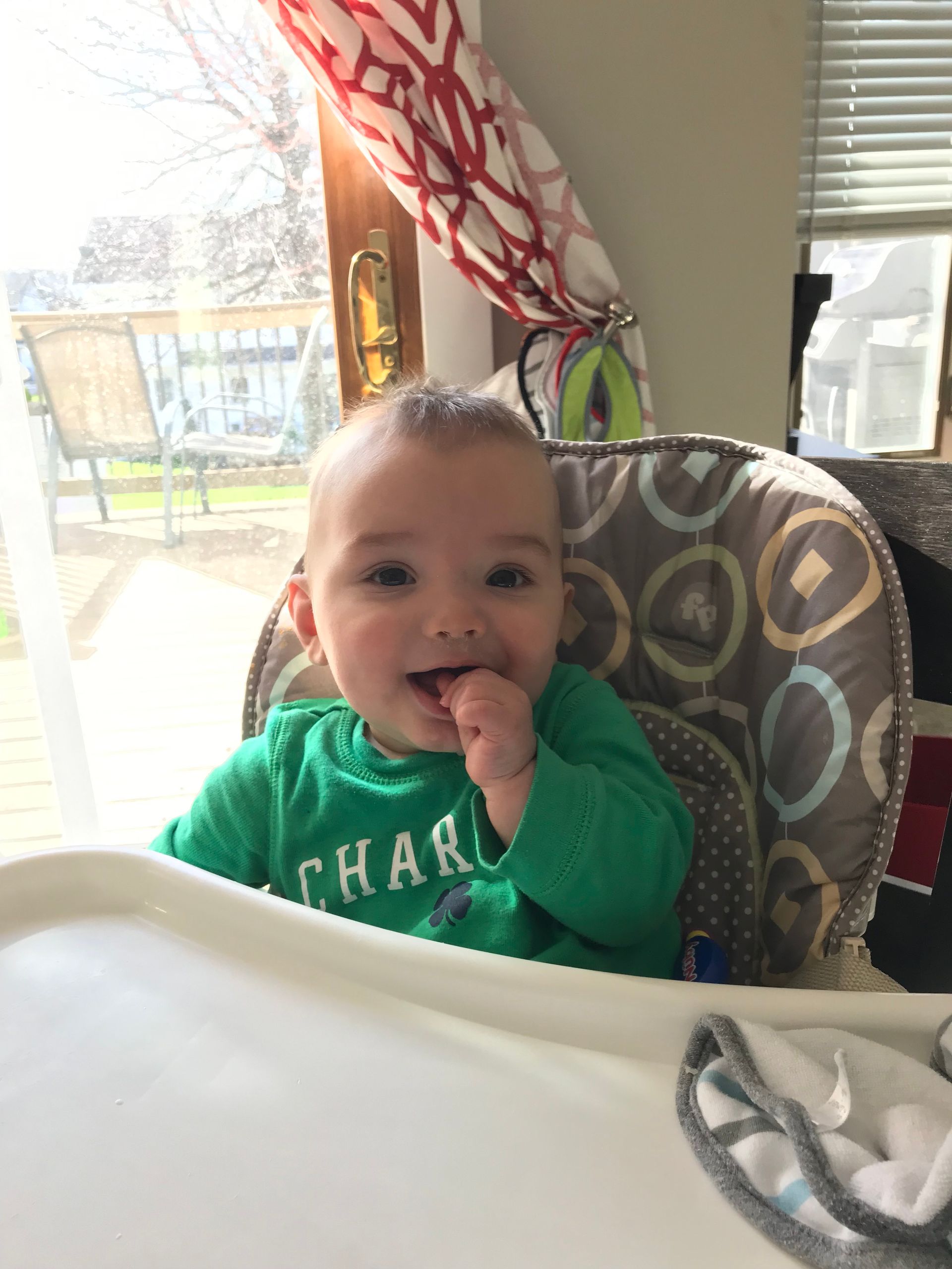 Blake is 7 months! We got some things checked off our list and his murmur is gone so they said the holes in his heart are gone and he doesn't have to go back until 3! Wahoo! He is working on sitting up but still falls over because of that big belly. He is 19.5 lbs but still gets up in the night to eat so we are still tired. He started to army crawl this month so he is on the move. He has to keep up with him brother who he absolutely loves and is his favorite person ever!. We love his dimple, smiles and giggles.