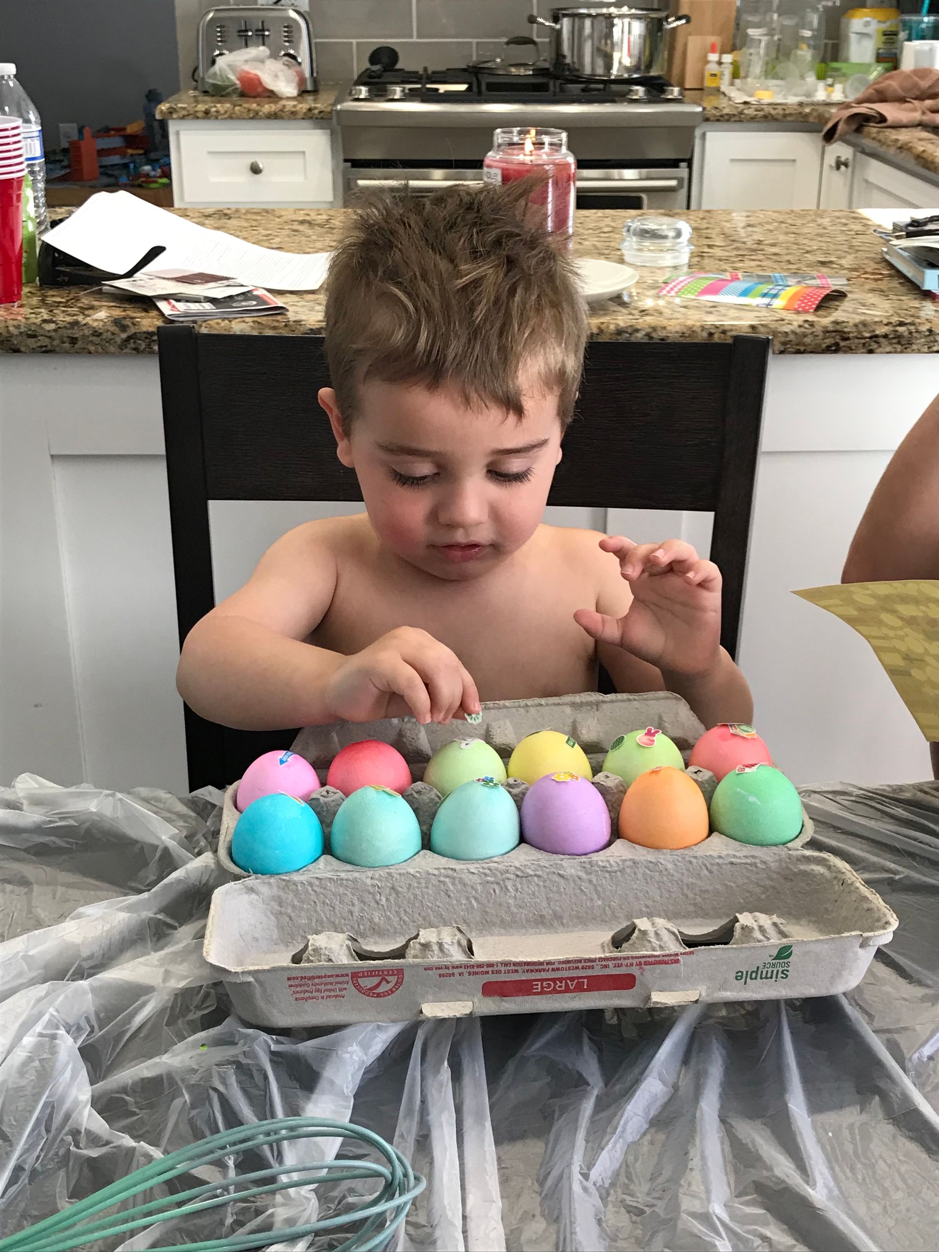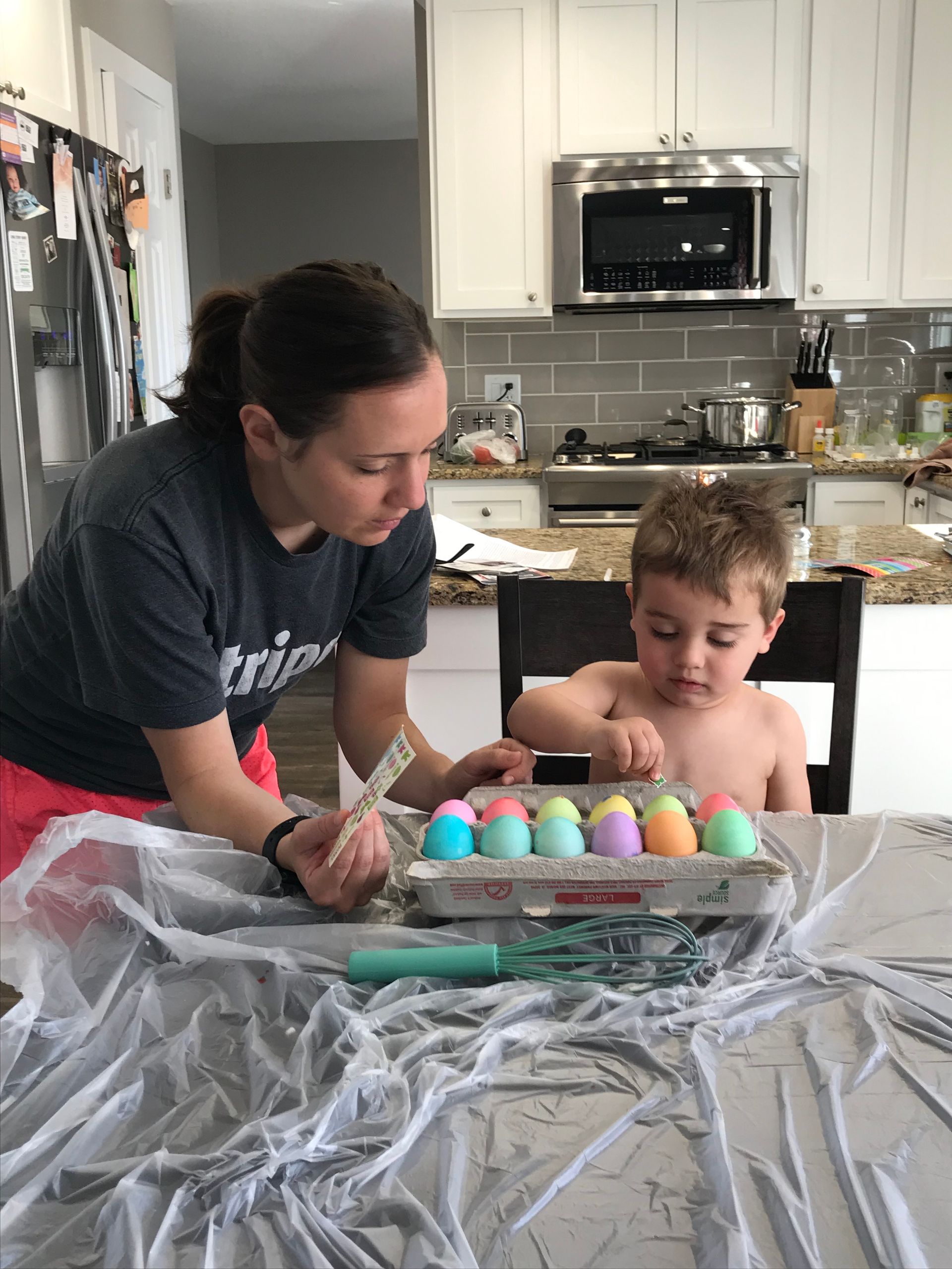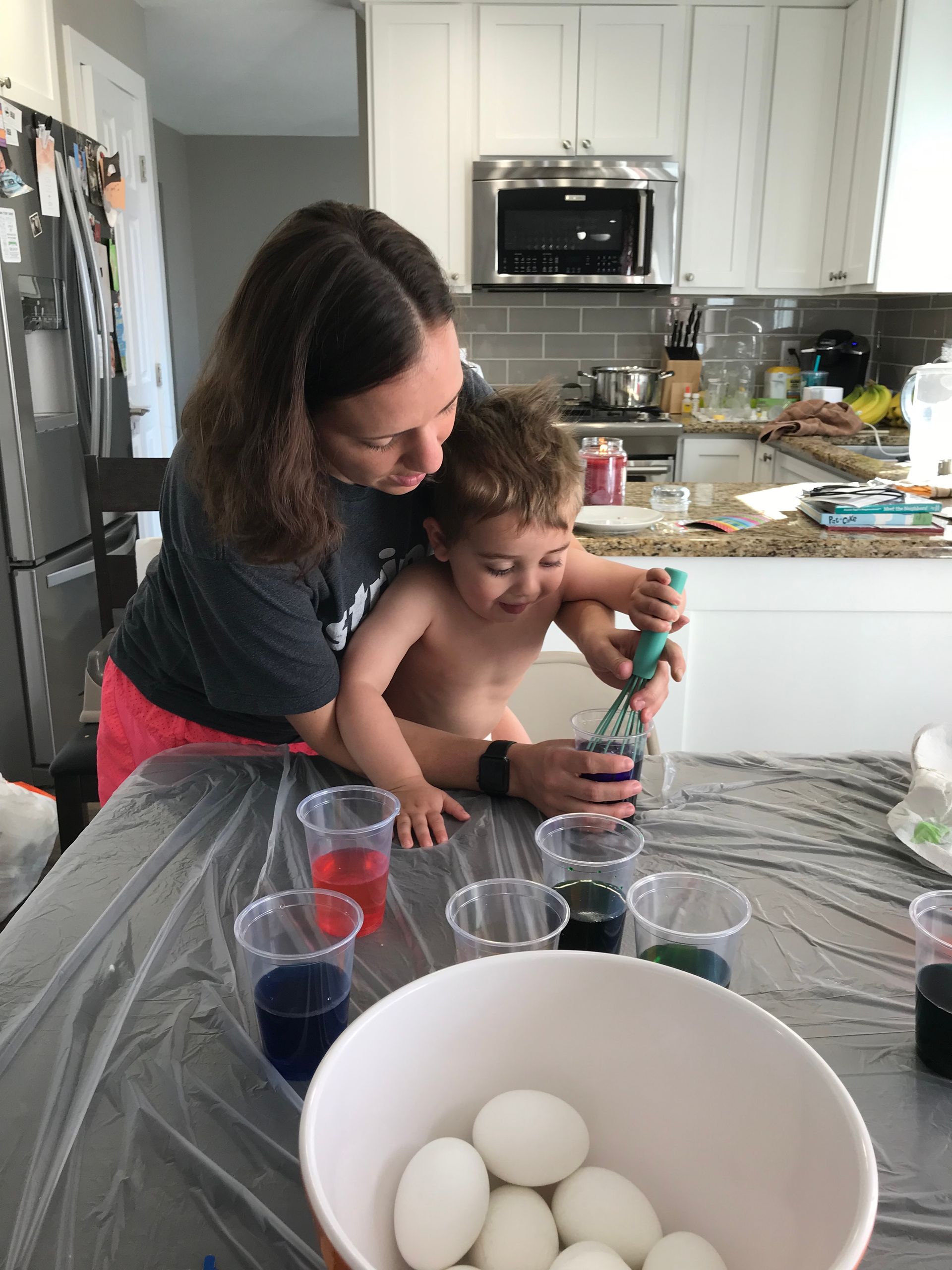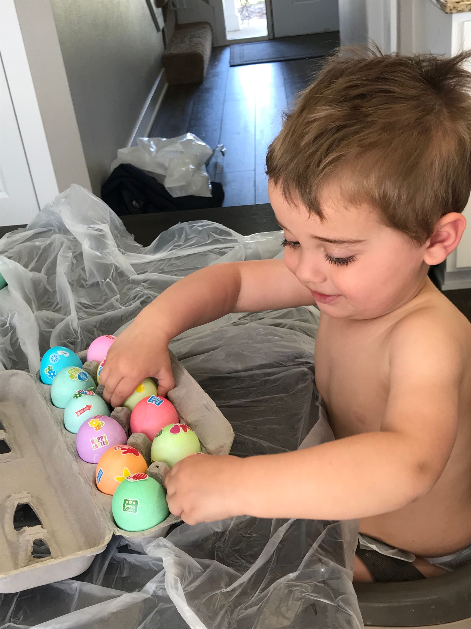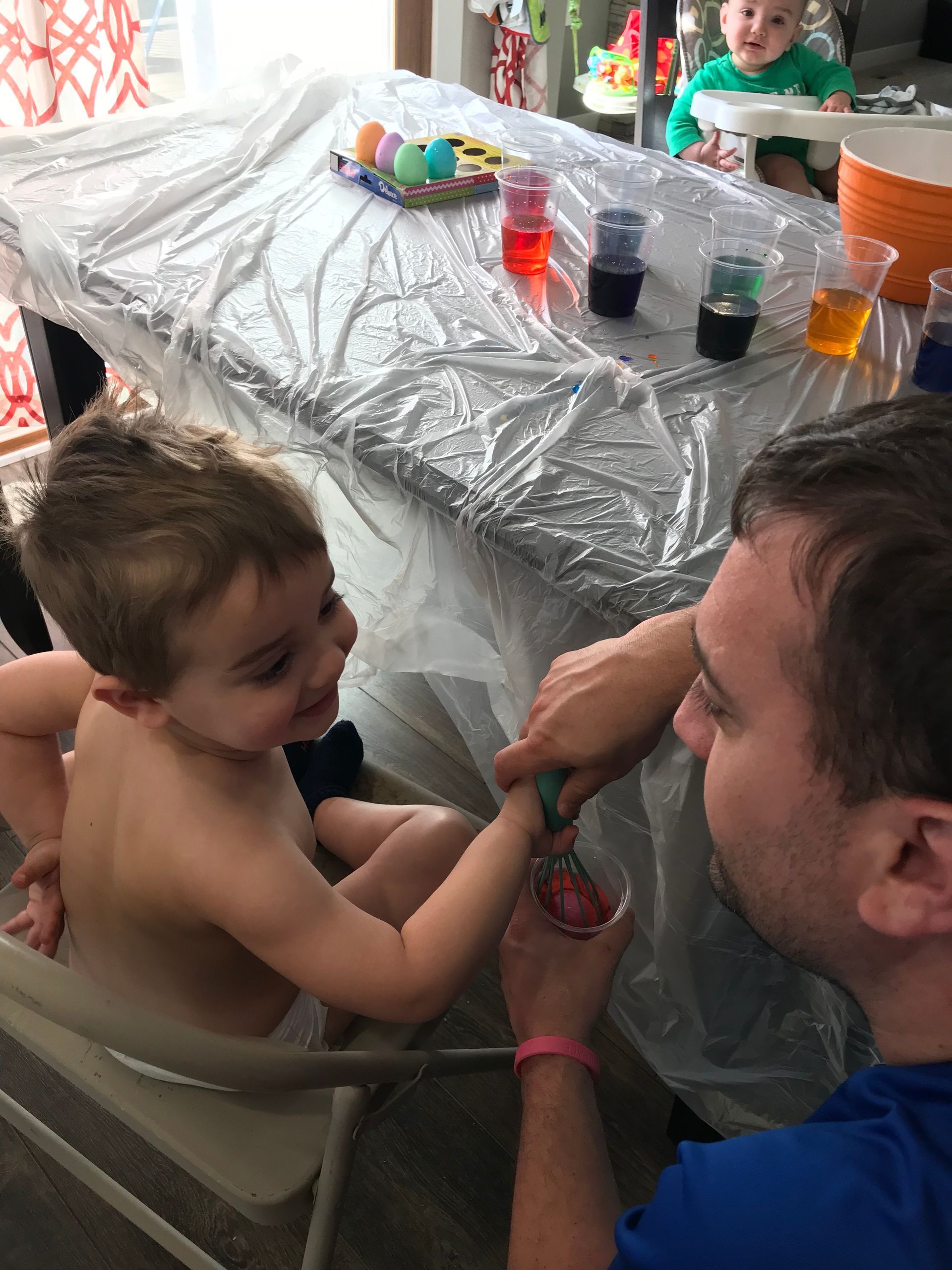 We dyed Easter eggs! Grant dyed the eggs and Blake was just being a cute observer It was definitely stressful with a 6 month old and 2 year old but I think Grant had fun and that is all that matters.