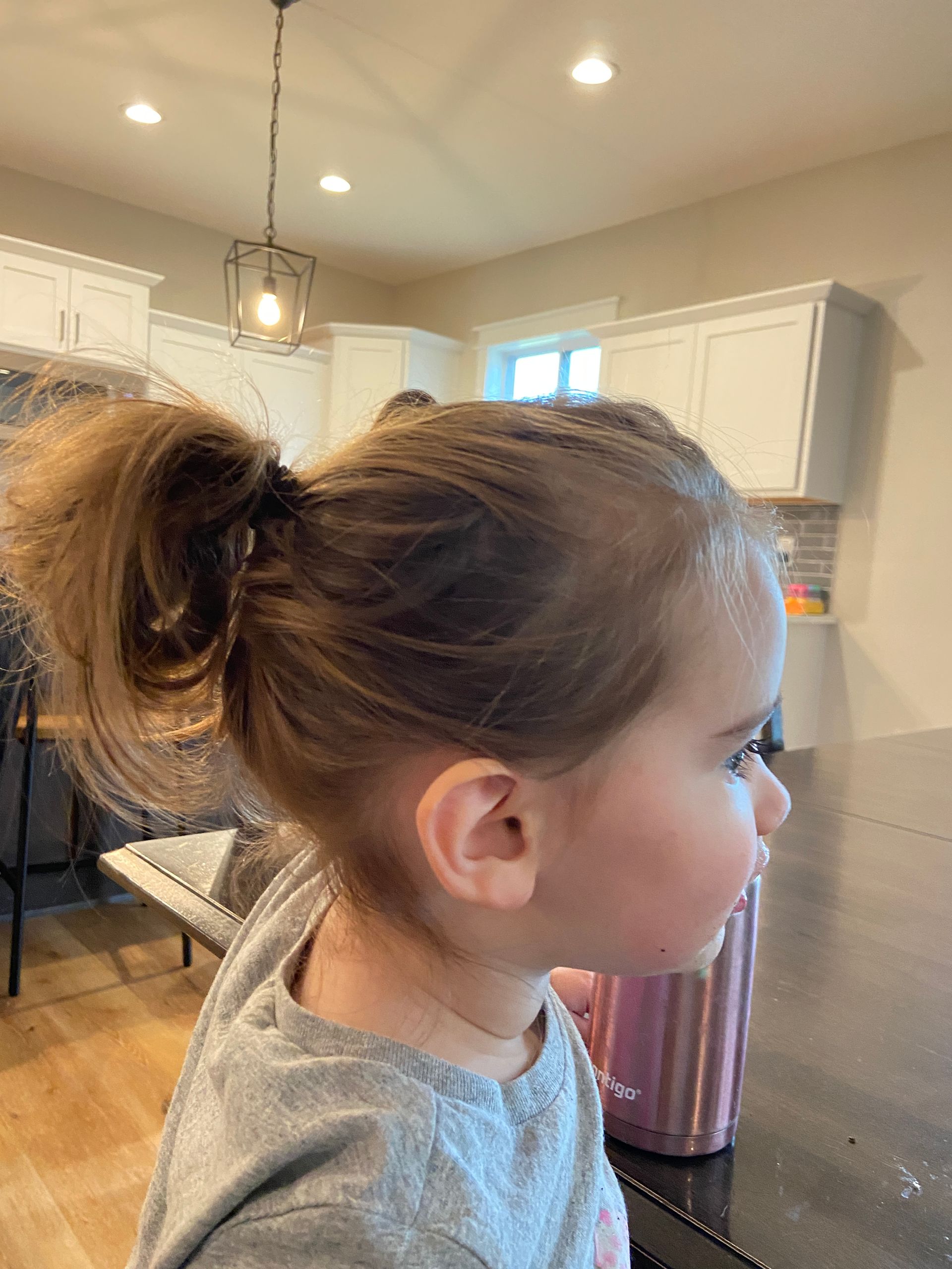Claire doesn't like her hair in her face but also does not like me to do her hair so we put it up in a princess hair do and she loves it! It never fails that after I put it up she immediately asks for me to take a picture so she can see her princess hair.