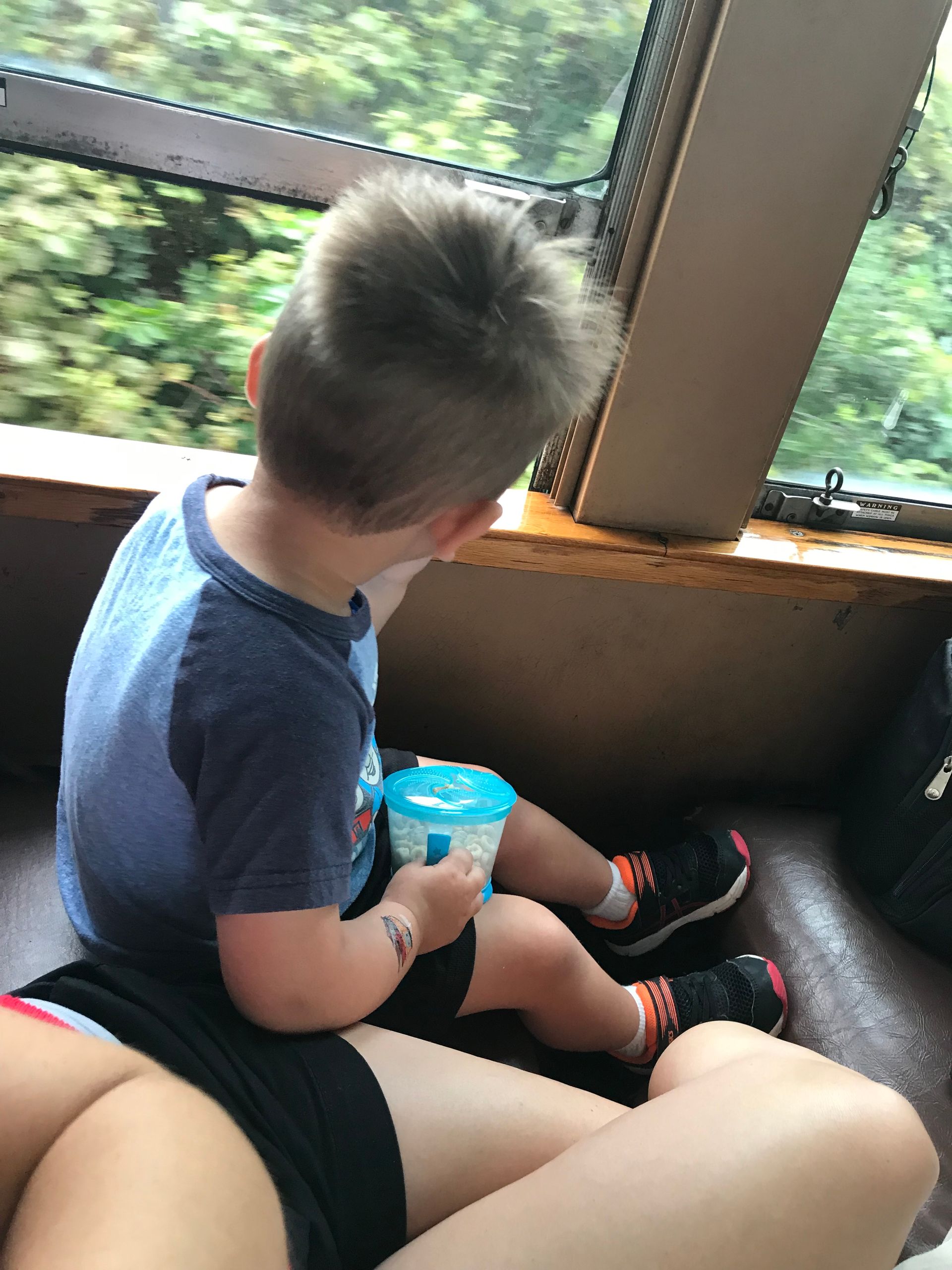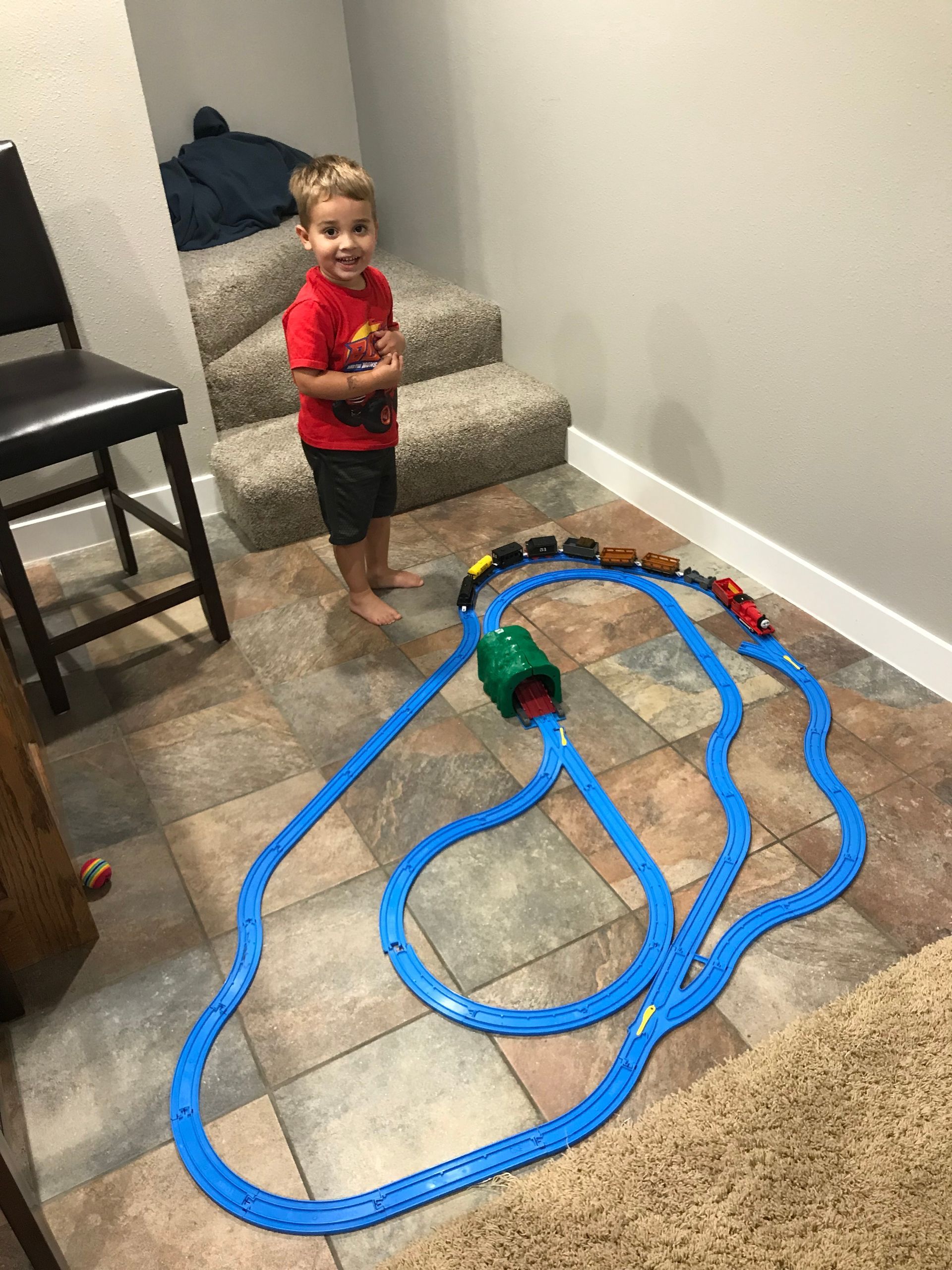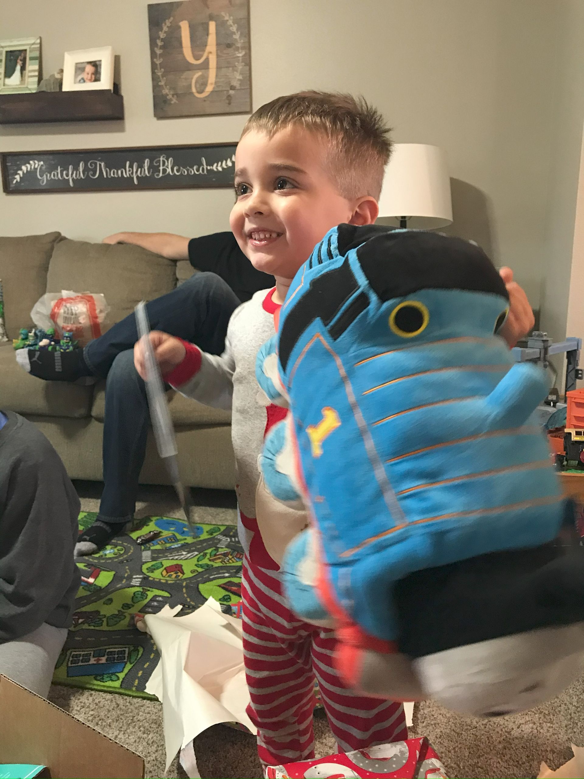 Blake loves riding on Thomas! He hasn't quite figured out how to push the button to make it go so Grant helps him and he loves it.