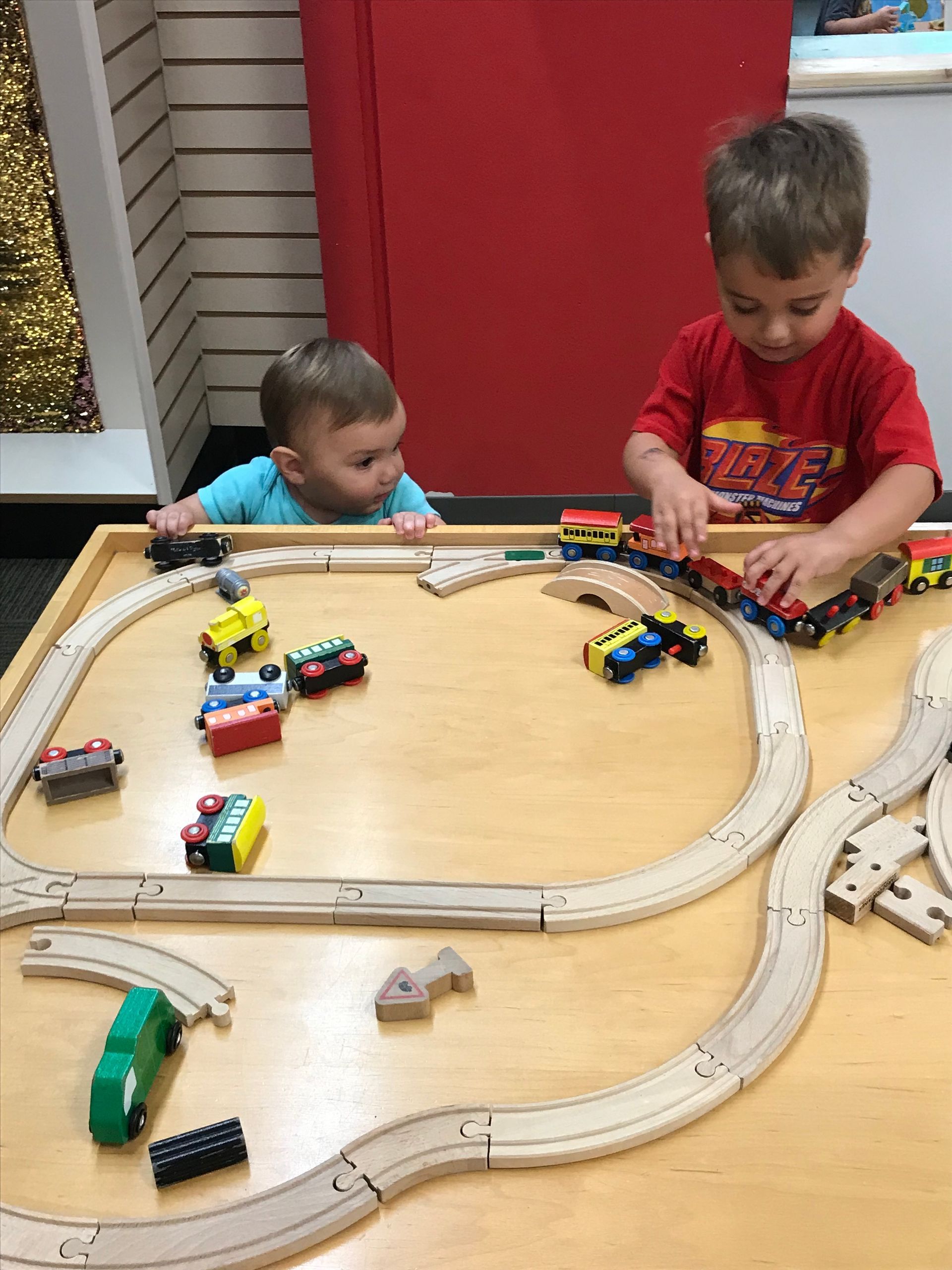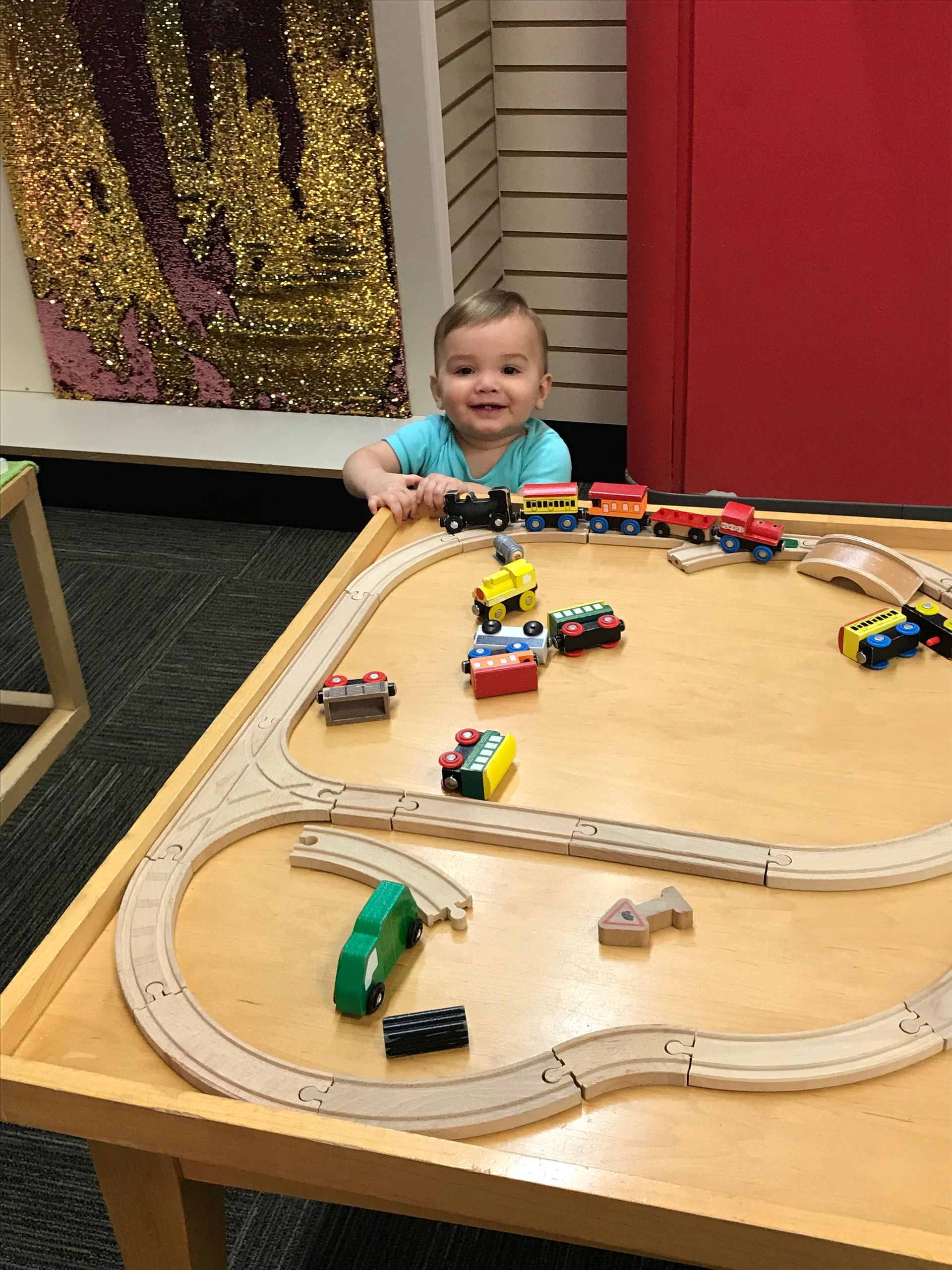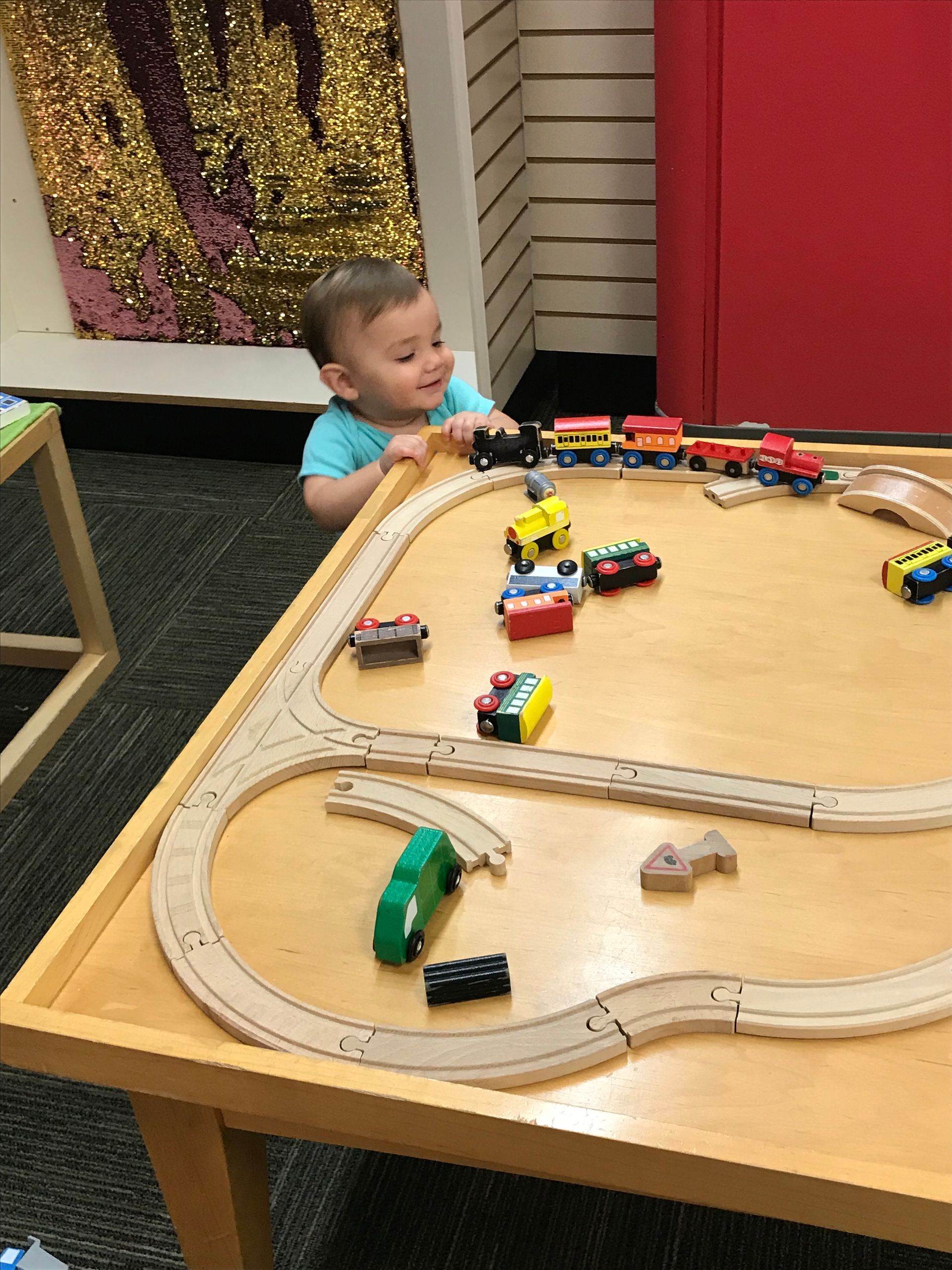 Blake is standing up at the train table and playing with trains just like Grant!