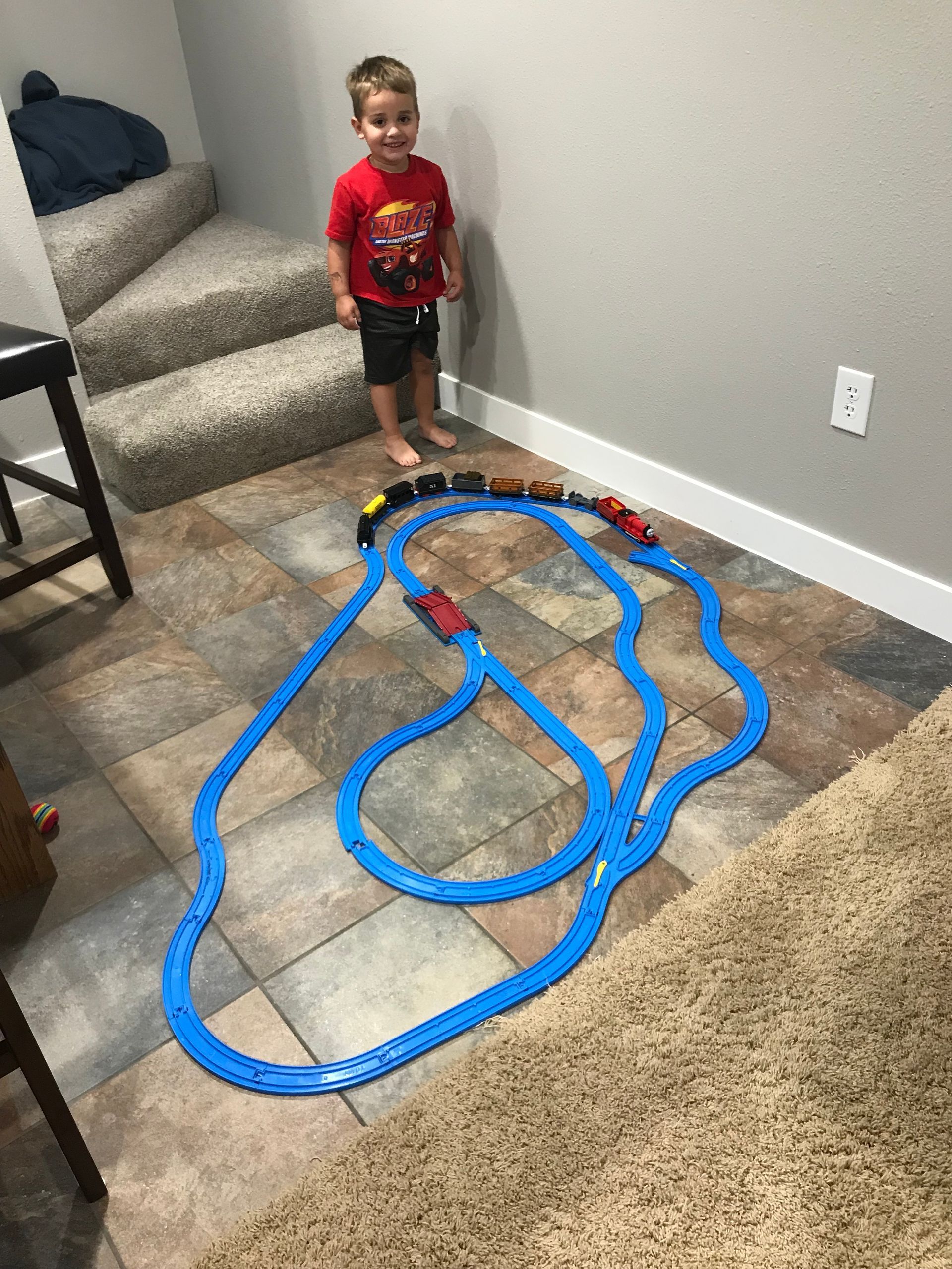 We found some train tracks on Amazon marketplace and Grant loves them. They are fun to make different tracks and Grant loves to create new tracks with his trains.
