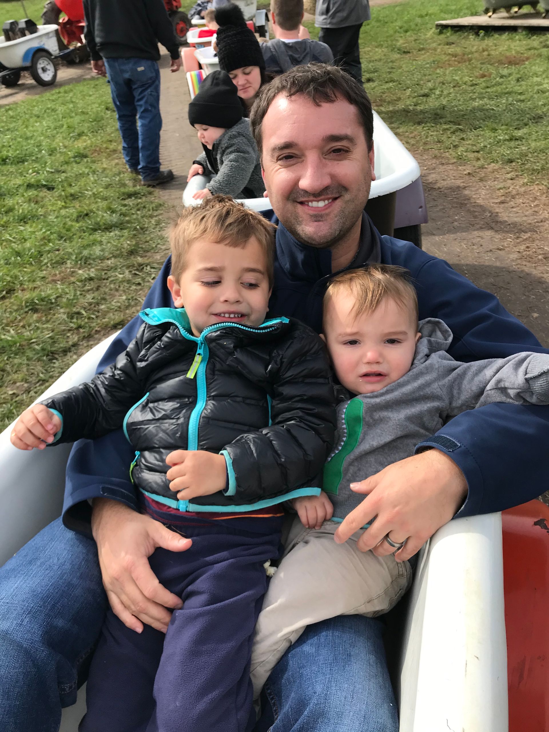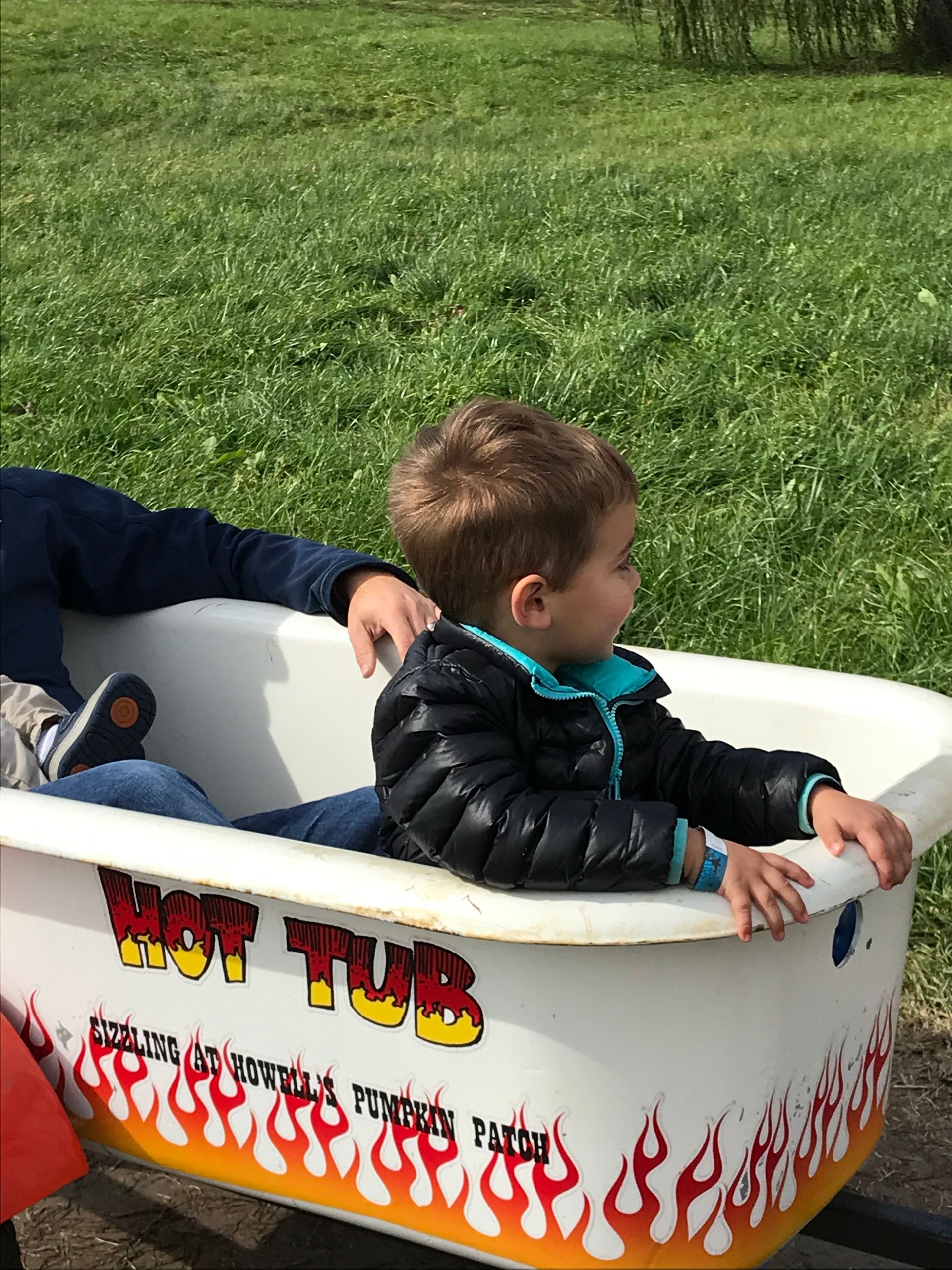 We took the boys to Howell's pumpkin patch. It was a nice day for it! As you can tell from the pictures we had some good moments and some toddler moments. Grant loved the bathtub train and was mad when he had to get off!