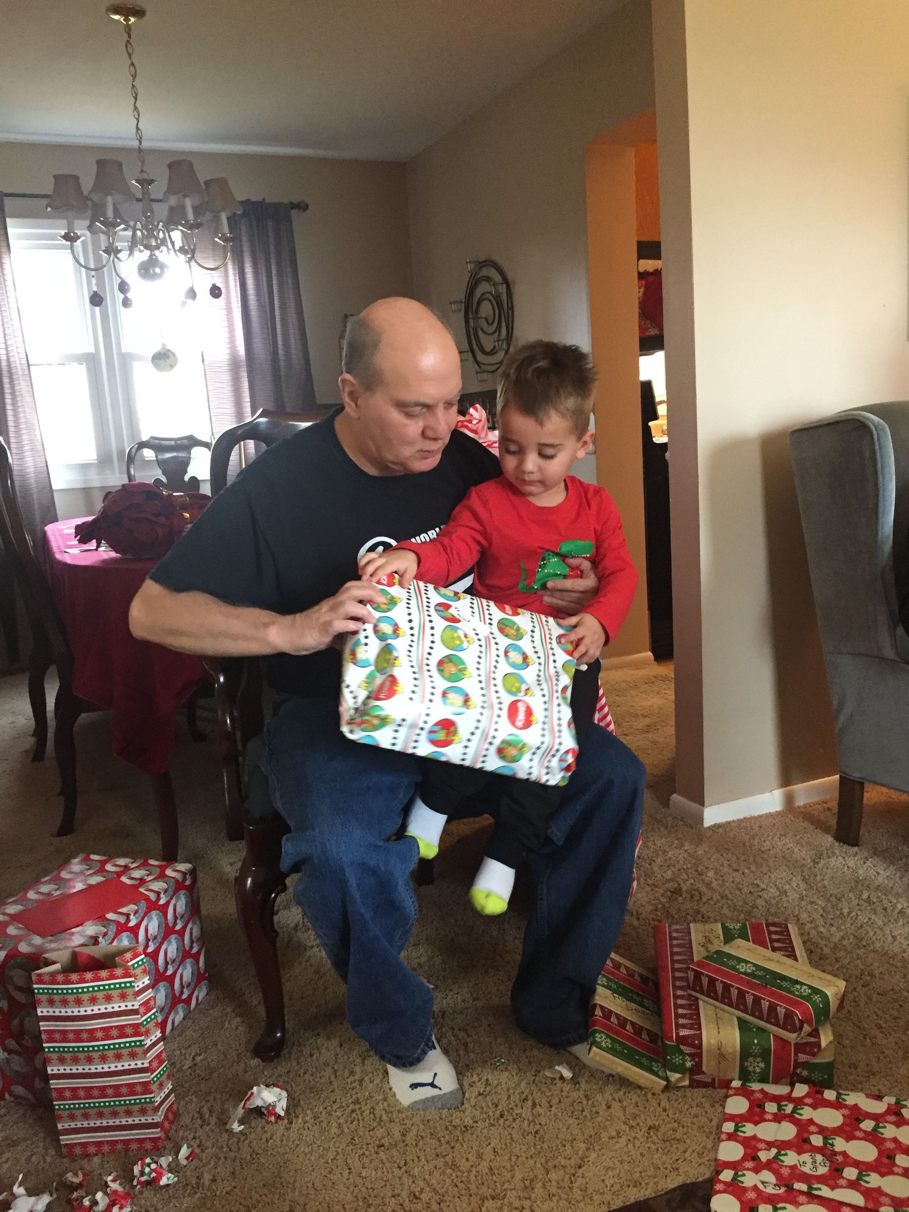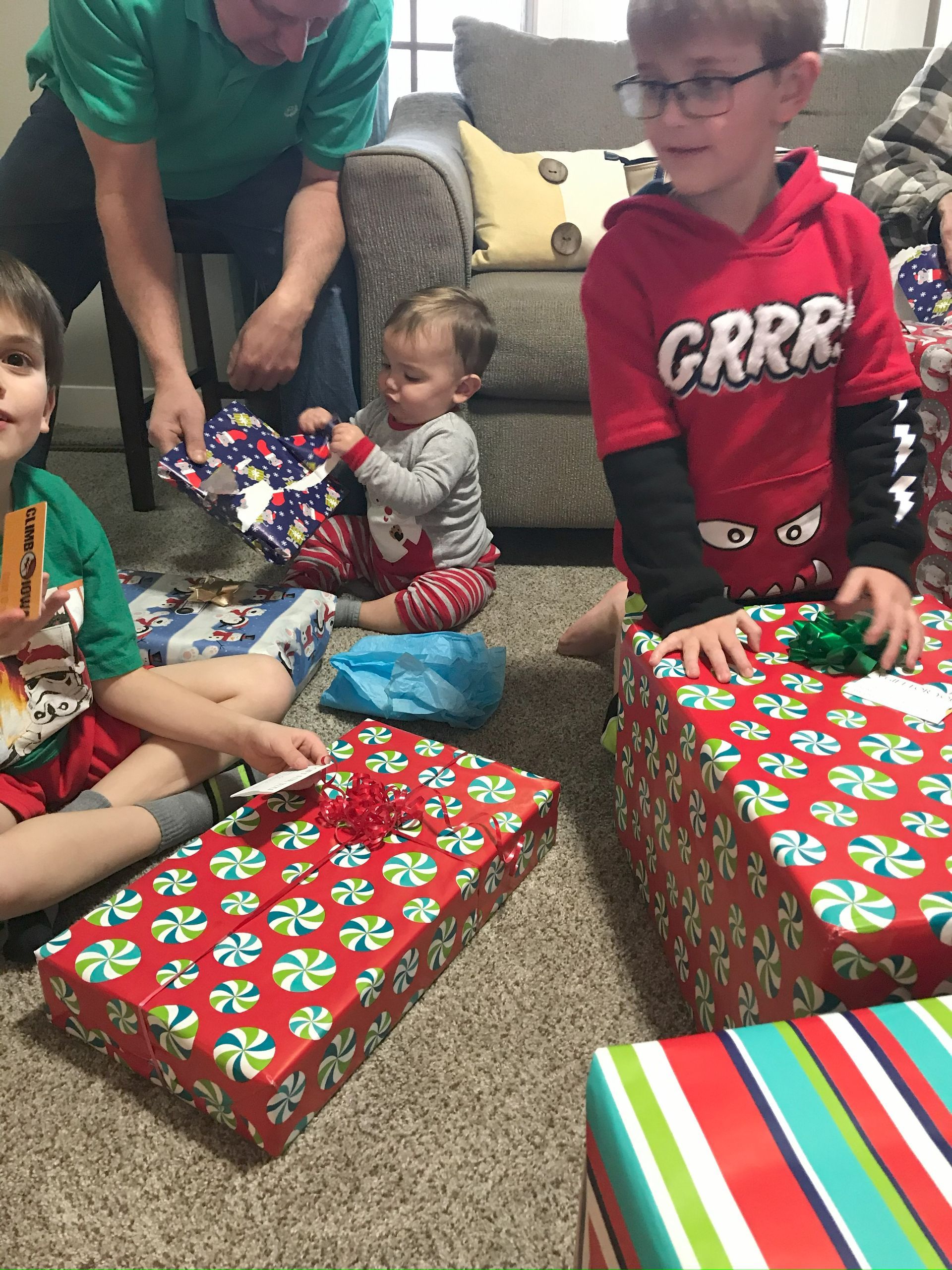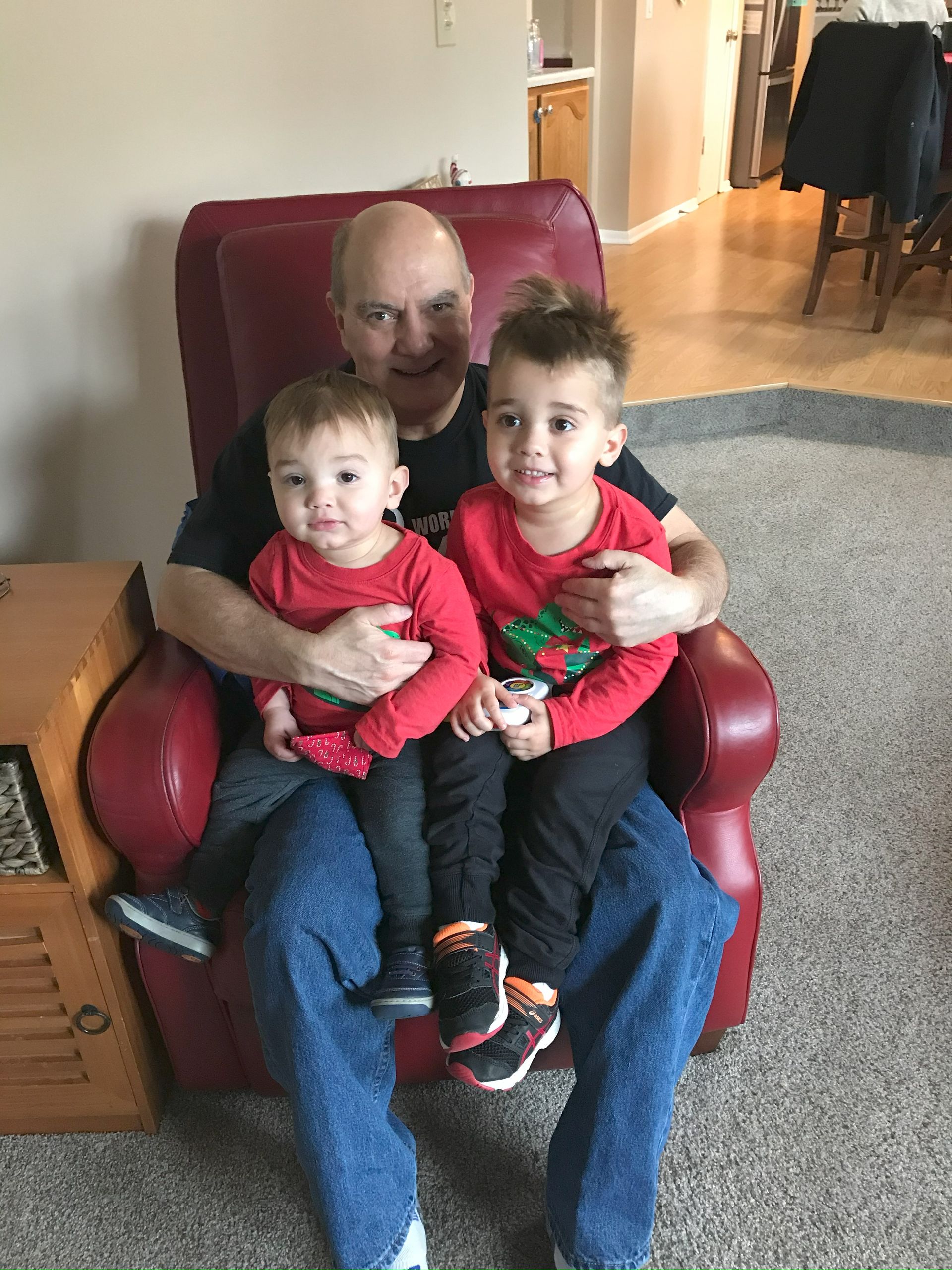 The boys both wanted to sit on Papa's lap. Grant was talking about what dinosaurs say and Blake was growling at Uncle Mit. It was cute!