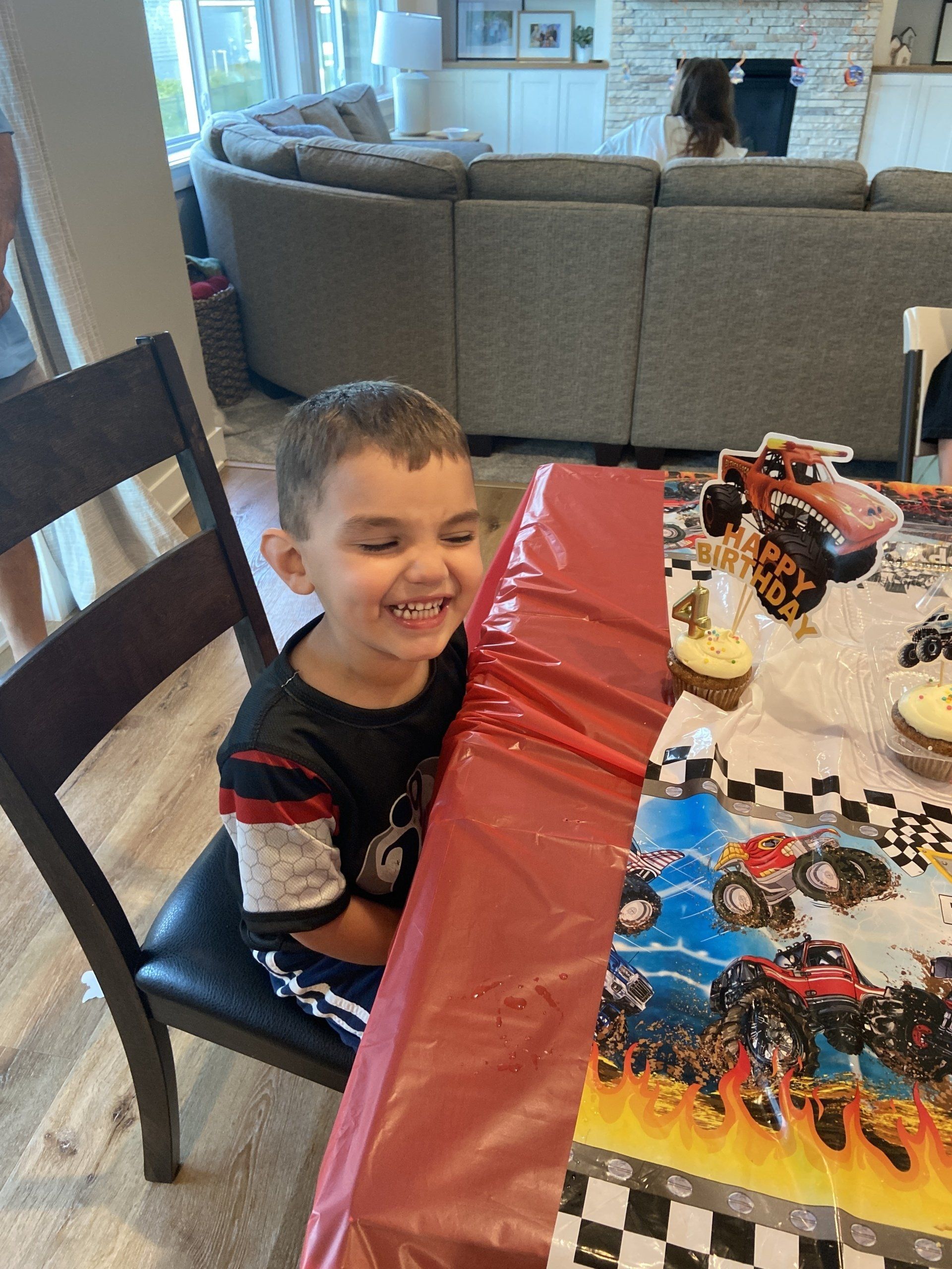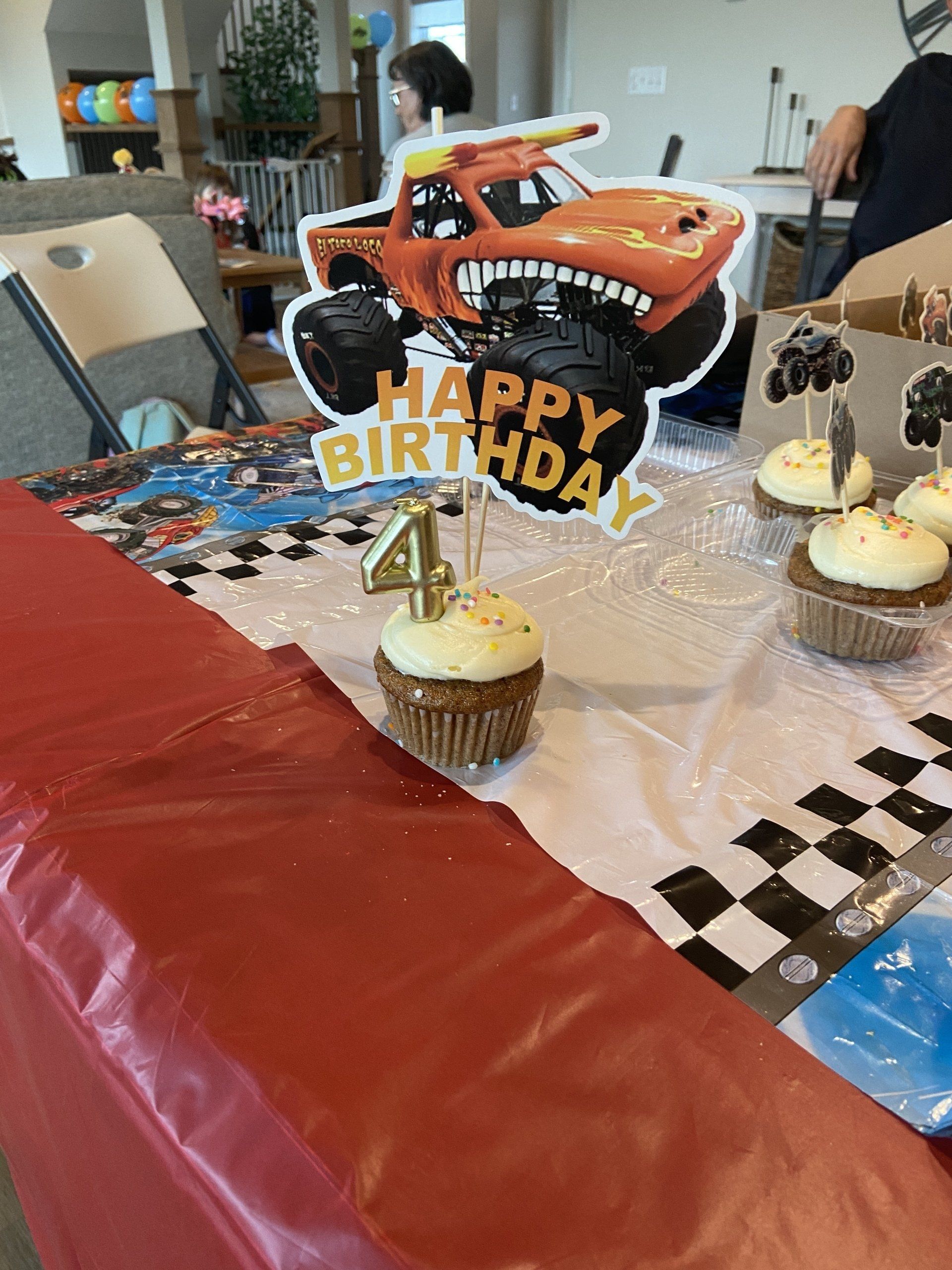 Blake turned 4 on September 15th! We kept him home on his actual birthday and then we have the family birthday the Sunday after. We had so much fun celebrating! Everything was monster truck themed and he loved it. On Sunday, Grandma was in town and went to the park with the boys and Greg in the morning and then the whole family came over to celebrate have his birthday party. Blake is still dairy and gluten free so that was a challenge for his birthday. We wanted him to have the same thing as everyone else so we found gluten and dairy free cupcakes at Molly's cupcakes downtown. They were actually pretty good!