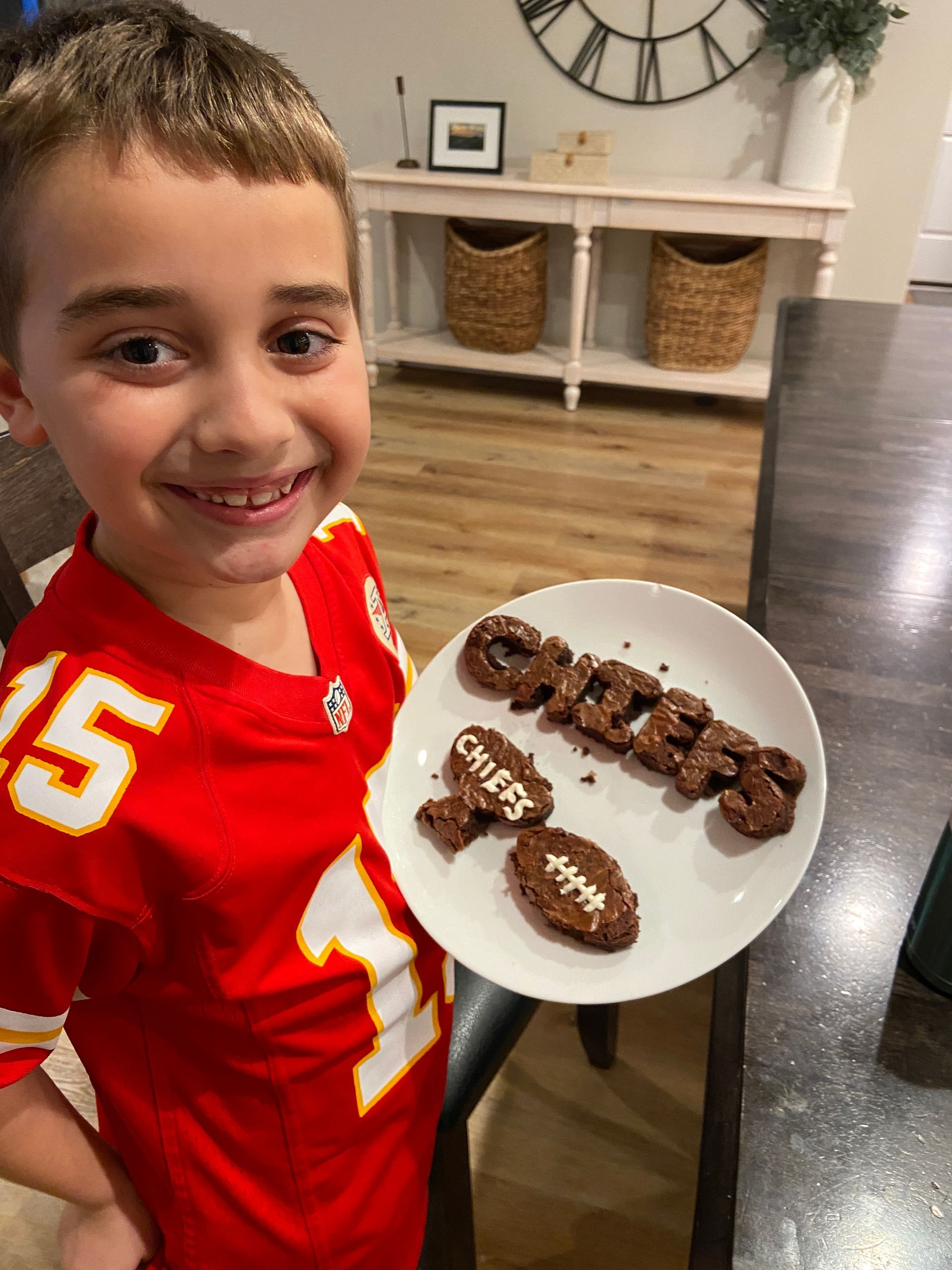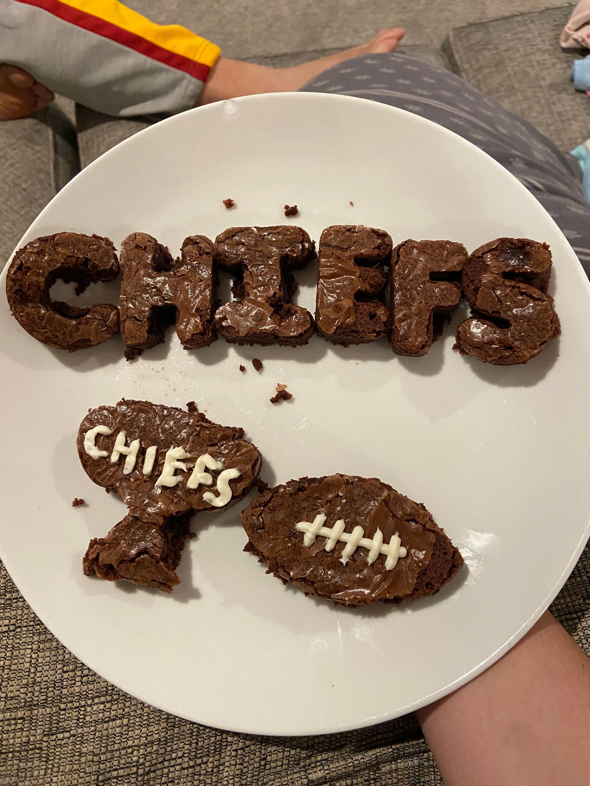 We had fun watching the Super Bowl as a family. We made brownies and I cut out chiefs. It was a good game and we let Grant stay up way past his bedtime so we could watch the whole thing, even the overtime. Chiefs won so Grant was very happy!