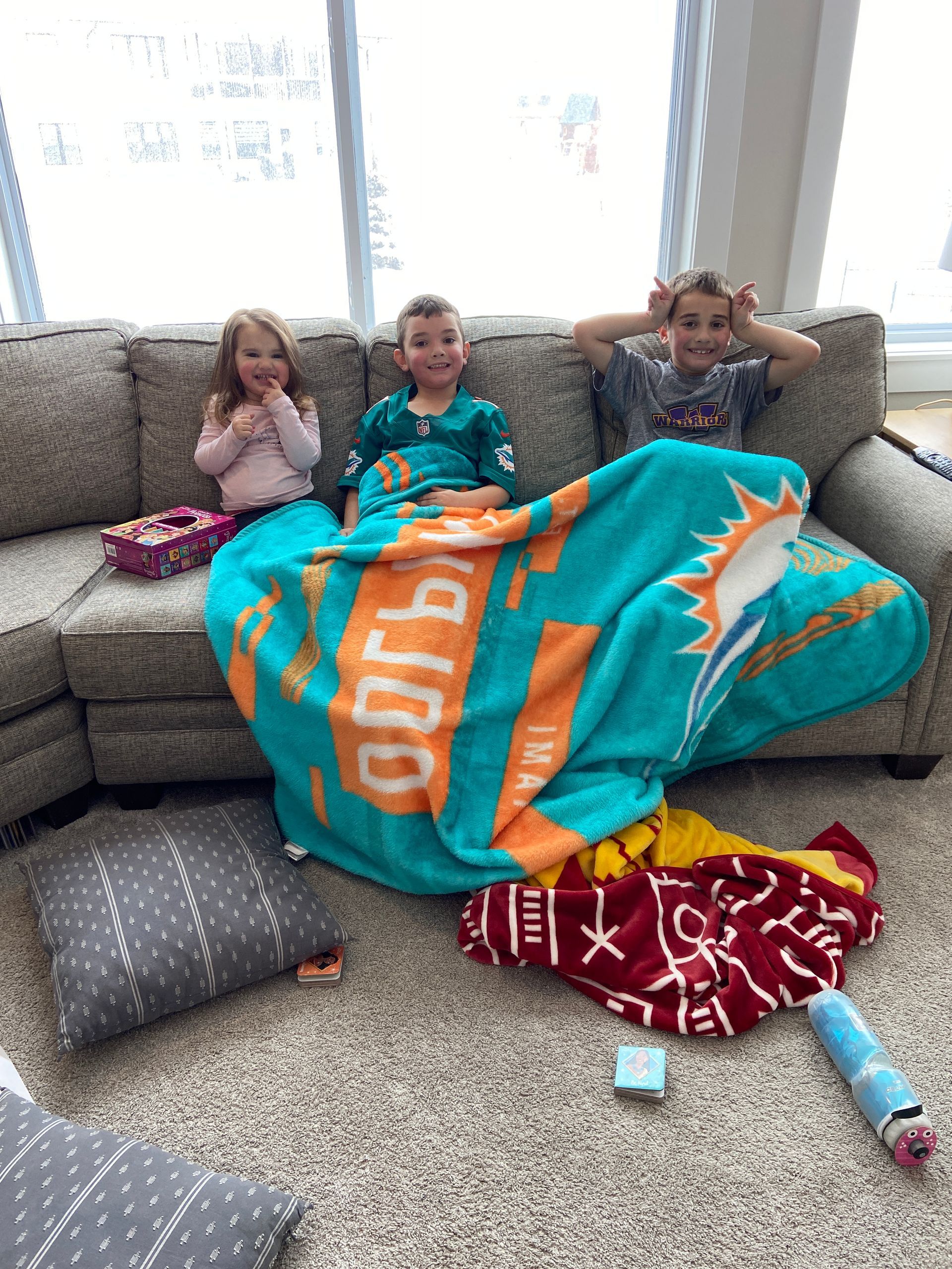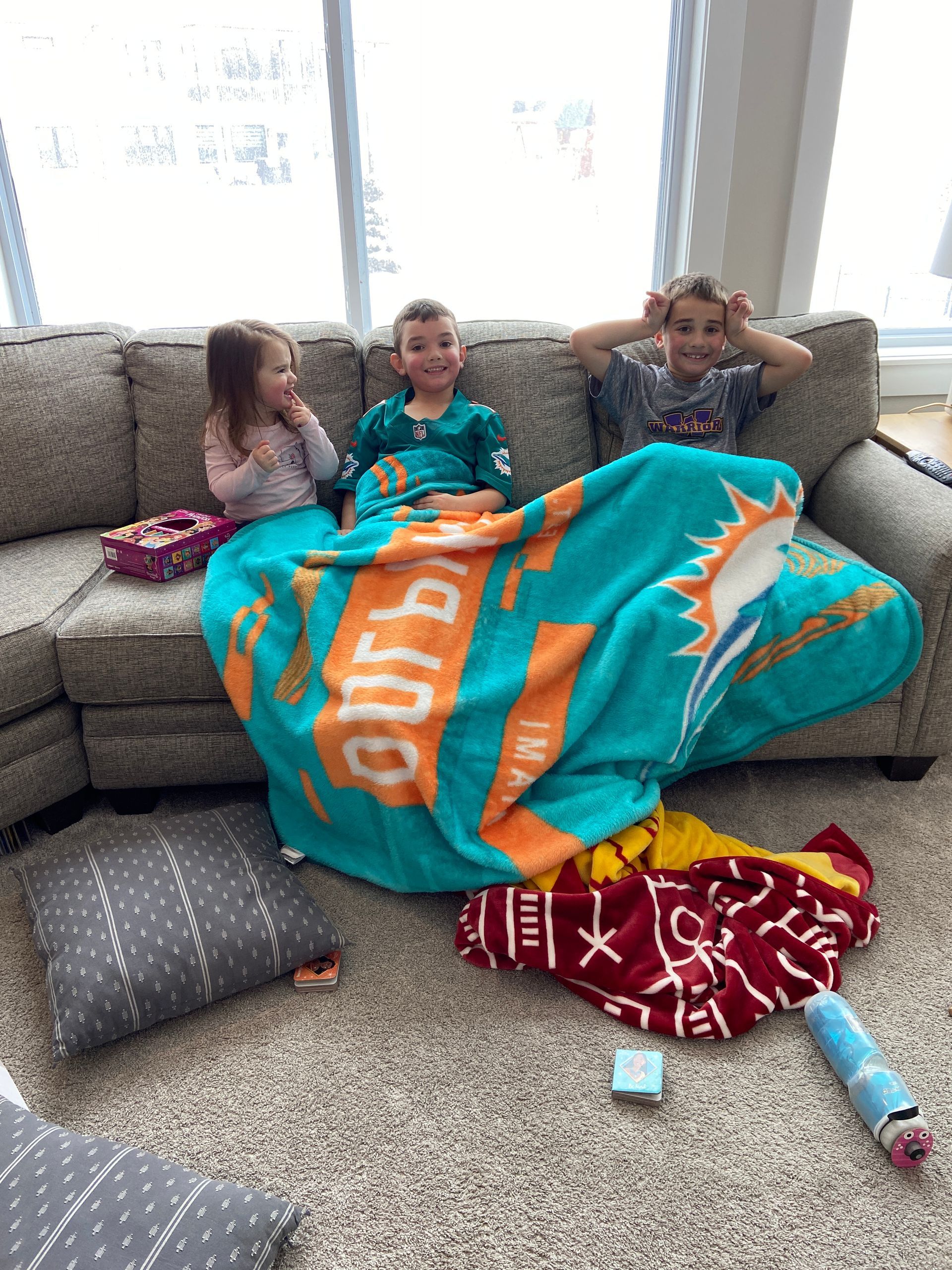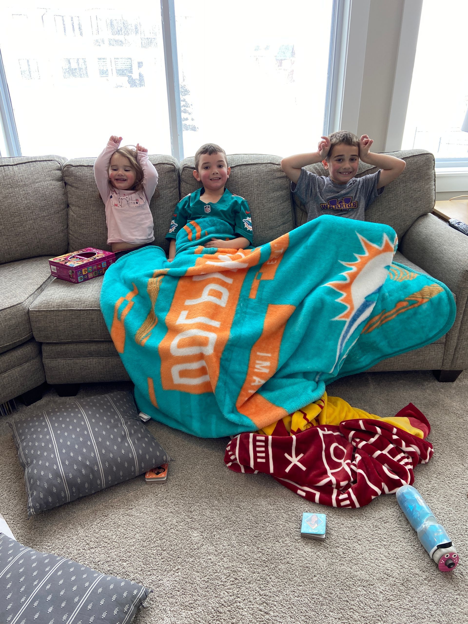 I caught the kids all sharing a blanket together and being silly! Claire just loves her brothers. She does not want to be left out. If we mention leaving she will run to the door and put on her shoes and say "I wanna go! I wanna go!".