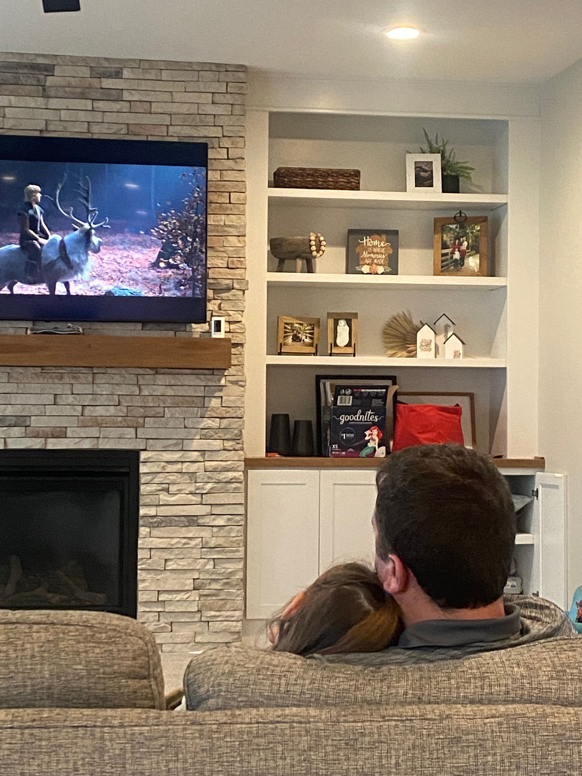 Claire and Dad cuddling watching Elsa or Frozen together. Claire always likes to cuddle a little after nap. She needs some time to wake up before playing and we love this time.