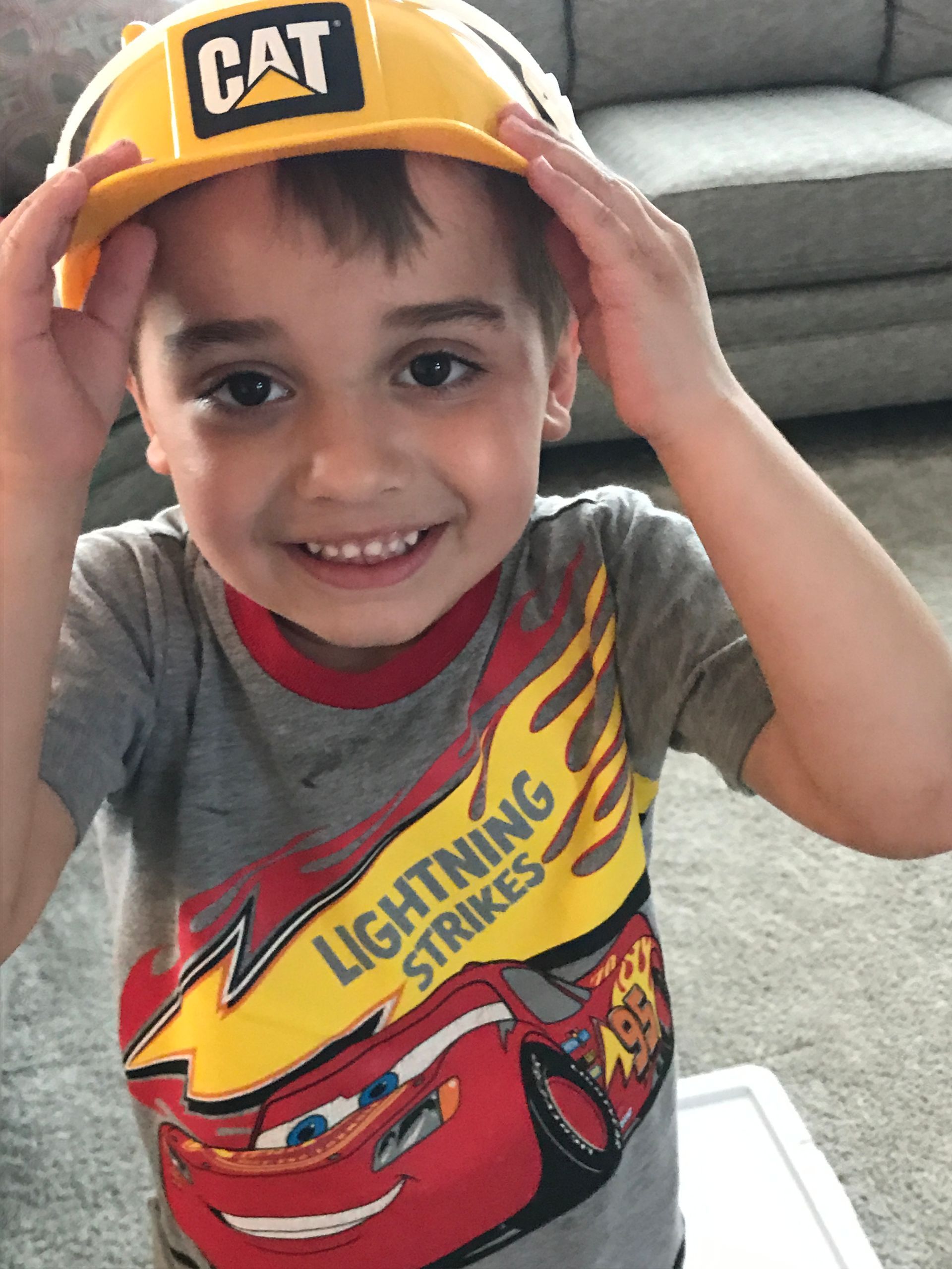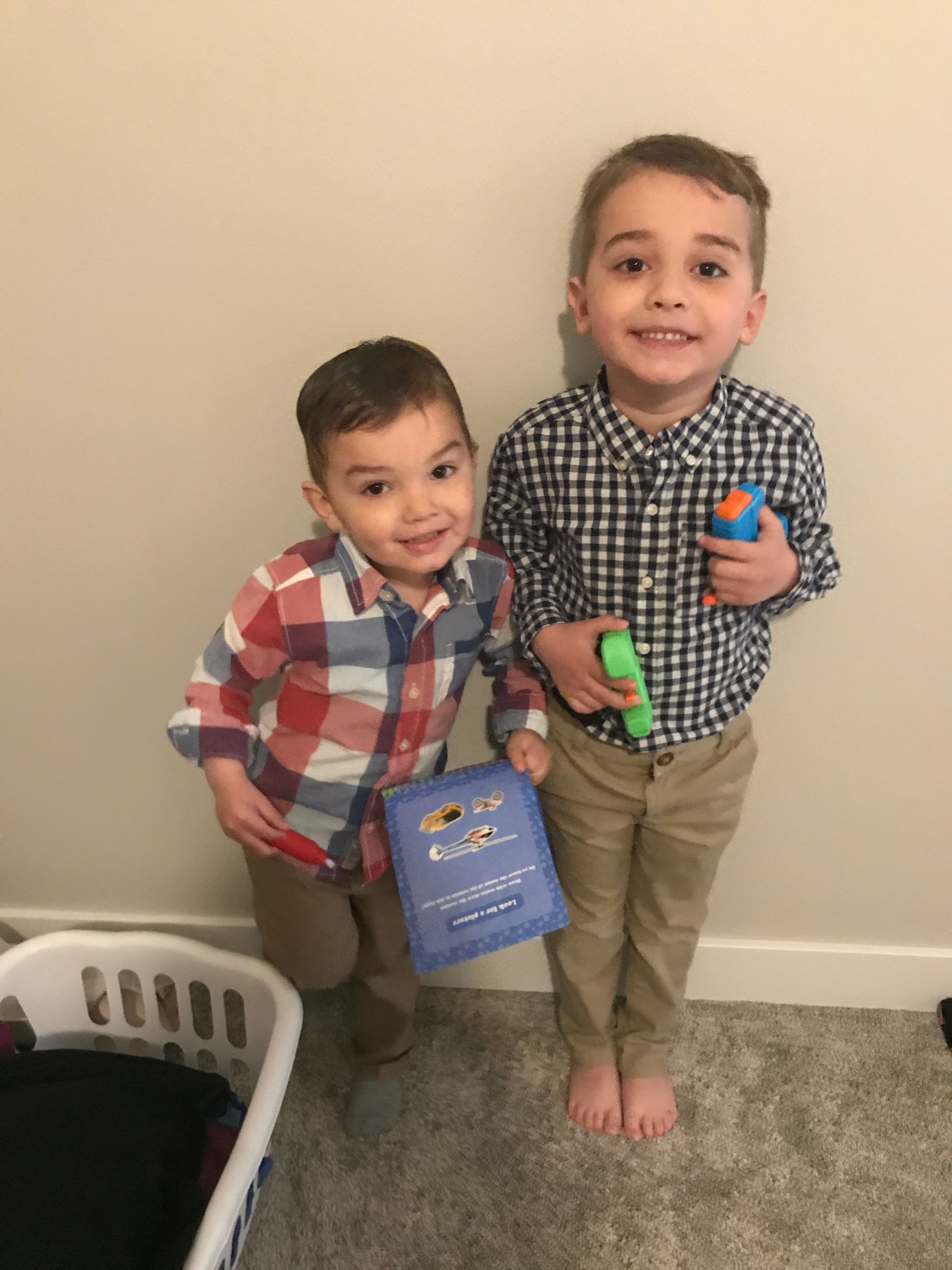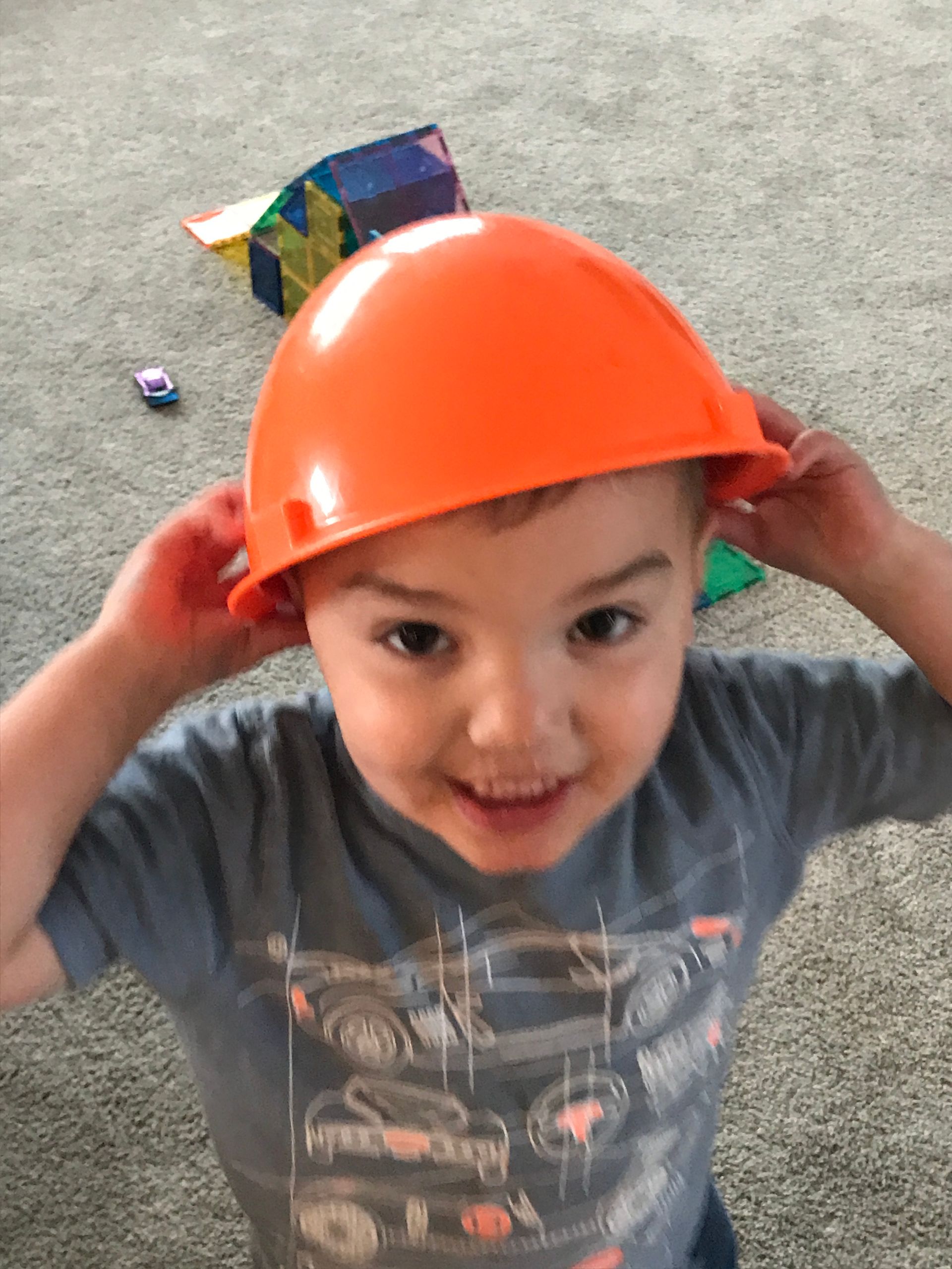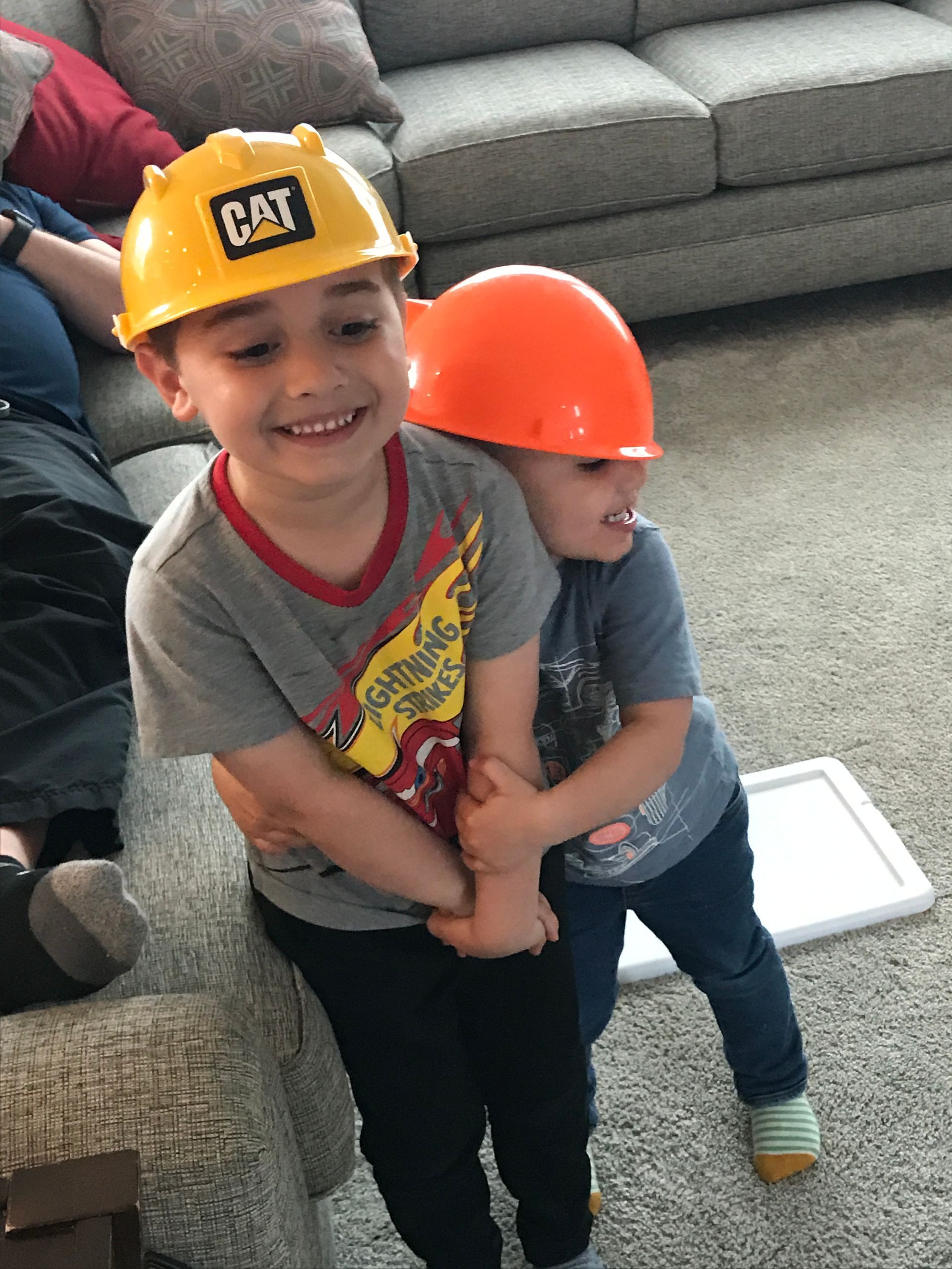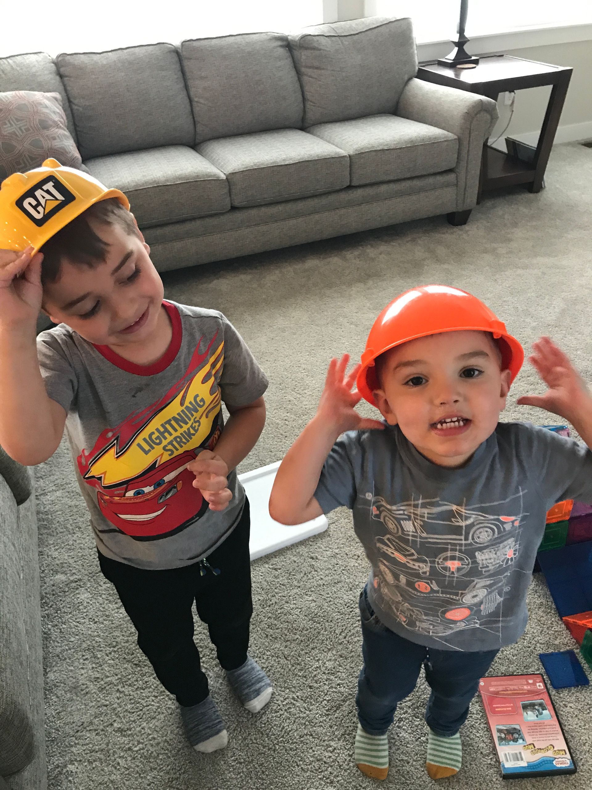 The boys love the construction hats and toys. They will go around and find things to fix for us in the basement!