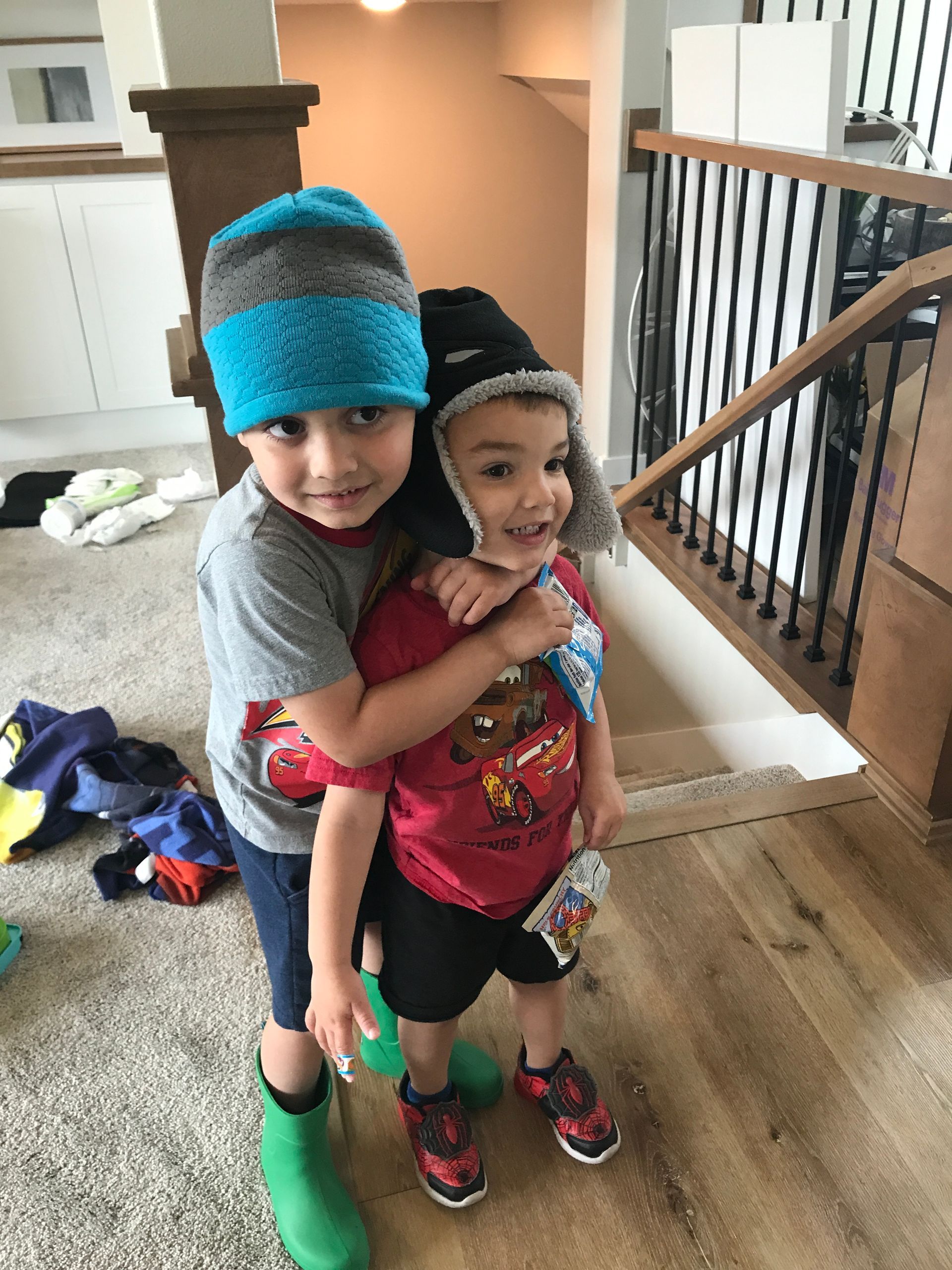 The boys found their winter hats and boots and decided that is what they wanted to wear. I am sure they will change their mind once they step outside and feel how hot it is!