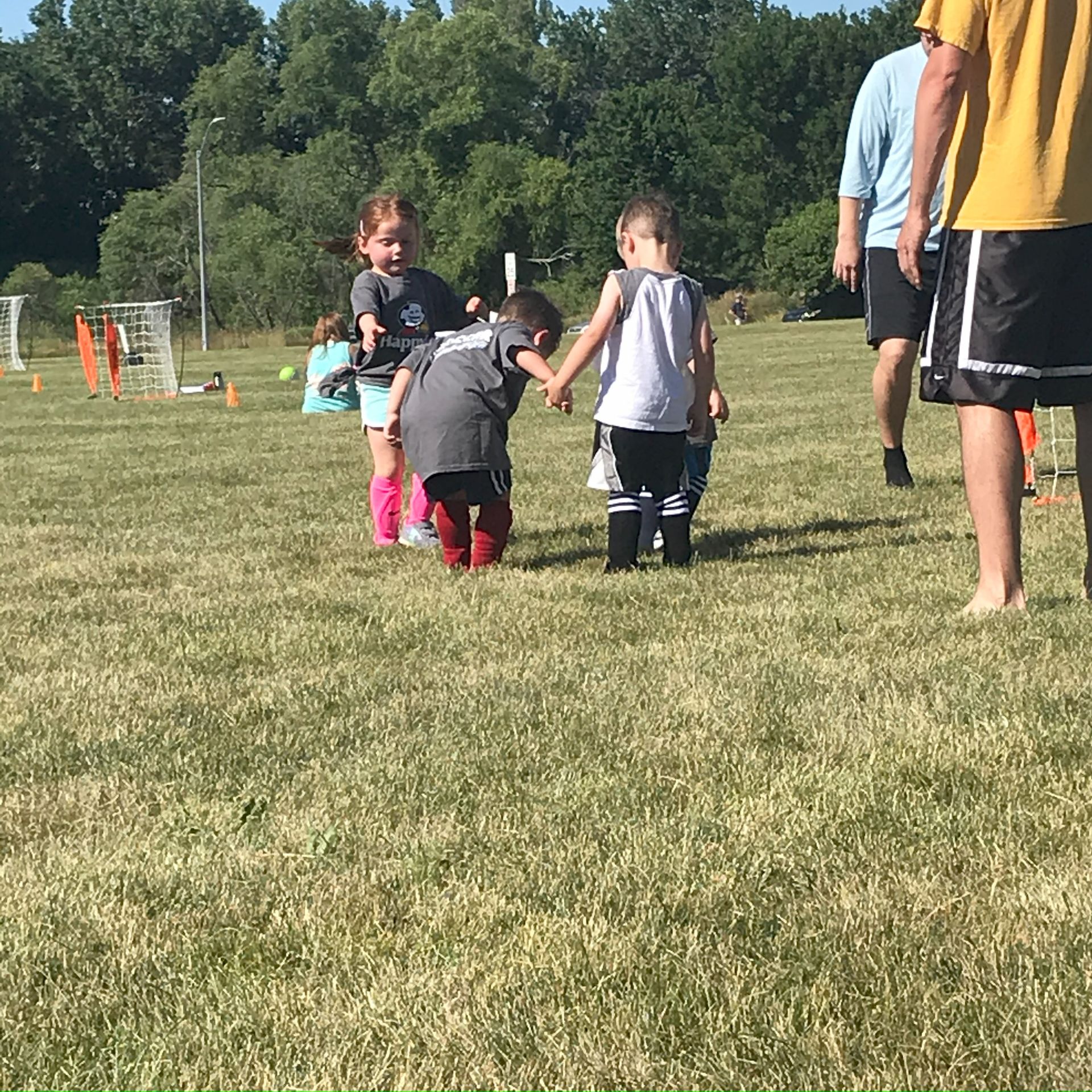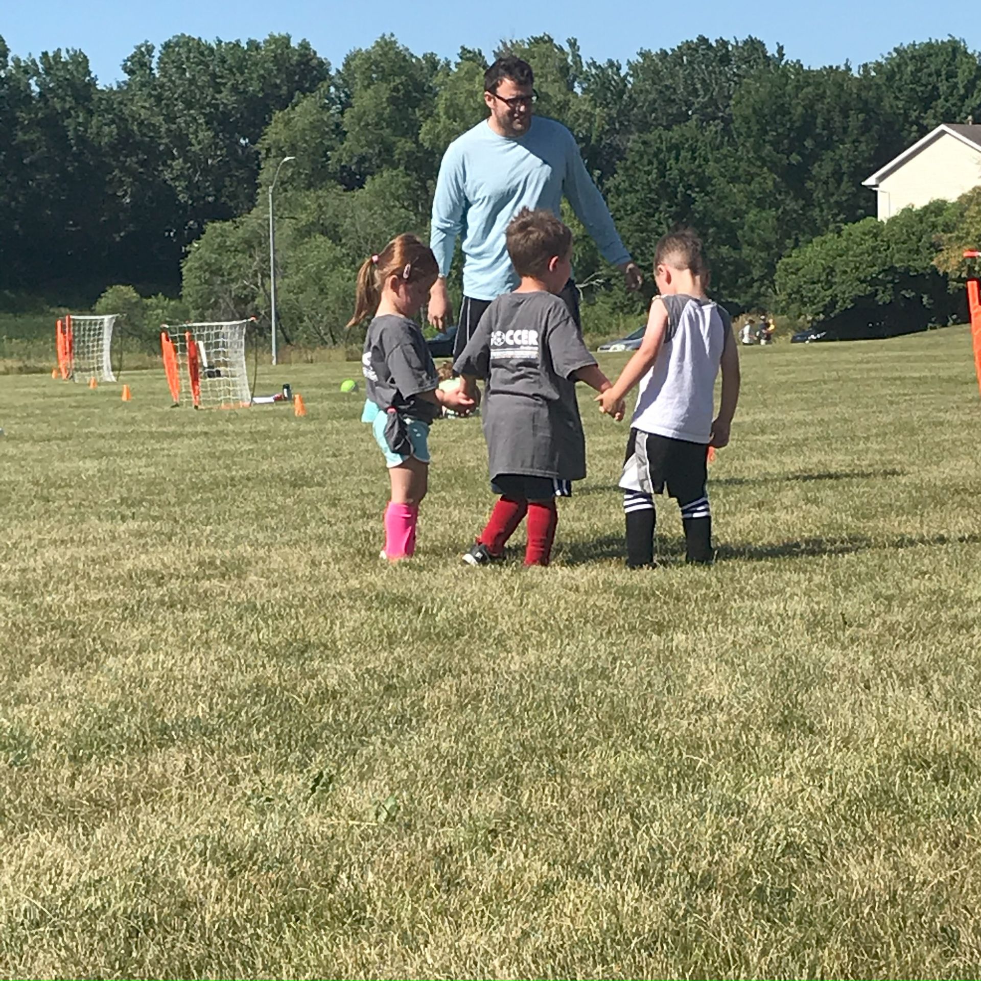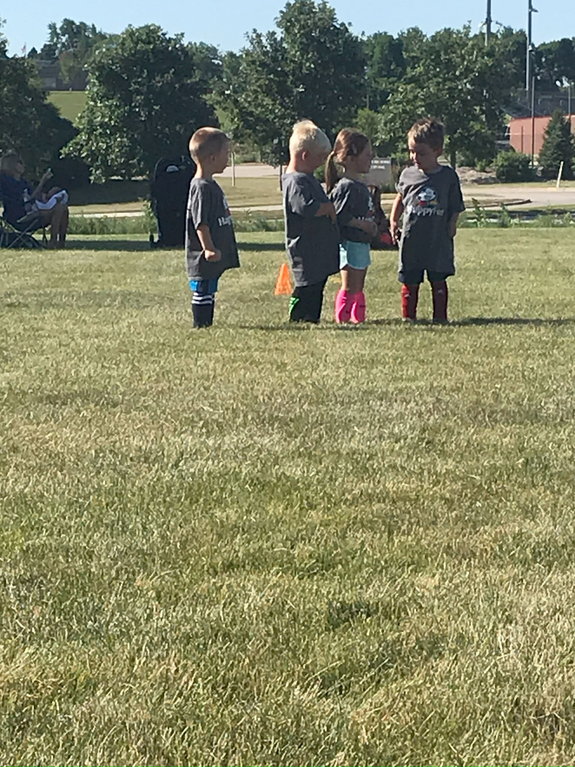 Grant is playing soccer with some of his friends from daycare. They are SO cute to watch. I wouldn't say much soccer is getting played though. At one point they were all holding hands and playing ring around the rosie. It was the funniest thing to watch!