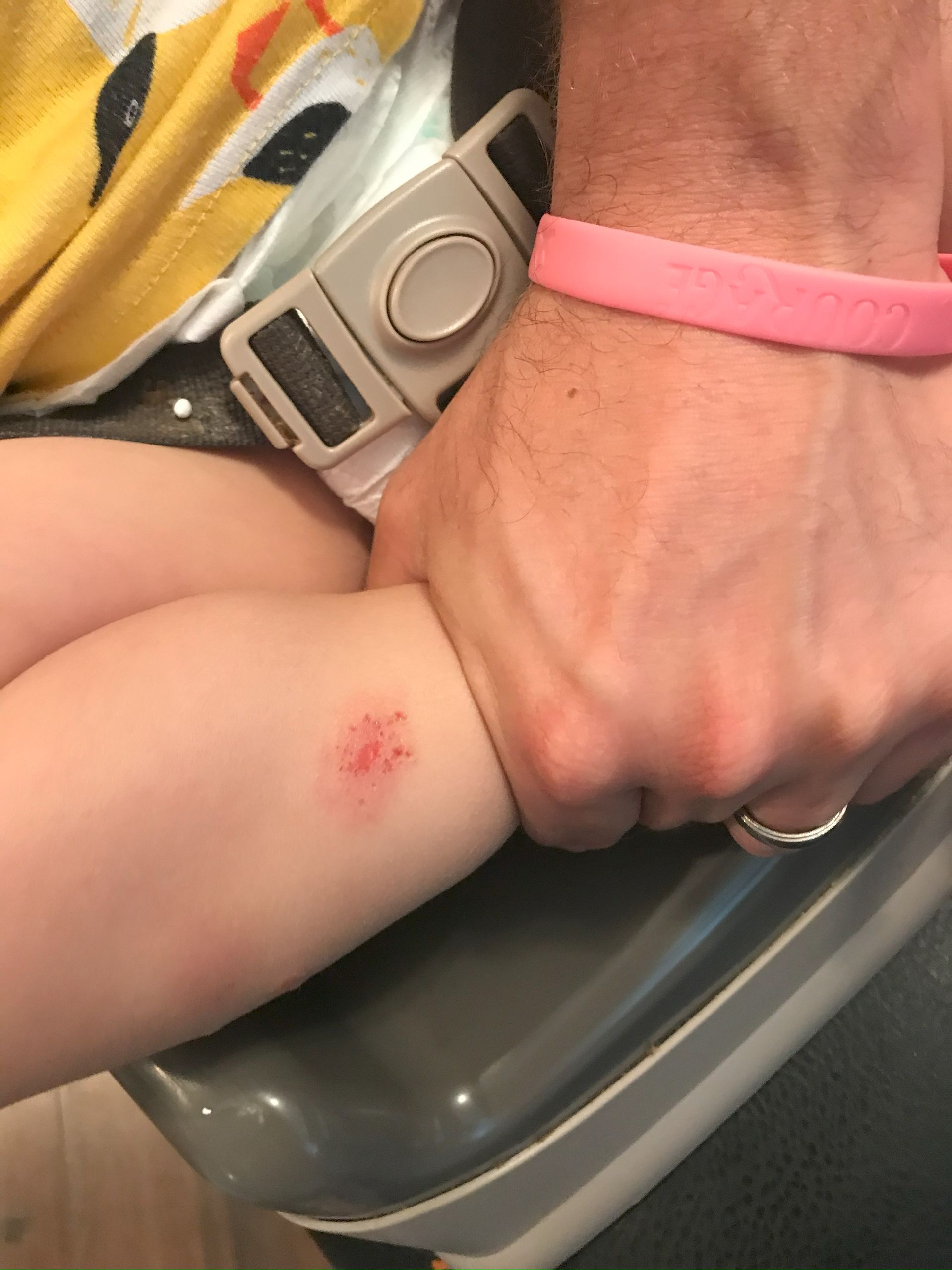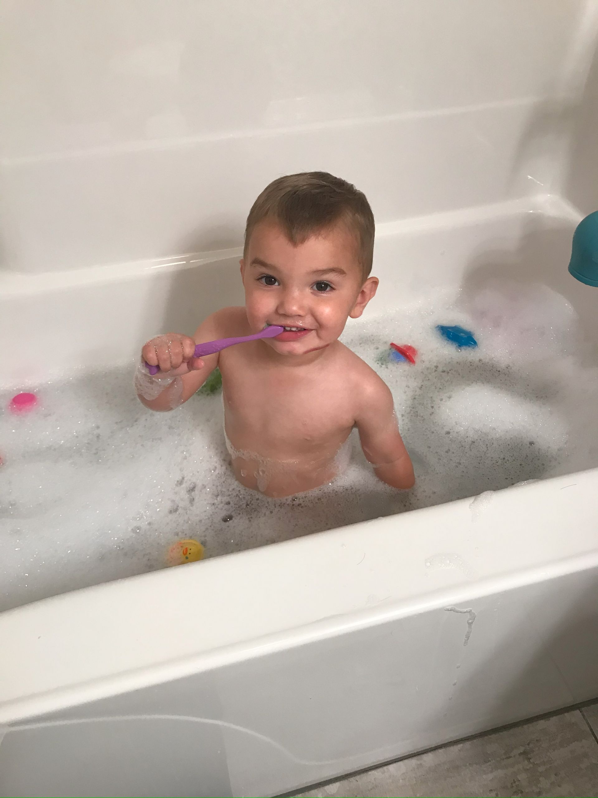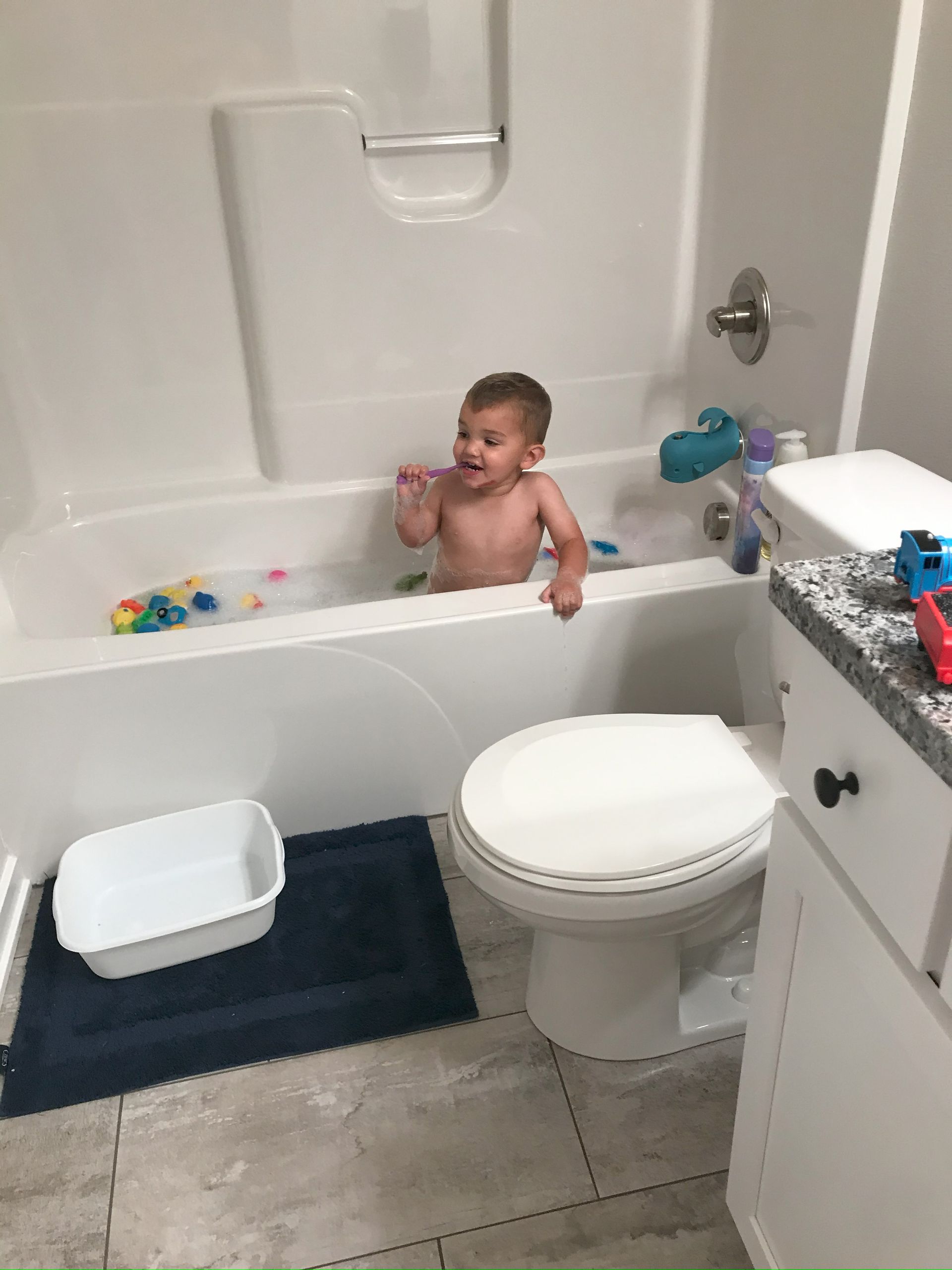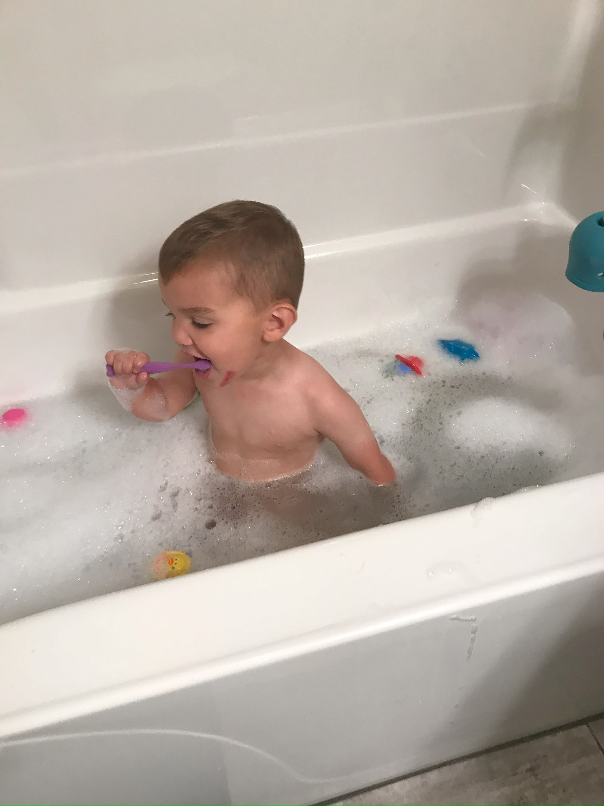 I've been trying to brush teeth while they are in the bath just to speed things up once bath is done. Bedtime is taking a lot of time so we will see if it works. You can also see a spot where Blake fell again.