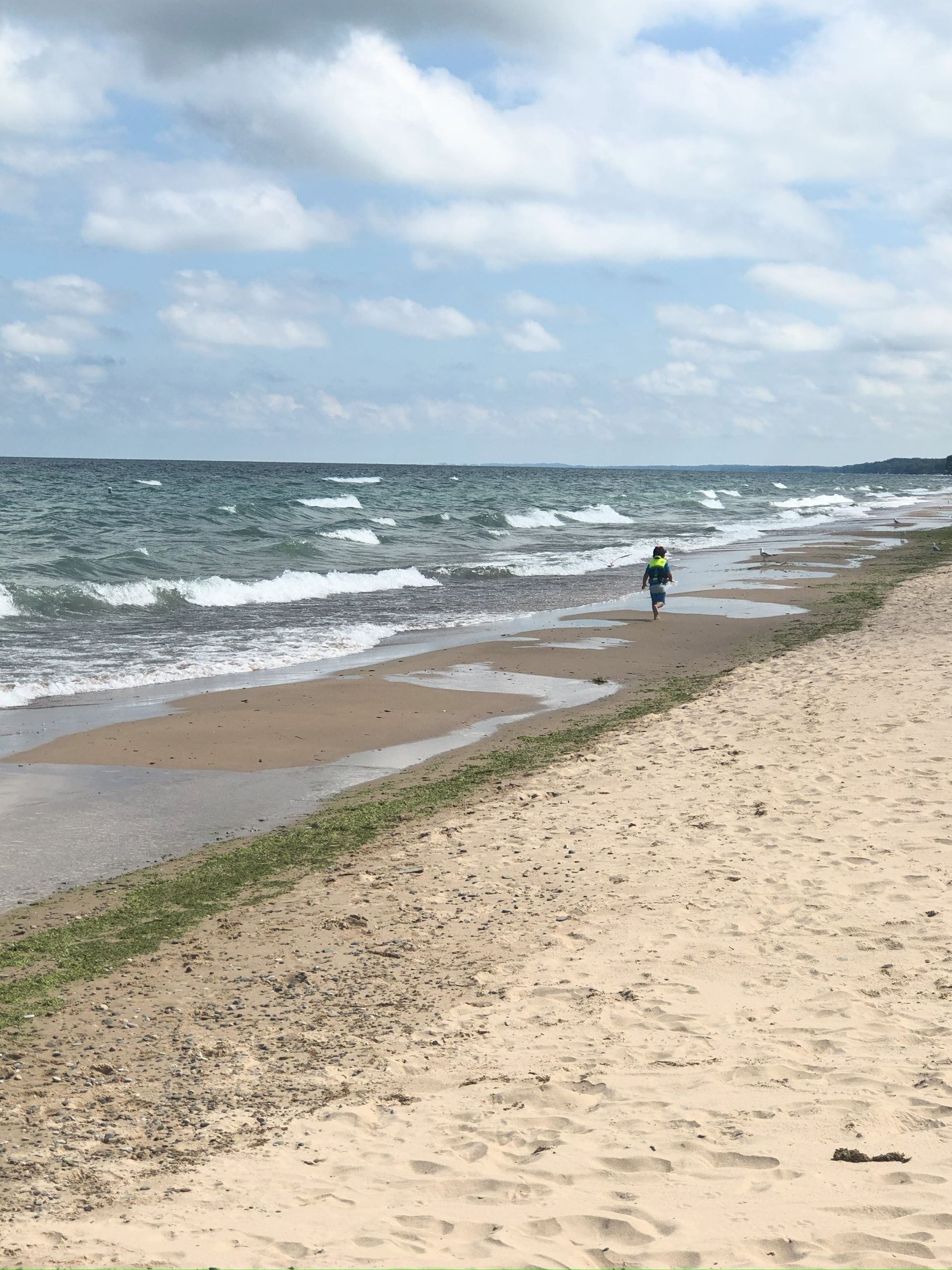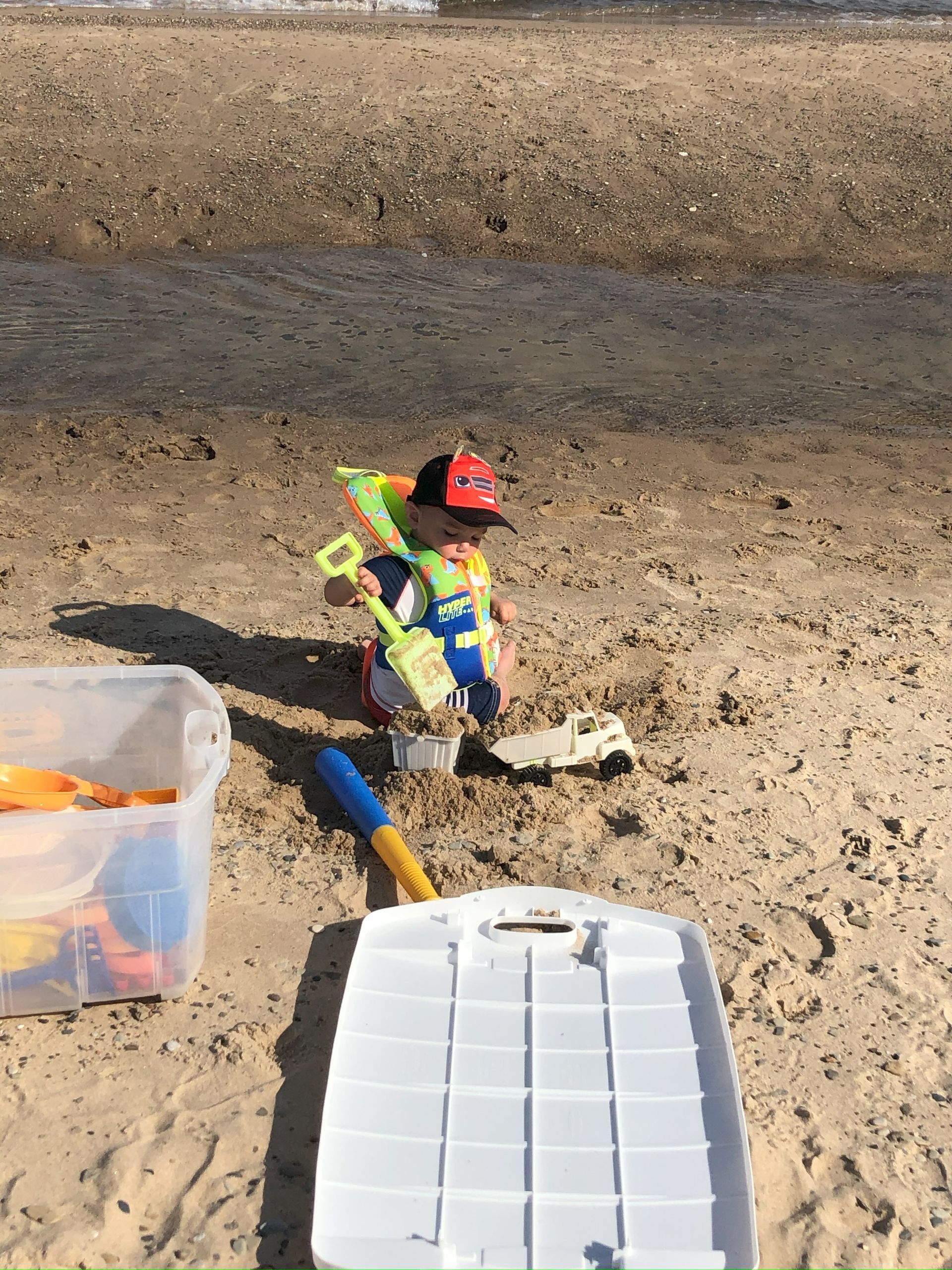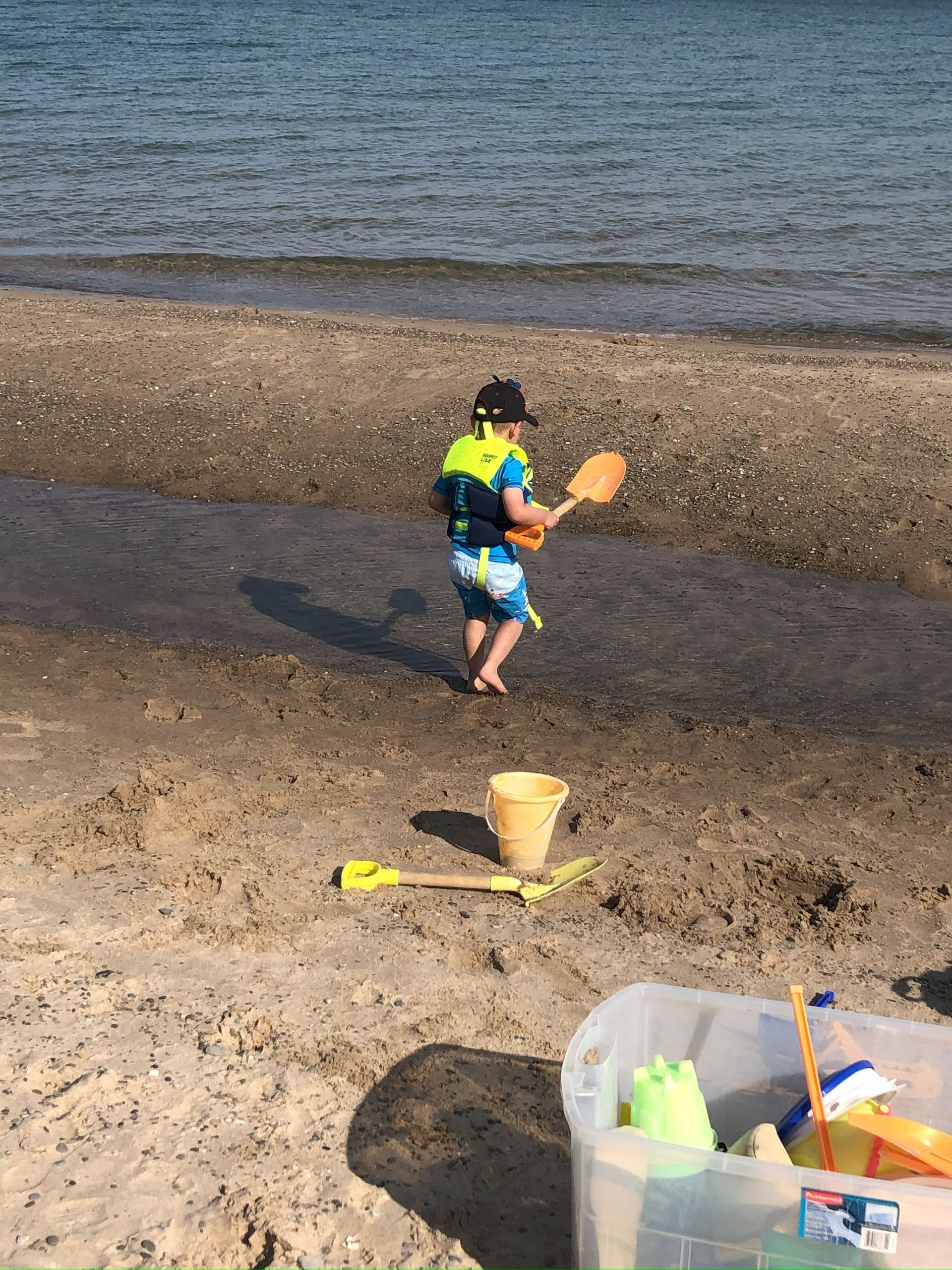 We made it to the big lake! That is what Grant calls Lake Michigan. It was a fun but exhausting week. We stayed at the bus spot which was nice to have our own space for naps and early wake ups. The weather was amazing though and we loved the early morning time at the beach. We had some lunches at Aunt Nicki's and the boys loved her "spicy chips" or BBQ chips and the name has stuck. They did really well on the car ride especially with the long drive. Our car was packed to the brim. Makenna played with Grant a lot which was nice to keep him entertained. Uncle Mit dug a hole with Grant also. Uncle Jeff took Grant fishing. He even caught a few fish! These boys are busy so we had to keep them active!