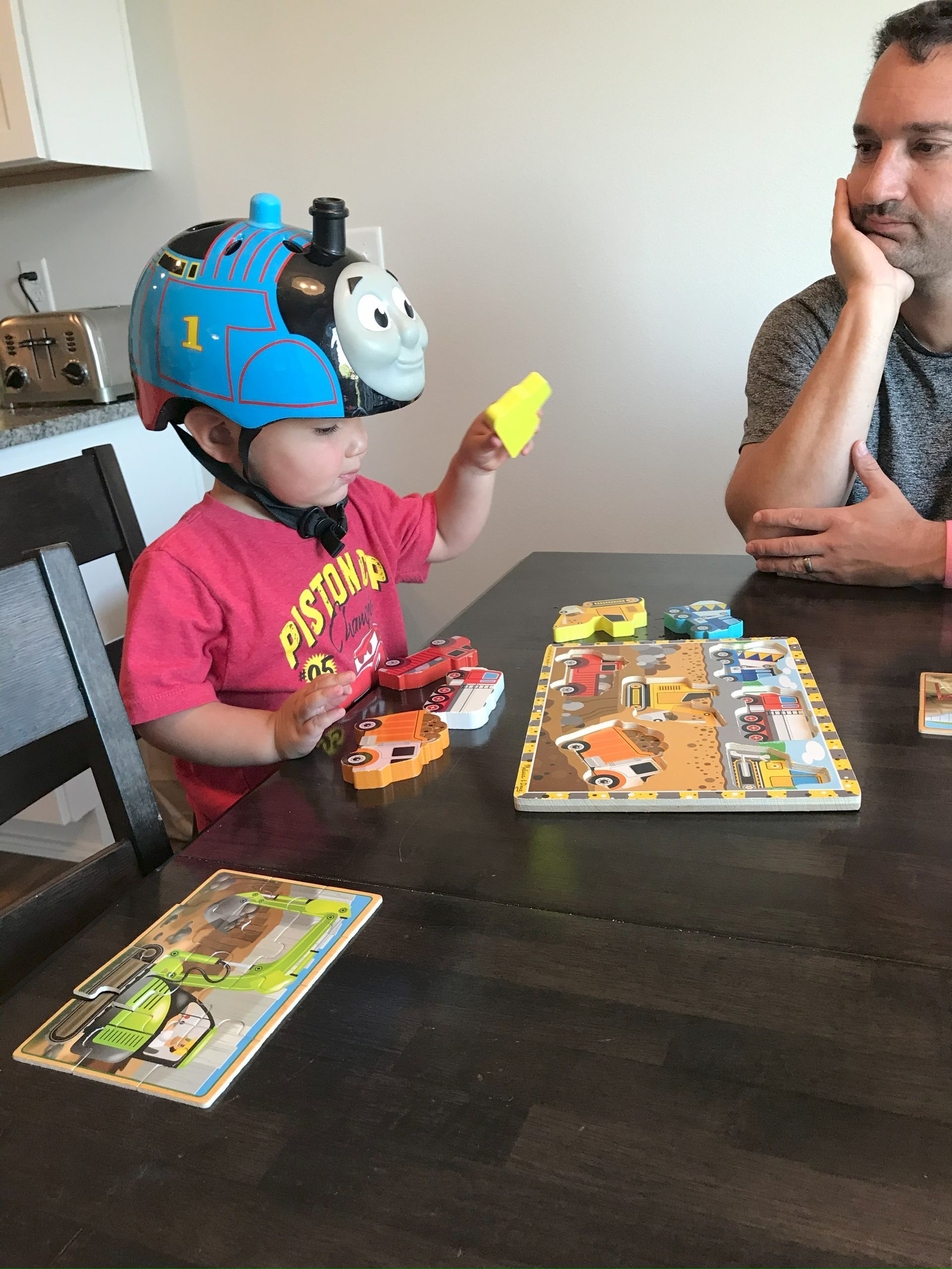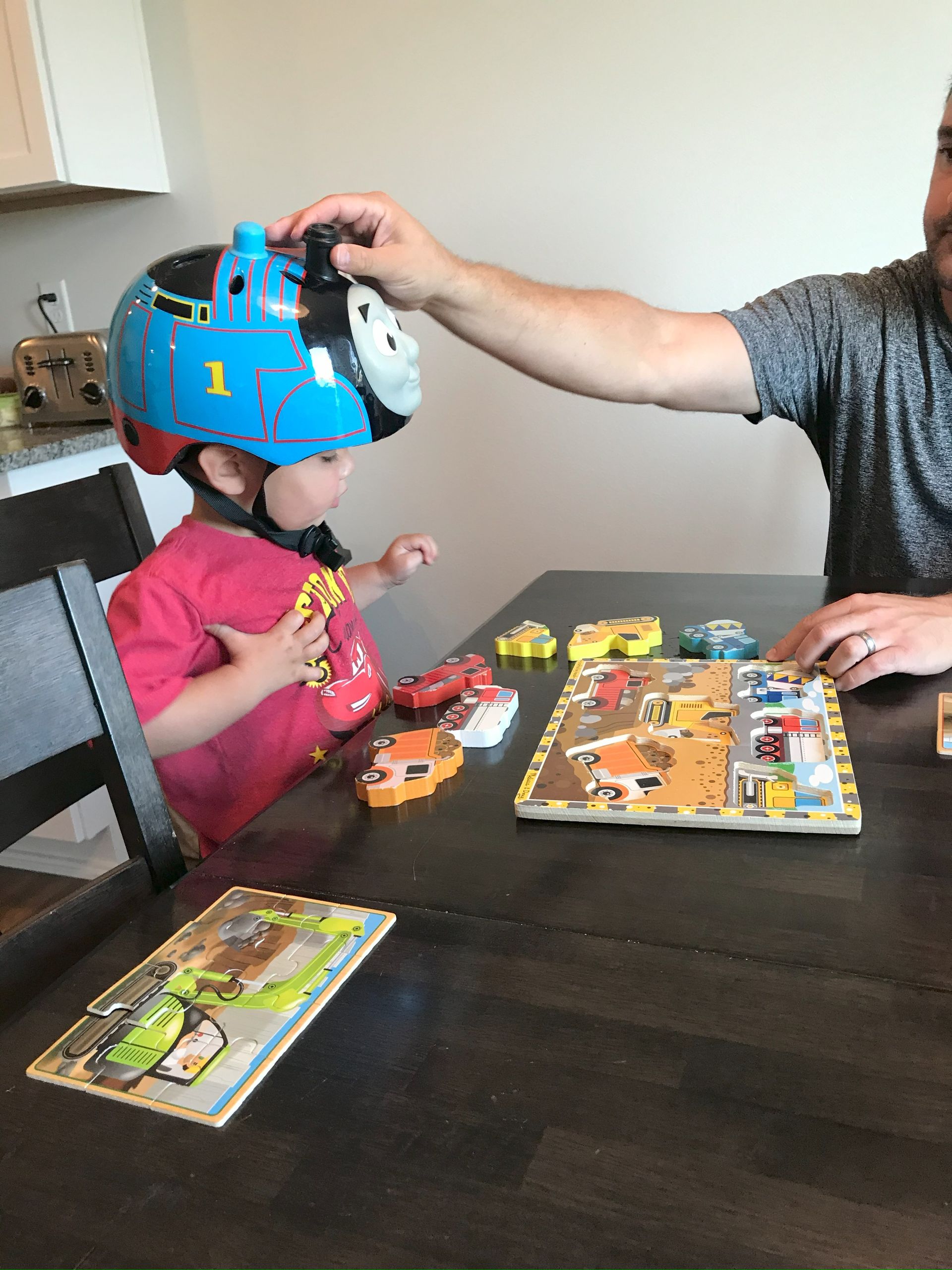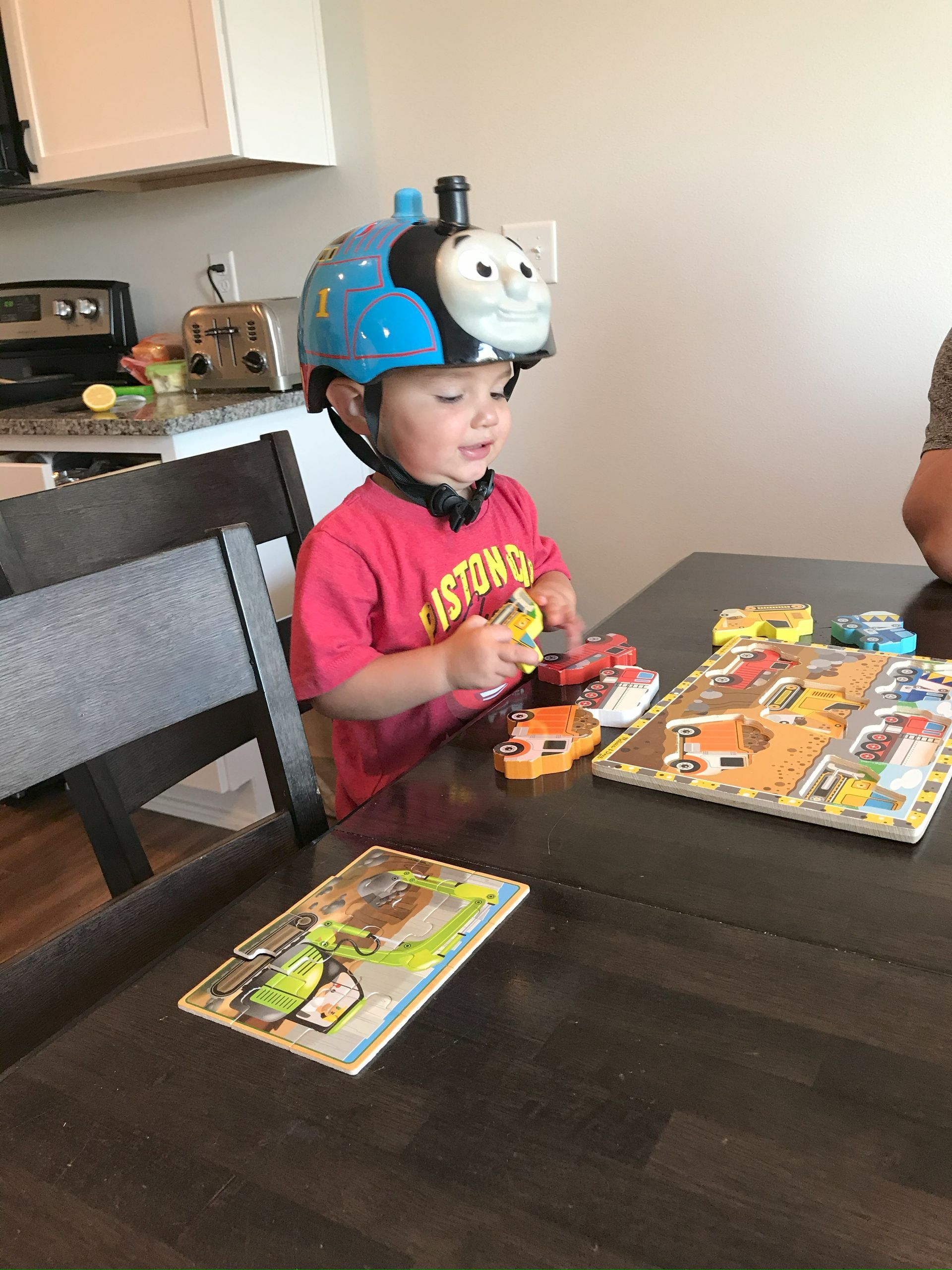 Blake still loves to wear his Thomas helmet and we don't steer him away from it because his head needs all the protection it can get. He is just such a clumsy kid.